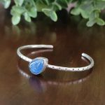 Oxidized sterling silver is twisted, wrapped, formed and soldered to create this bangle. It is set with three rose cut tanzanite stones. This bangle measures approx 2.5″ across and is approx 1/4″ wide. This item is one of a kind and ready to ship.