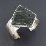 The larger stone is turquoise in bronze. It is a mix of both turquoise and bronze all rolled into one stone. The smaller stone is sleeping beauty turquoise. Sterling silver and brass make up the cuff itself. The cuff is 5/8″” wide and is adjustable and fits most wrist sizes.