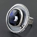 Sterling silver, orange calcite and labradorite create this statement necklace. It is oxidized to bring out the detail. The pendant itself measures approx 6″ long. It hangs from a part leather cord, which can be tied to adjust the length, and part handmade link chain. The total length is 29″ long. There is no rhyme or reason when I make these pieces. I just twist and bend the metal until I like what I see.