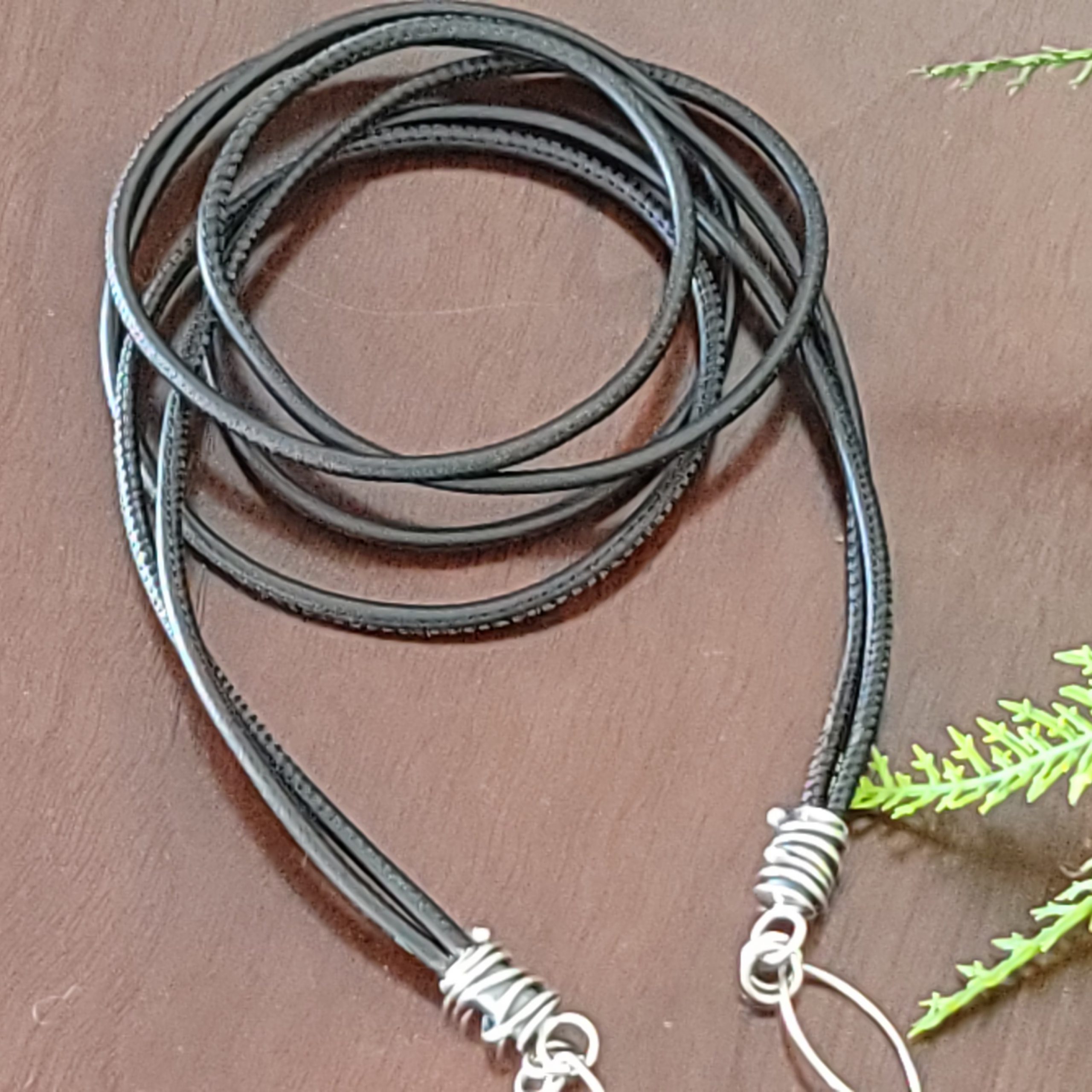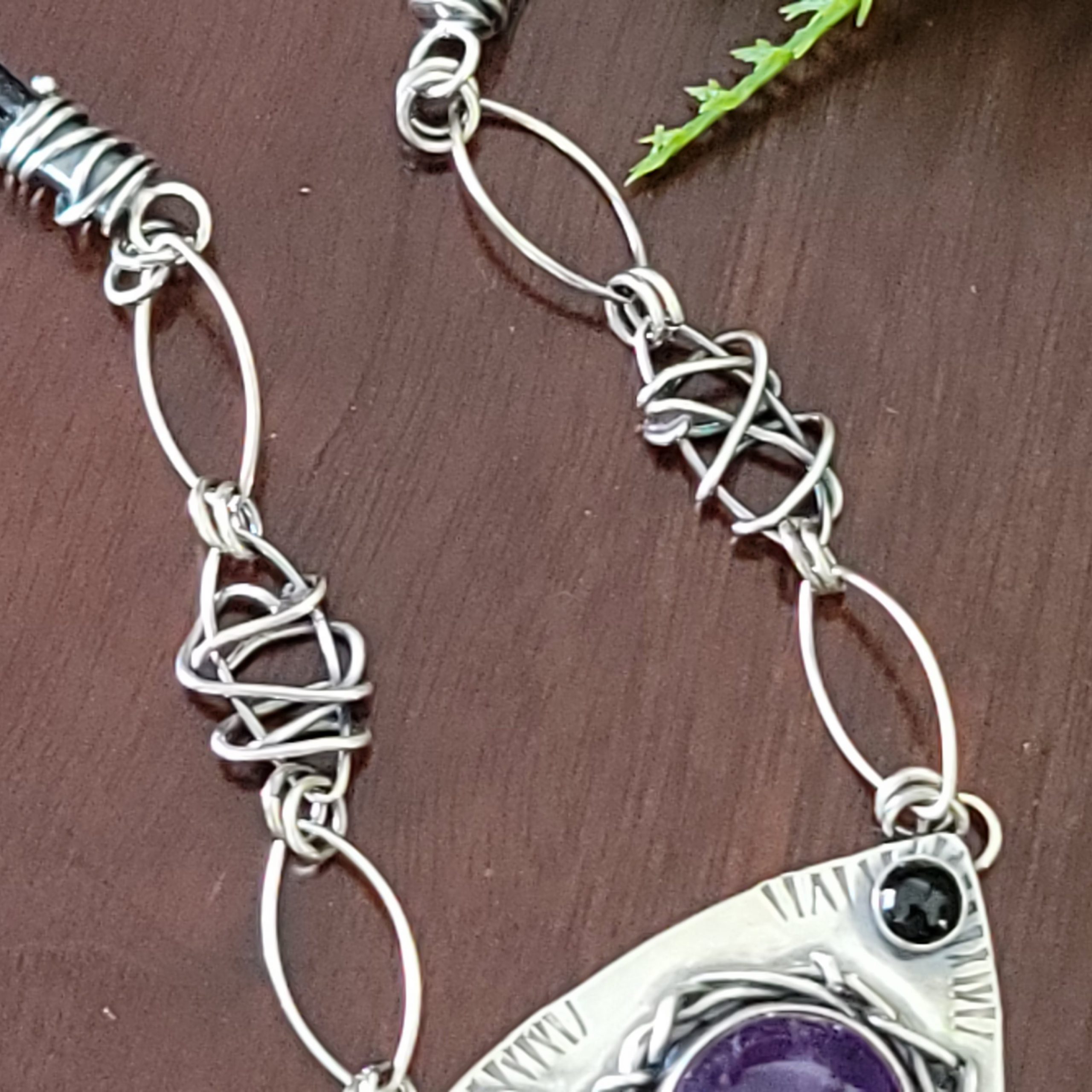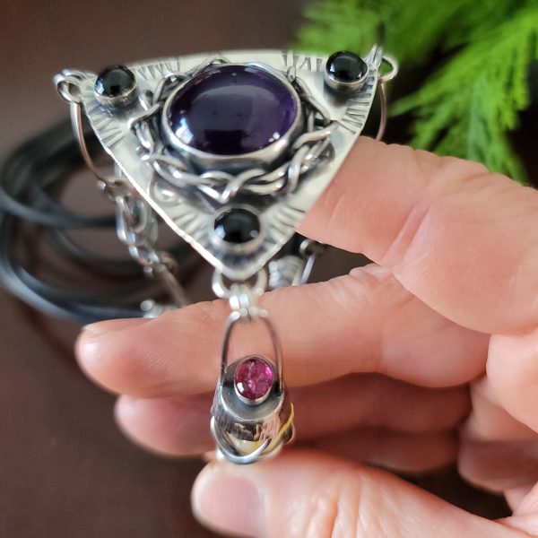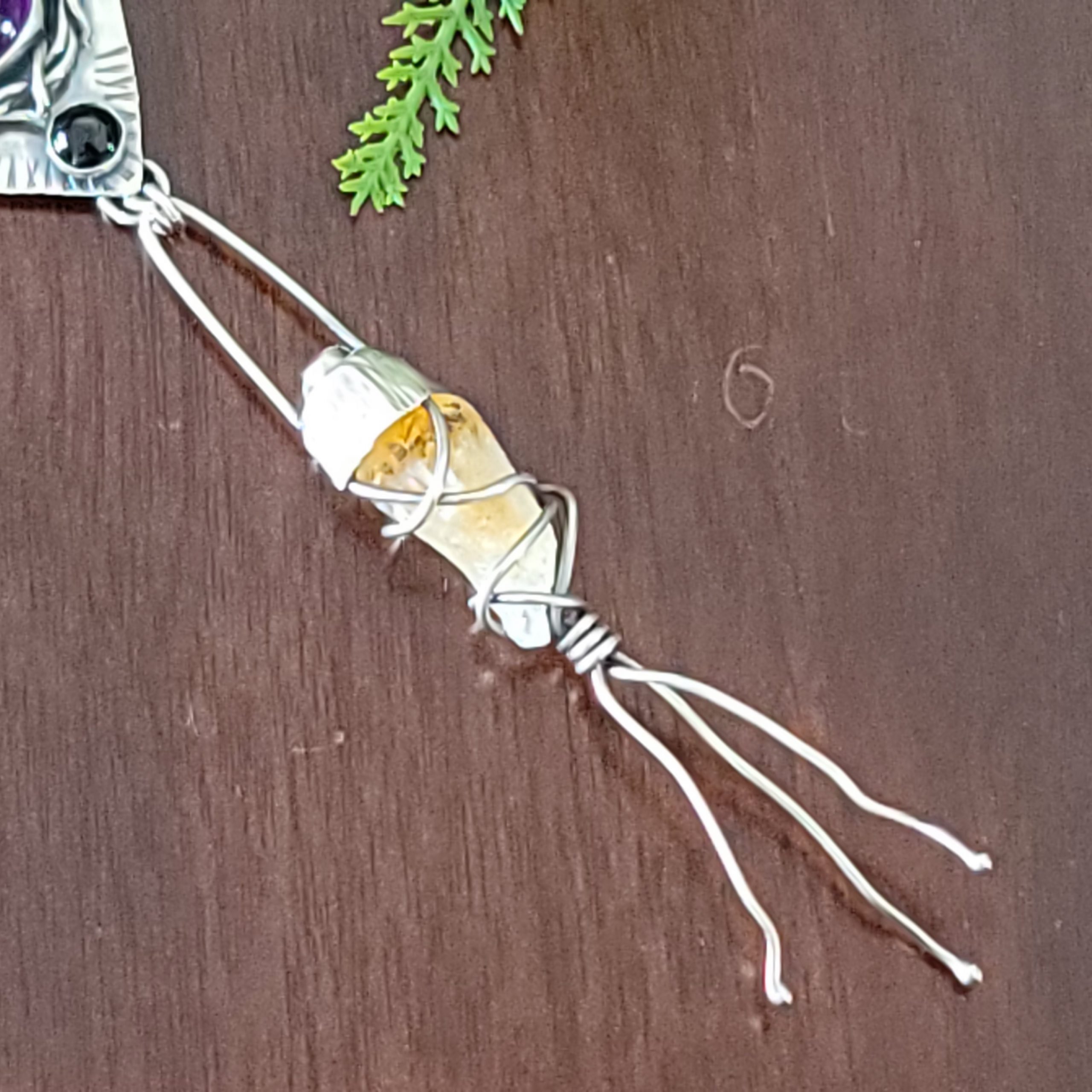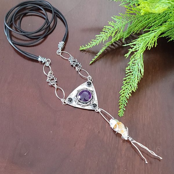 Sterling silver, amethyst, raw citrine, black onyx and tourmaline create this statement necklace. It is oxidized to bring out the detail.  The pendant itself measures approx 5″ long. It hangs from a part leather cord, which can be tied to adjust the length, and part handmade link chain. The total length is 28″ long. There is no rhyme or reason when I make these pieces. I just twist and bend the metal until I like what I see. Just like when a grapevine grows it twists and bends with no rhyme or reason, hence the name.