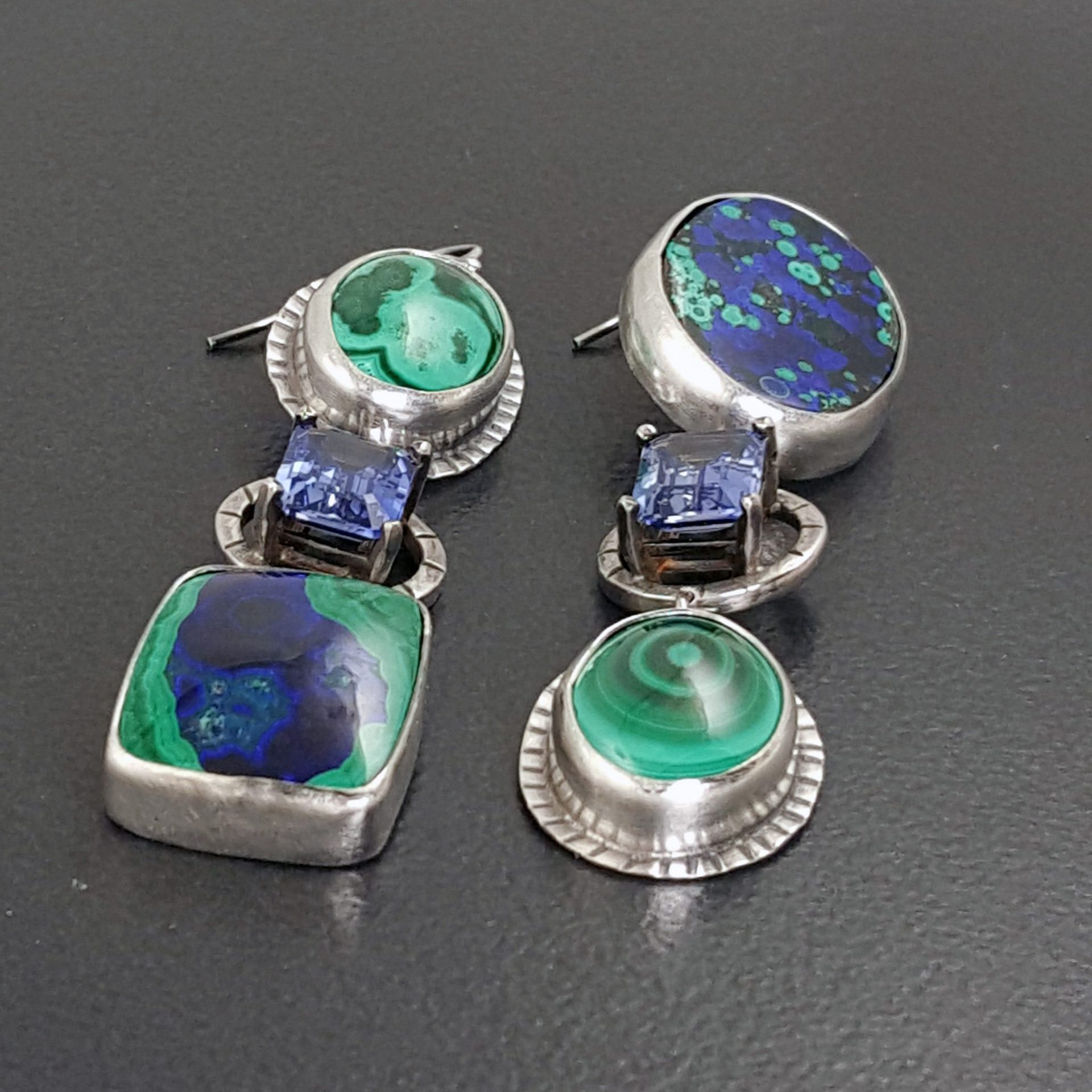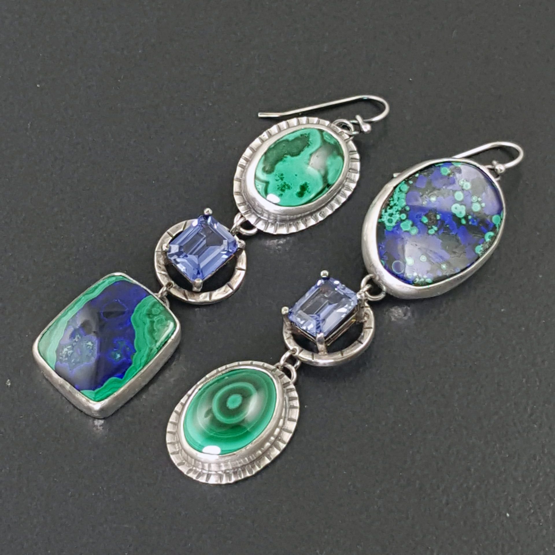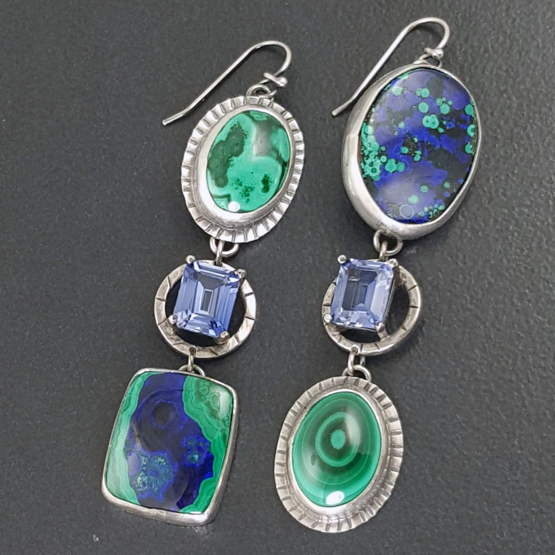 Make a statement in these beauties! Azurite malachite, malachite and blue faceted sapphires come together to create these earrings. Textured and oxidized sterling silver surround the stones. The earrings are approx 3.25″ long from the top of the ear wire to the bottom of the earring. They hang from sterling silver ear wires. These earrings are one of a kind and ready to ship.