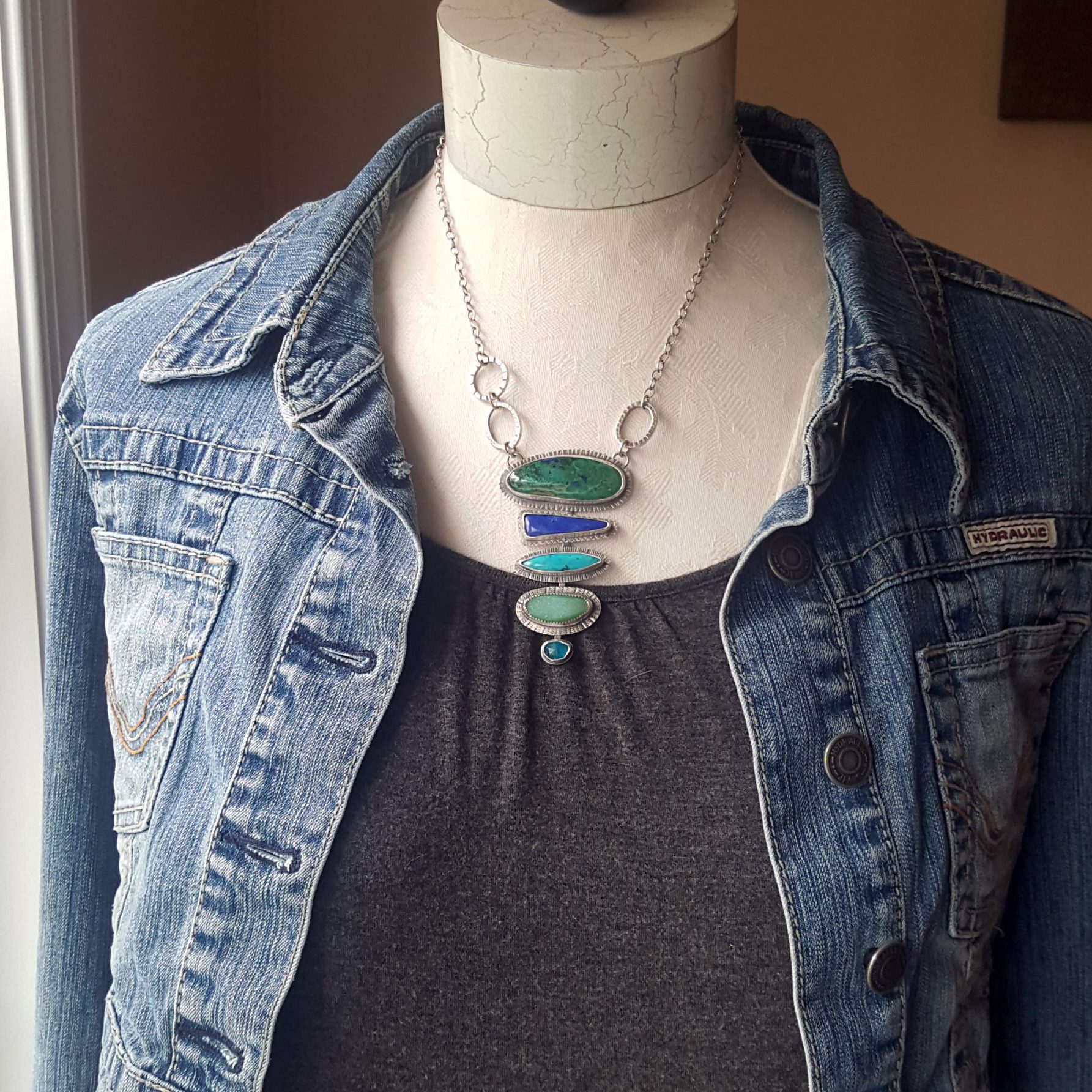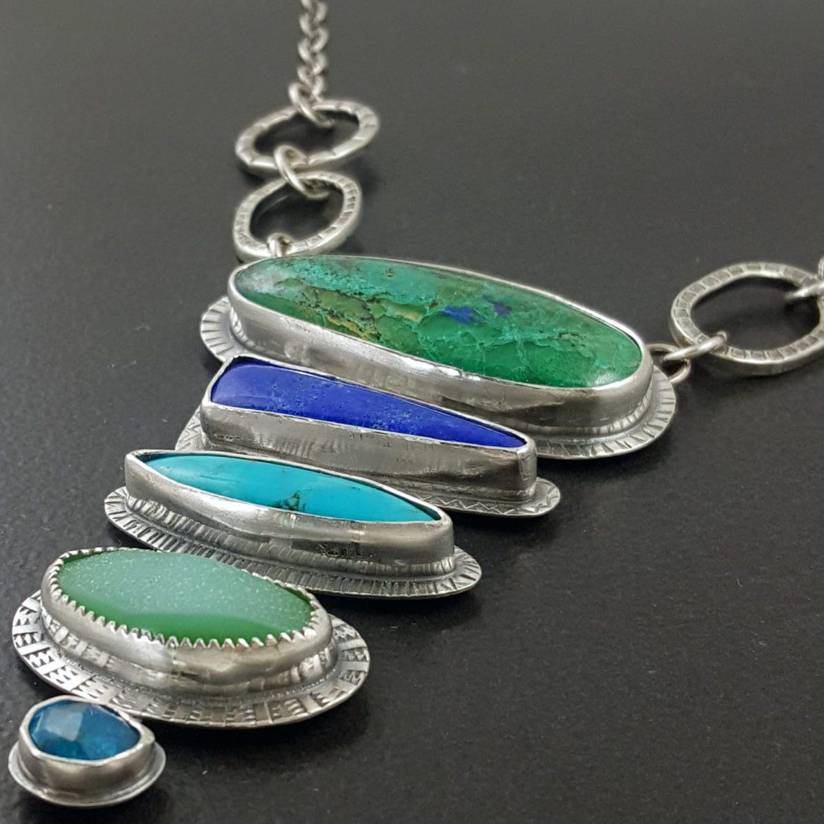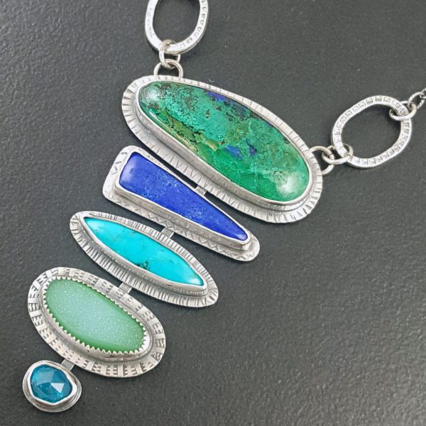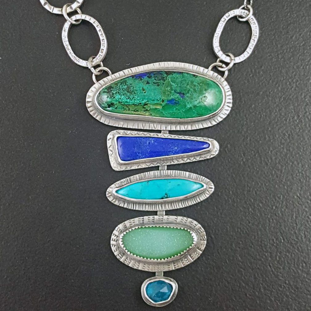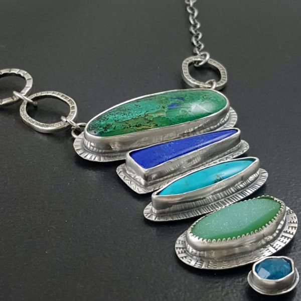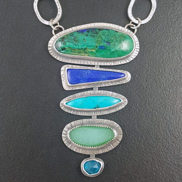 Stacked stone necklace of azurite malachite, lapis, turquoise, green druzy and rose cut apatite. Textured and oxidized sterling silver surround the stones. This pendant measures 2.75″ long and 1.75″ wide. It hangs from an 18″ chain that is adjustable due to the nature of the chain. This item is one of a kind and ready to ship.