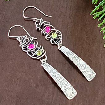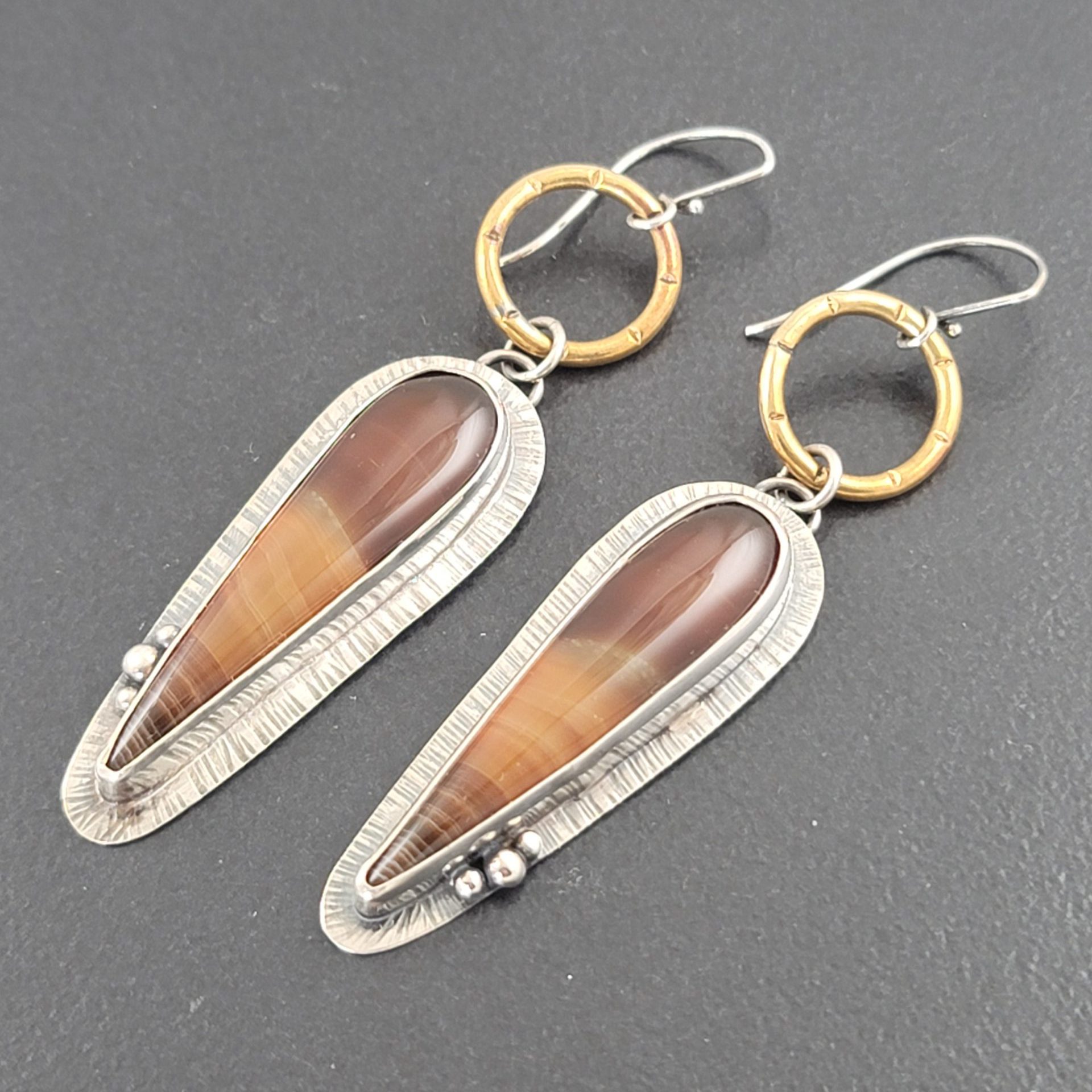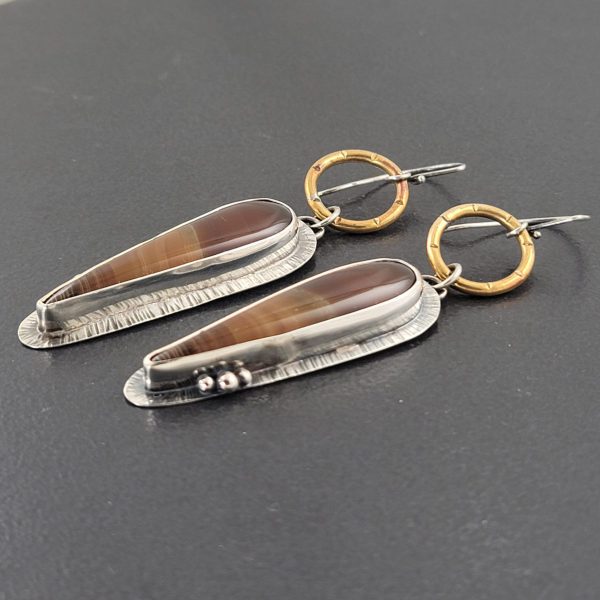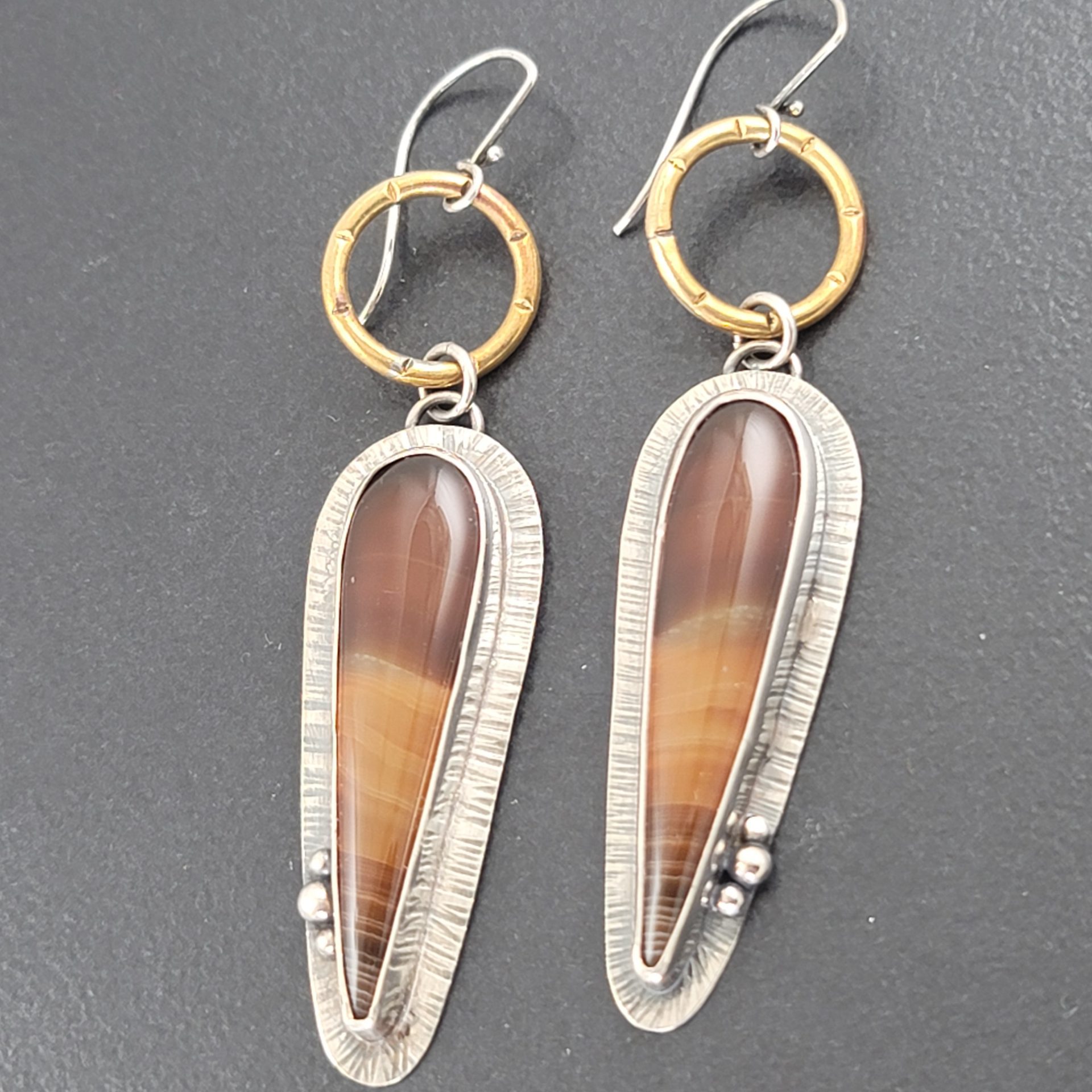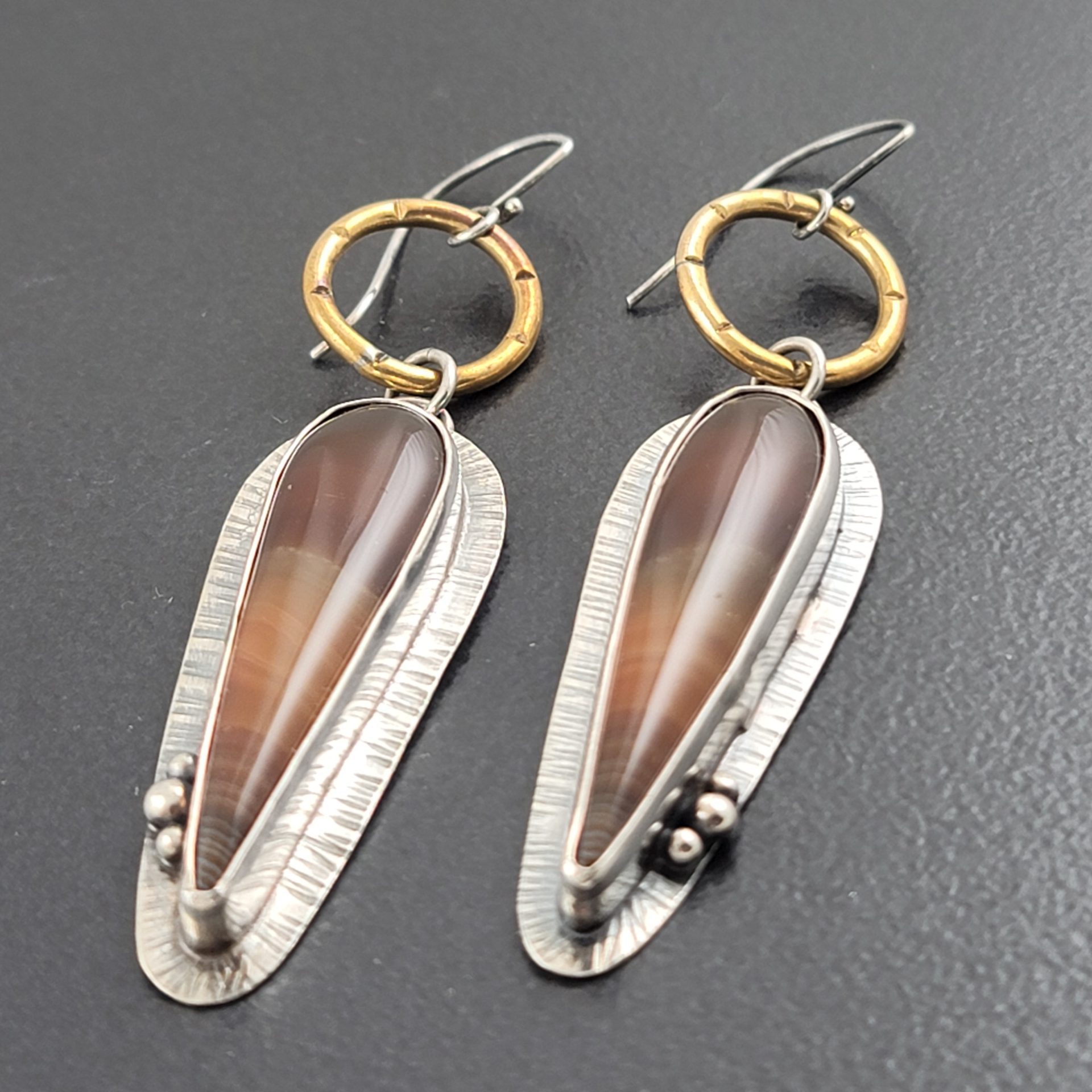 Banded Agate combined with oxidized sterling silver and brass. These mixed metal earrings are approx 3.25″ long from the top of the ear wire to the bottom of the earring. These are ready to ship.