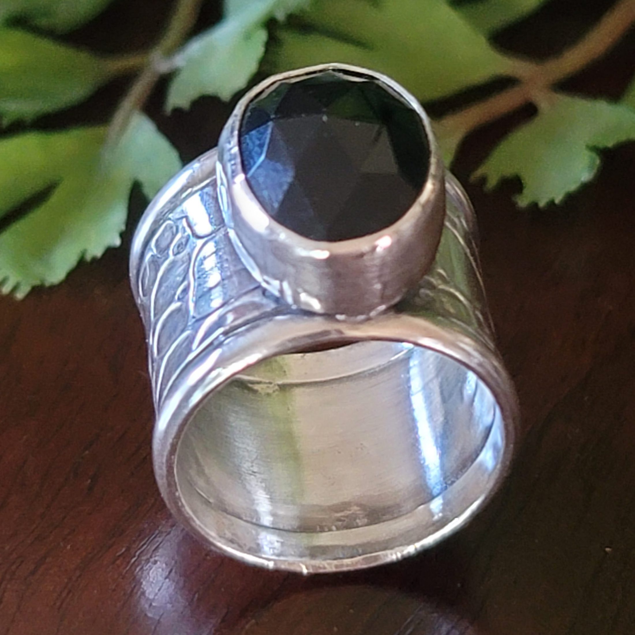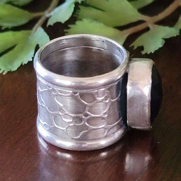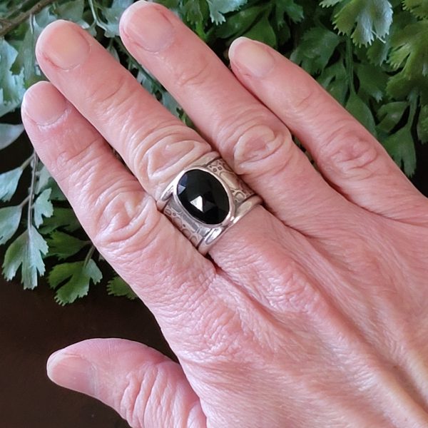 Rose cut black onyx and textured and oxidized sterling silver create this ring. The band is 3/4″ wide and it fits a size 8 finger. This ring is one of a kind and ready to ship.