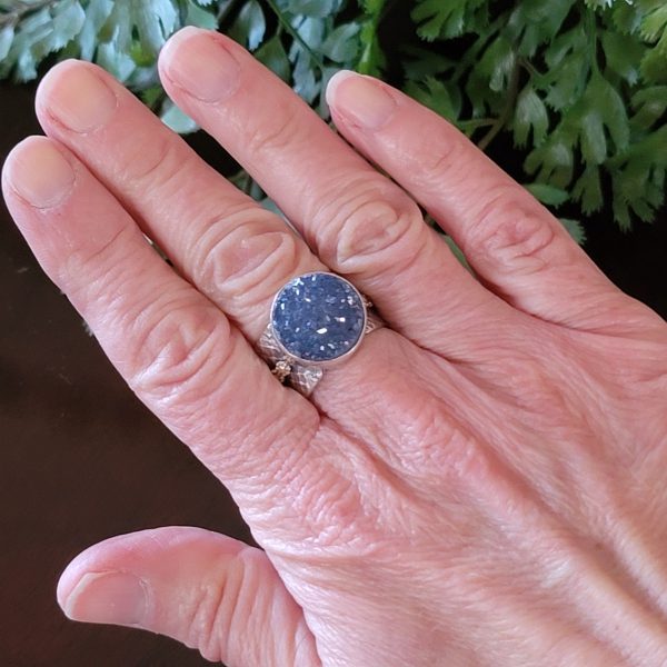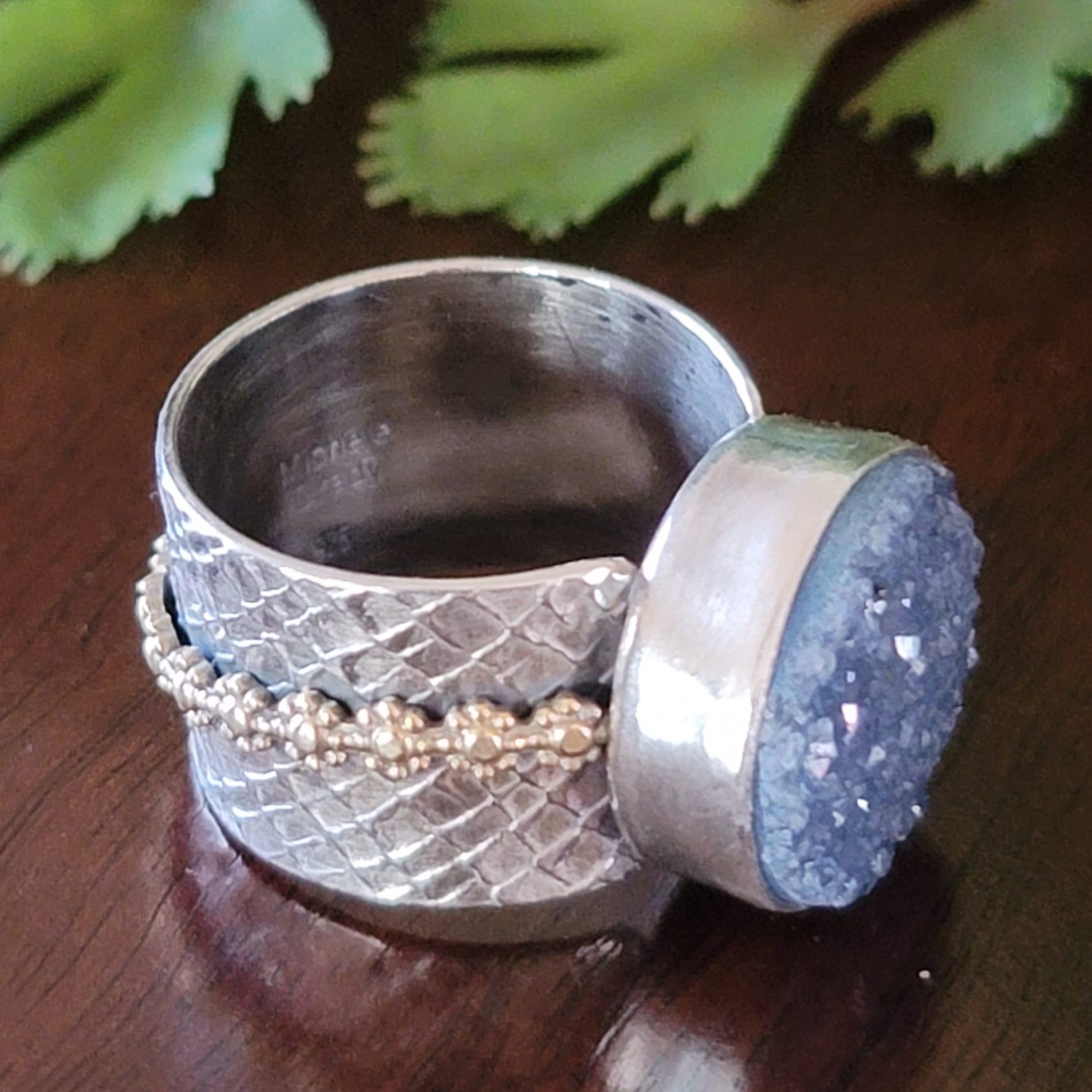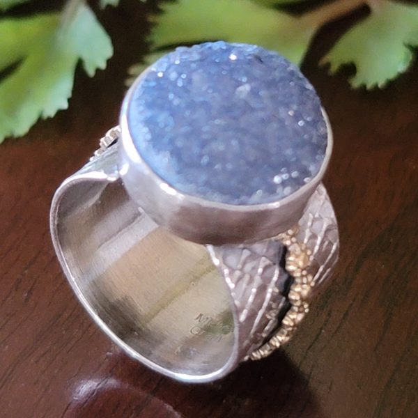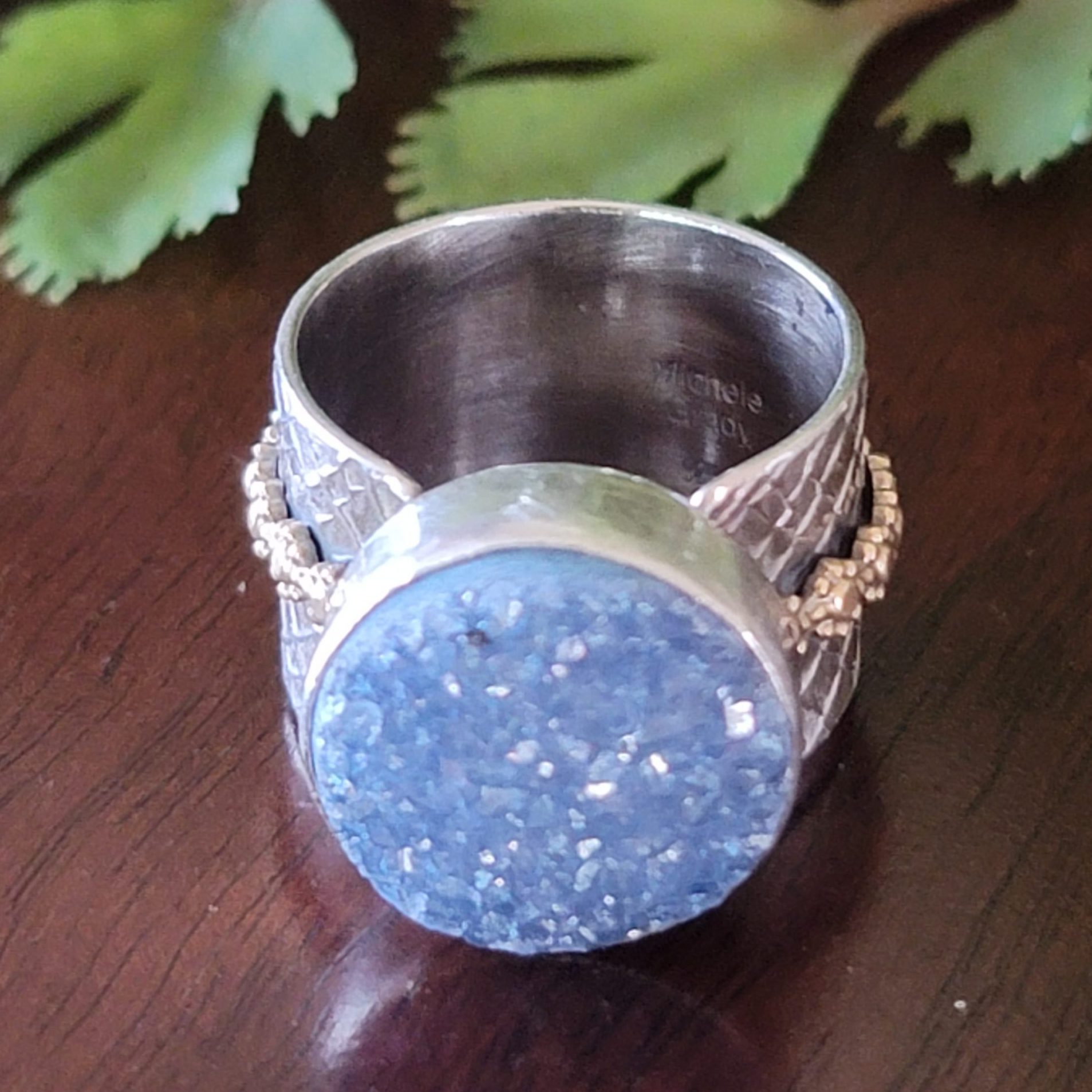 Blue druzy, textured and oxidized sterling silver and brass create this ring. The band is 1/2″ wide and it fits a size 8 finger. This ring is one of a kind and ready to ship.