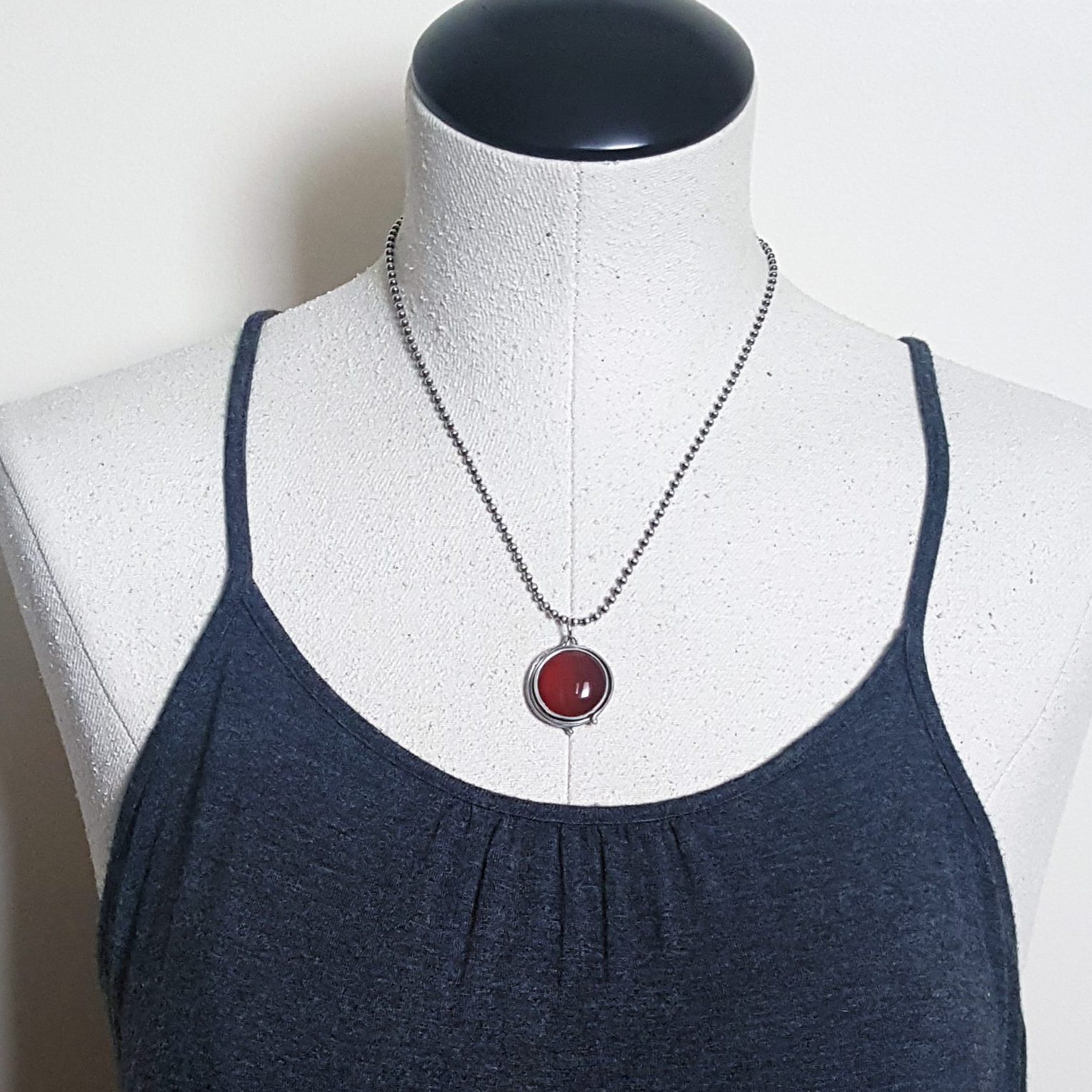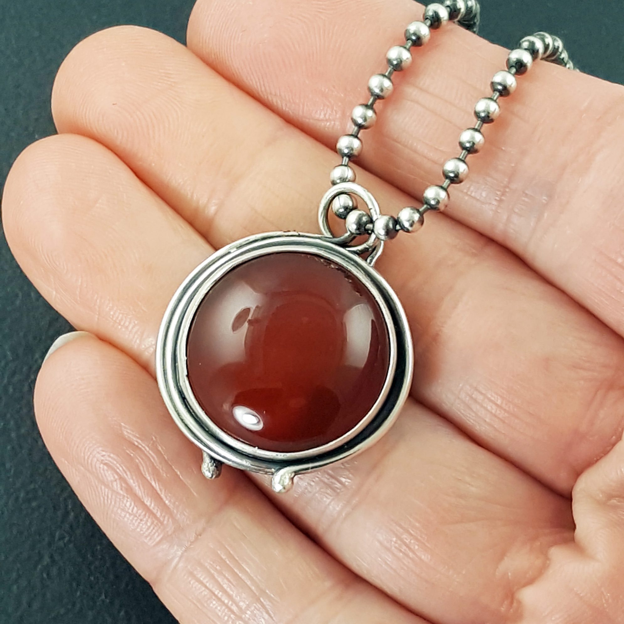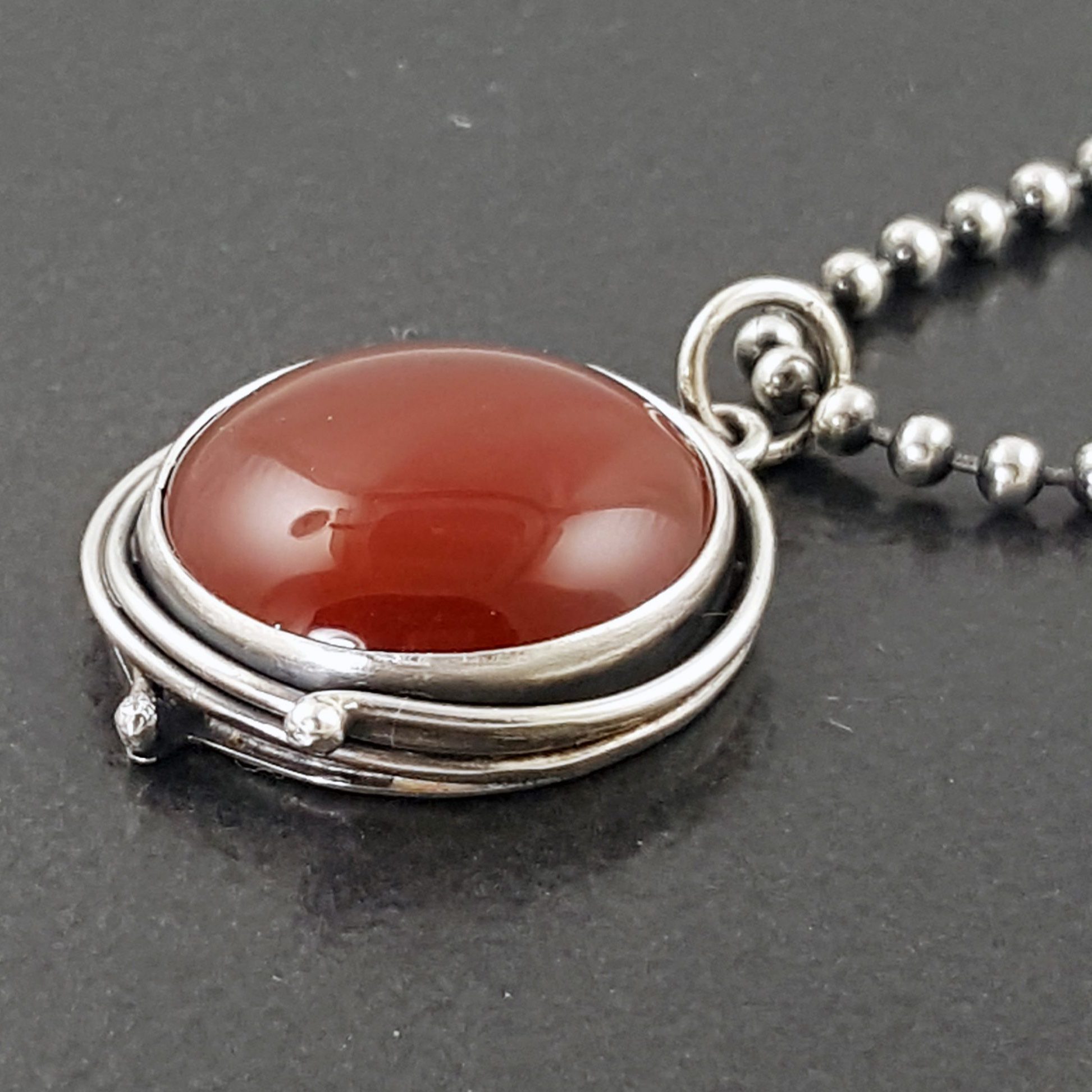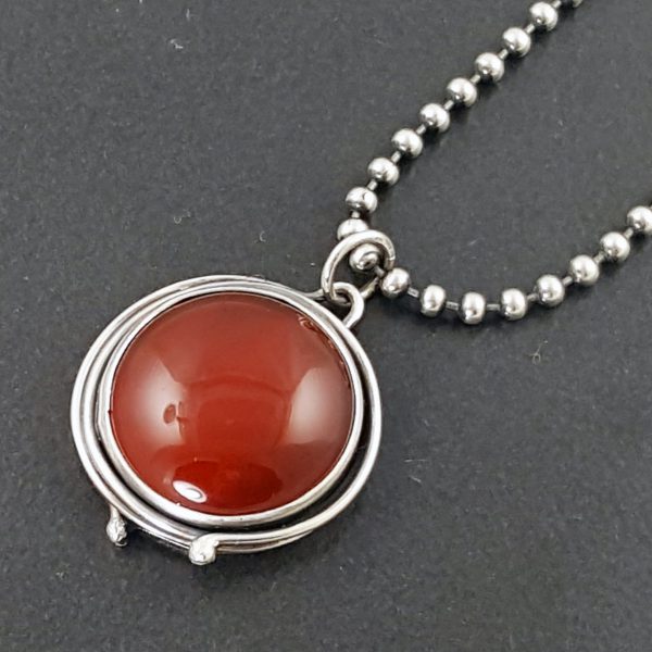 Carnelian and sterling silver create this piece. The pendant hangs from an 18″ sterling silver chain.  This pendant measures approx 1″ in diameter. You can wear it alone or layered with other necklaces.