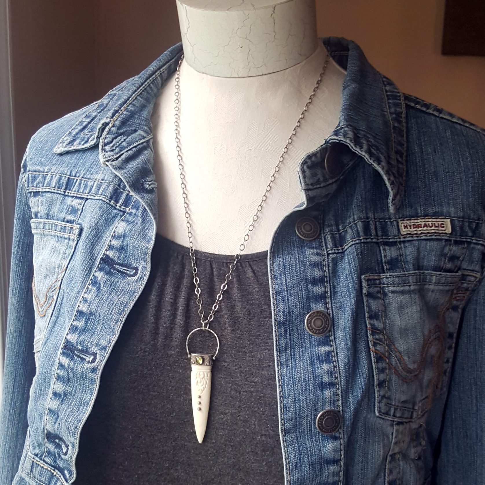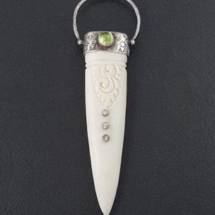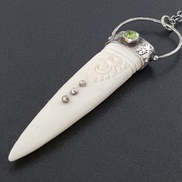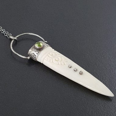 Sterling silver, peridot and a carved bone dagger create this piece. The entire piece has been oxidized to bring out the detail. The pendant hangs from a 24″ sterling silver chain. This piece is one of a kind and ready to ship.