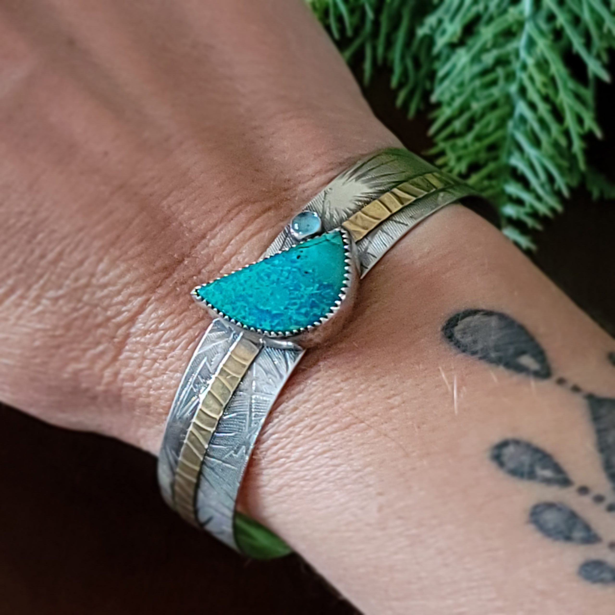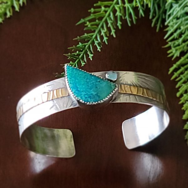 Chrysocolla, blue topaz, textured and oxidized sterling silver and brass to create this cuff. It measures approximately .5″ wide. The bracelet itself measures approx 6″ long with a 1″ opening. This item is in stock and ready to ship.
