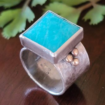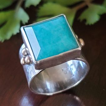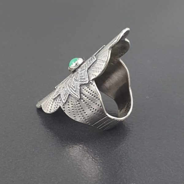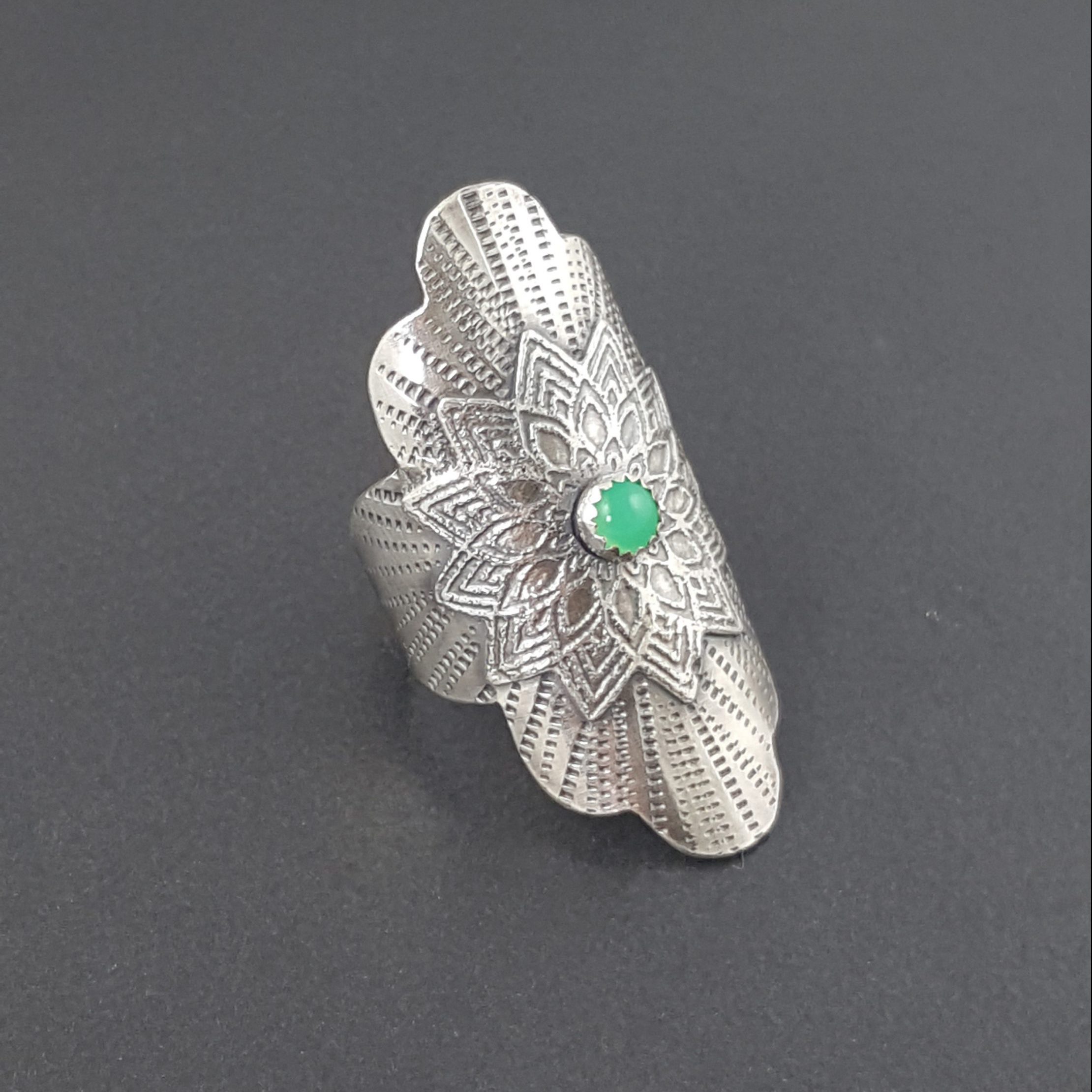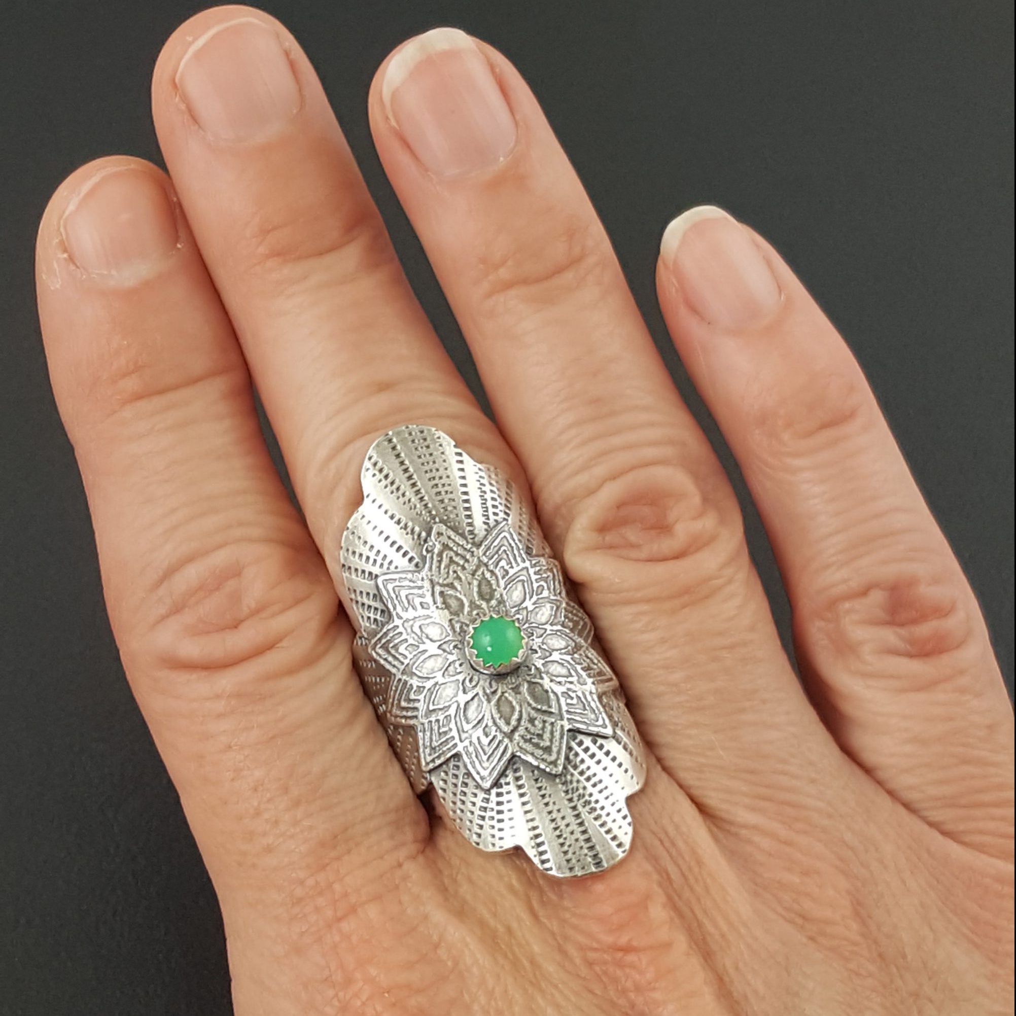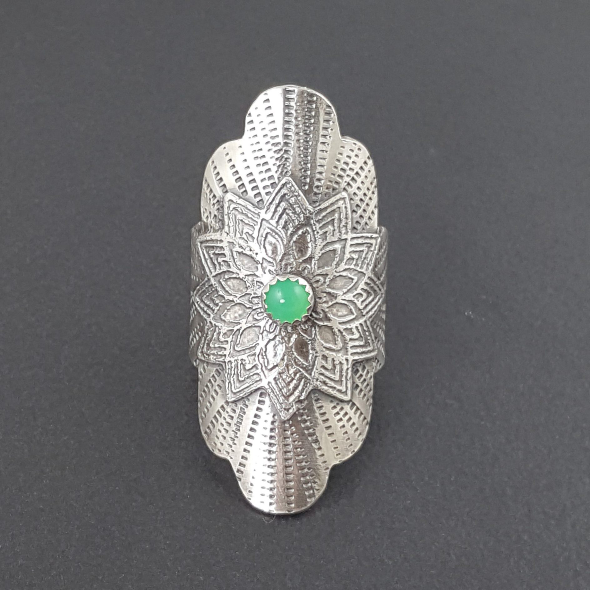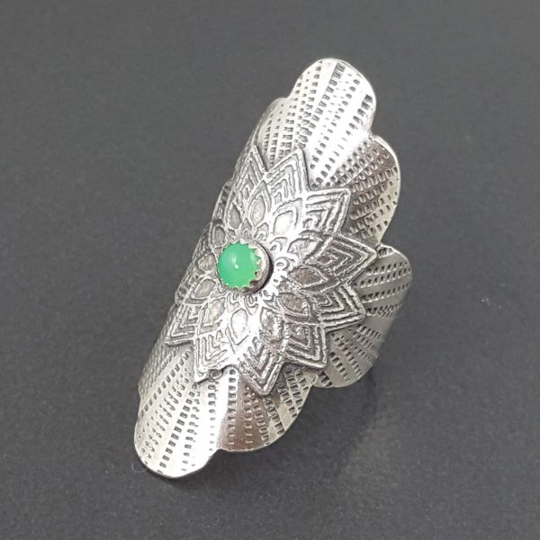 Chrysoprase combined with etched, stamped and oxidized sterling silver. The ring measures approx 1.75″ long and fits a size 9 finger. This ring is one of a kind.