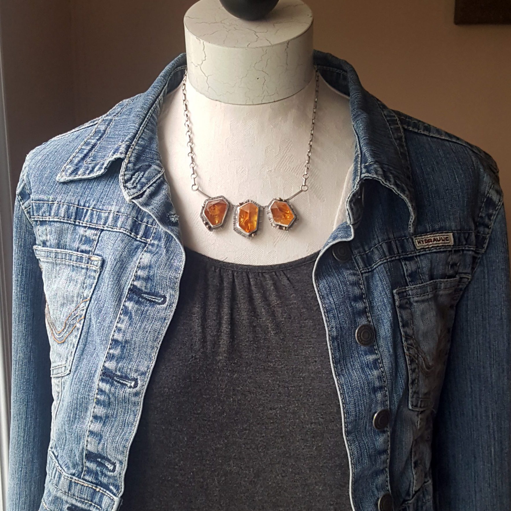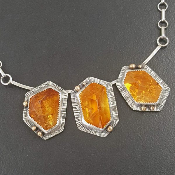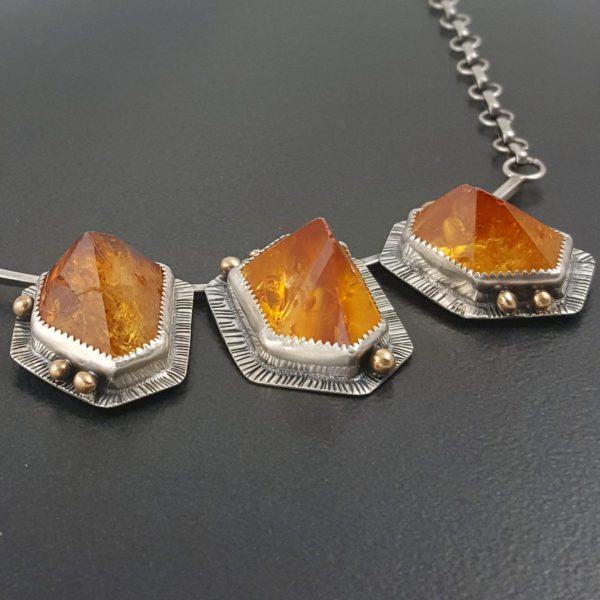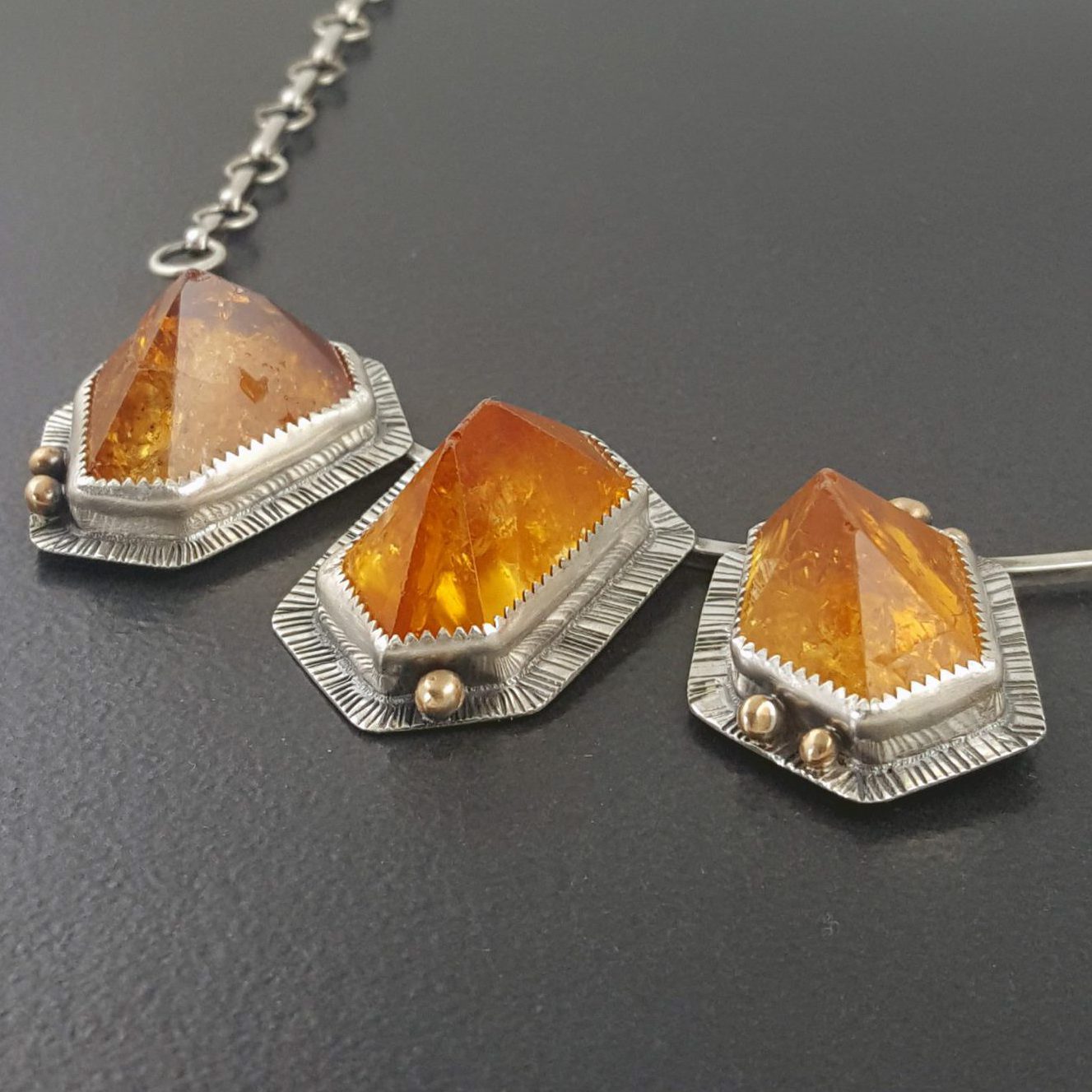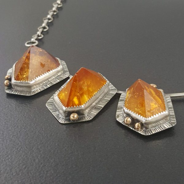 Handmade citrine cluster necklace made from pyramid shaped citrine stones, bronze and textured and oxidized sterling silver. The pendant hangs from a 20″ sterling silver chain that is adjustable due to the nature of the chain. The pendant measures approx 2.25″ long and 1.5″ high. This piece is one of a kind and ready to ship.