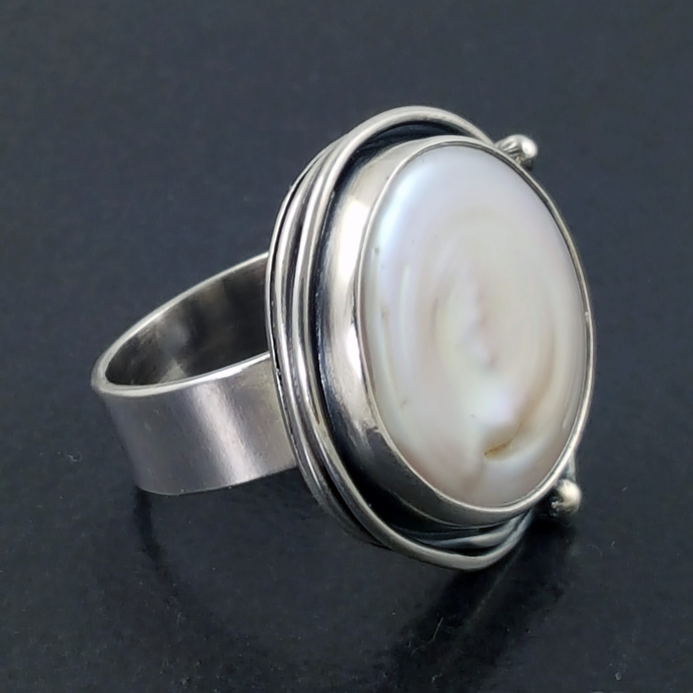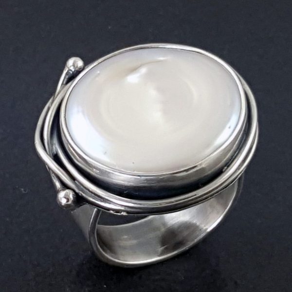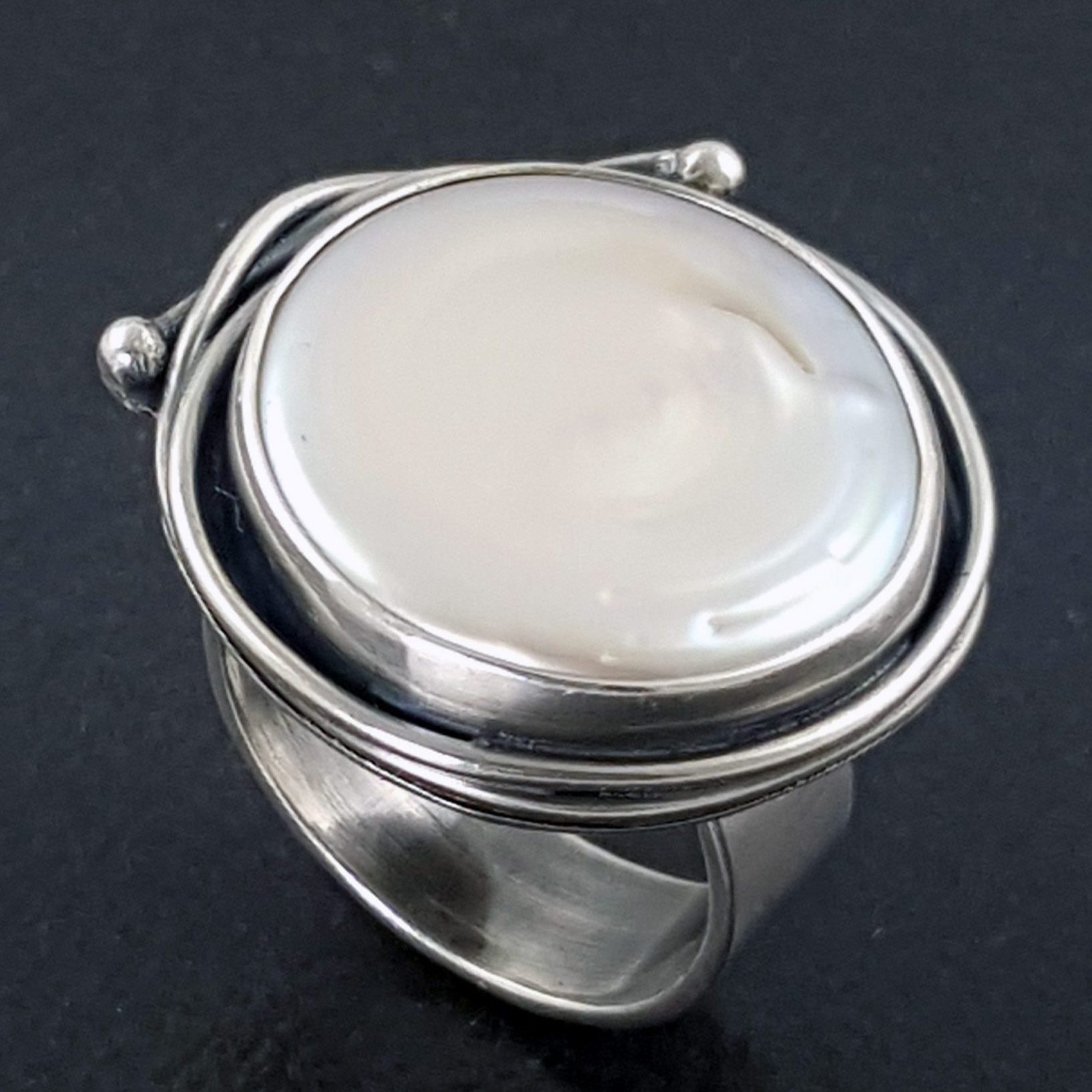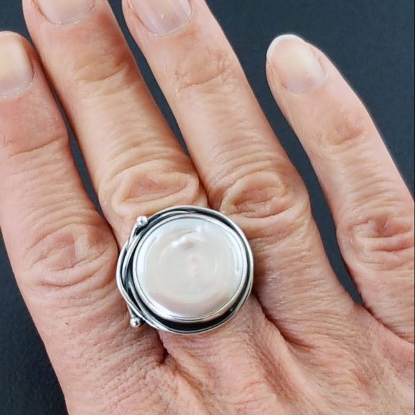 A white coin pearl is combined with sterling silver to create this ring. The entire ring is then oxidized to bring out the detail. This ring measures approx 1″ in diameter.