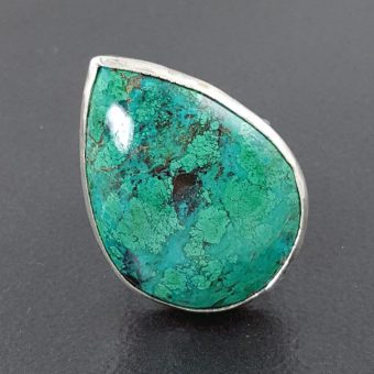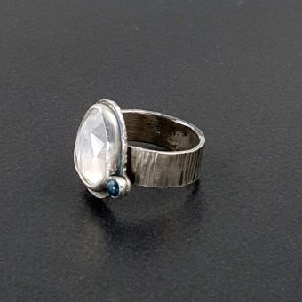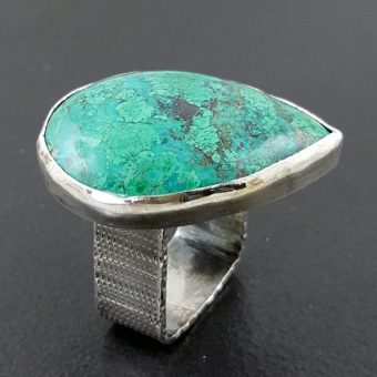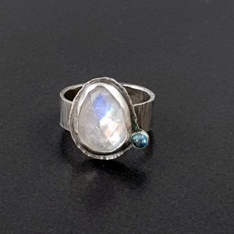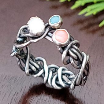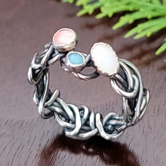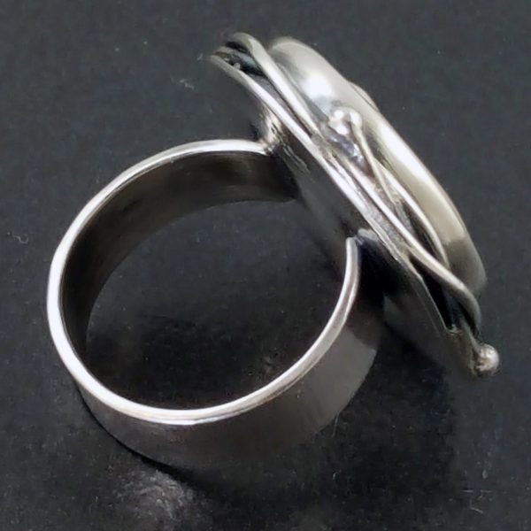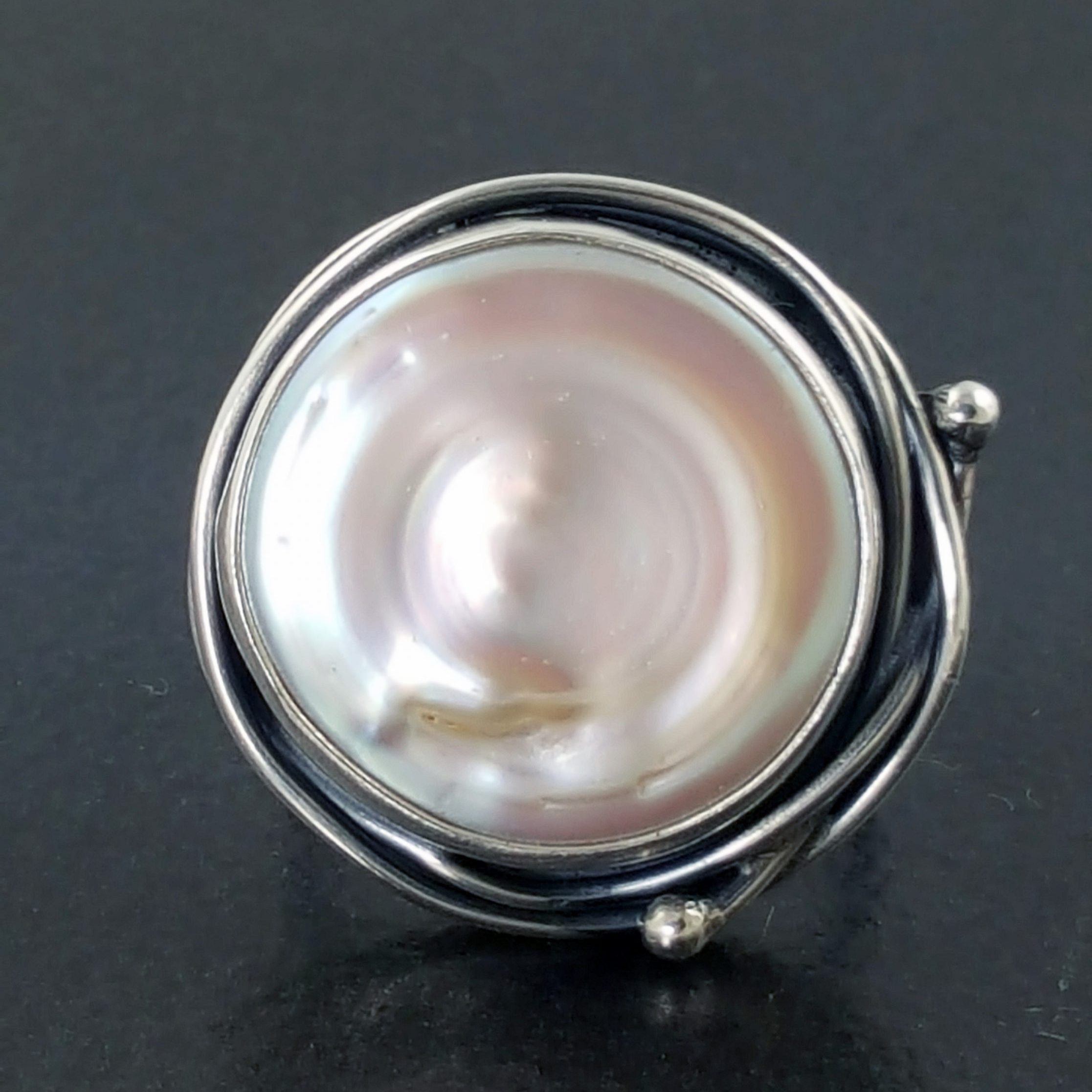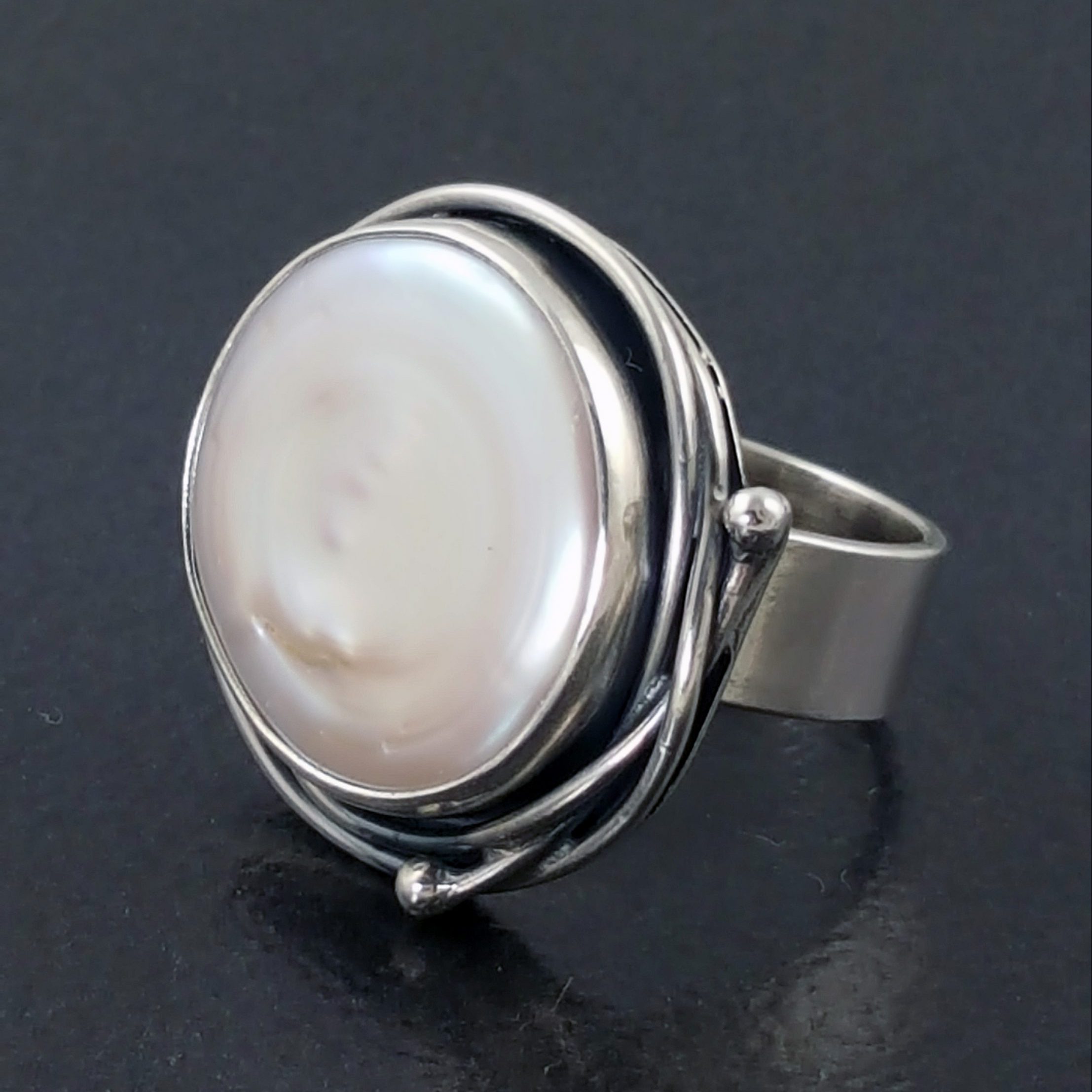 A white coin pearl is combined with sterling silver to create this ring. The entire ring is then oxidized to bring out the detail. This ring measures approx 1″ in diameter.