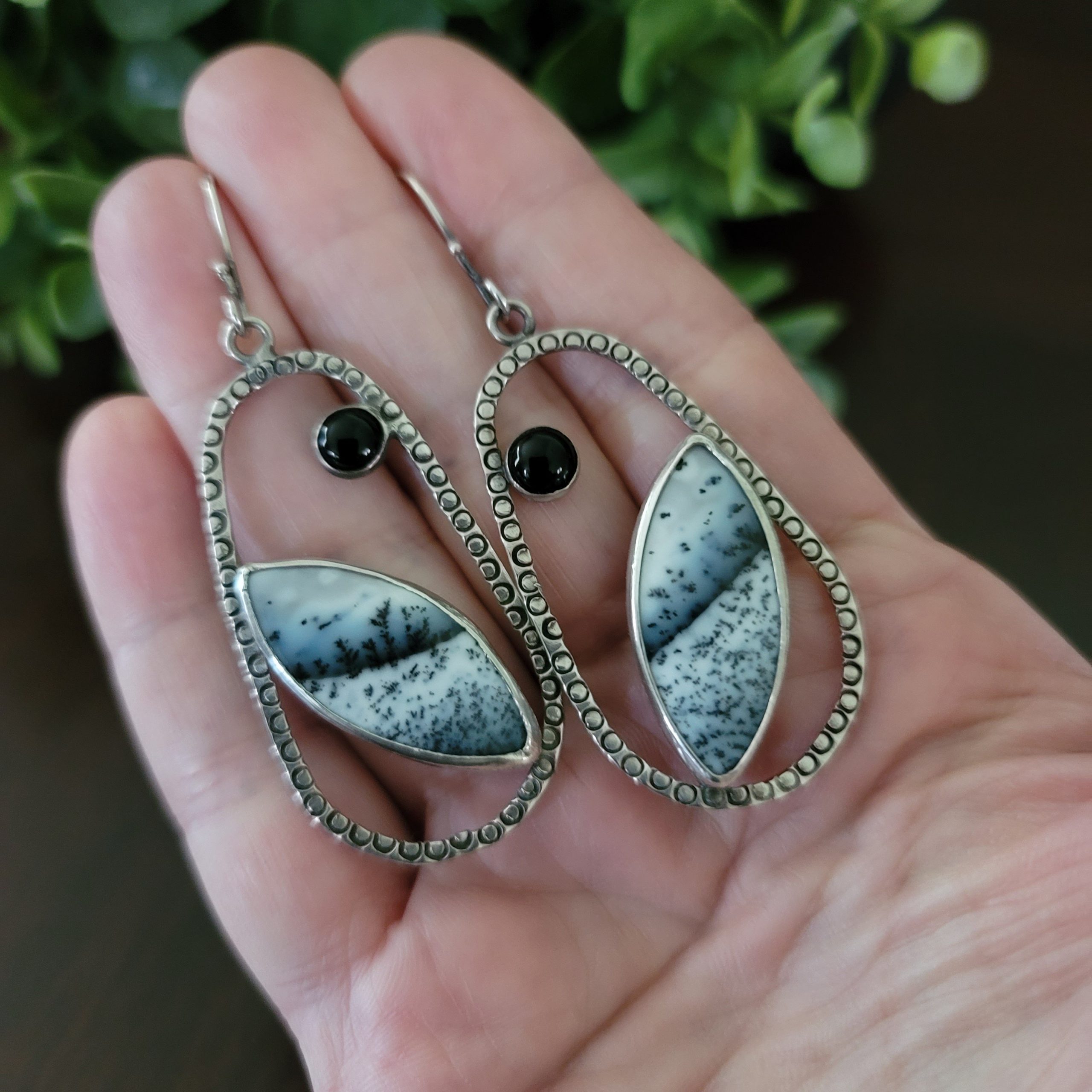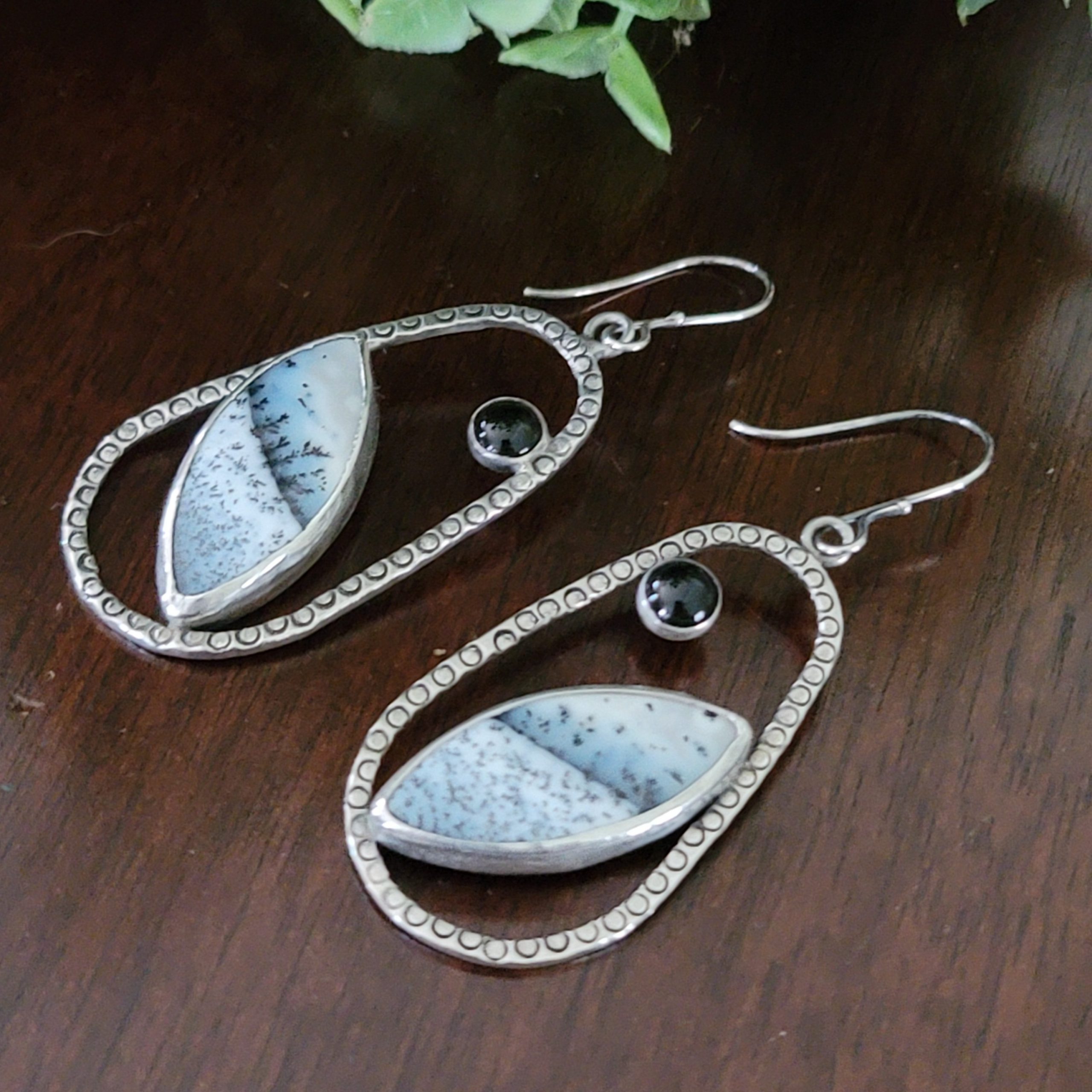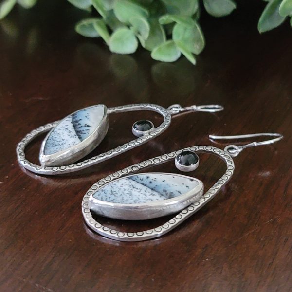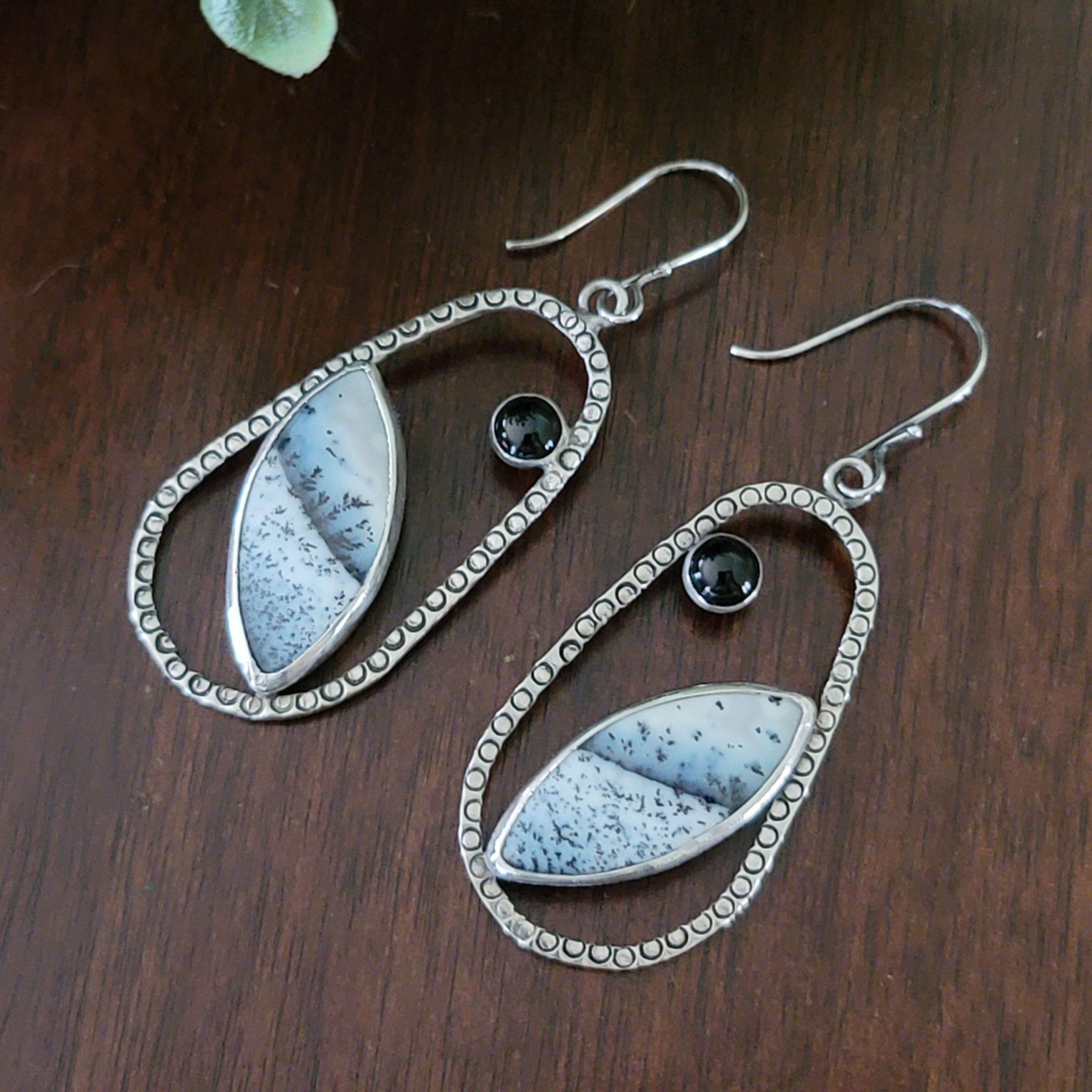 Dendritic opal and black onyx are combined with sterling silver to create these earrings. They are oxidized to bring out the detail and measure approx 2.75″ long and hang from sterling silver ear wires. These earrings are one of a kind and ready to ship.