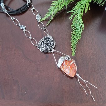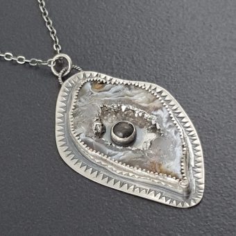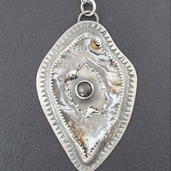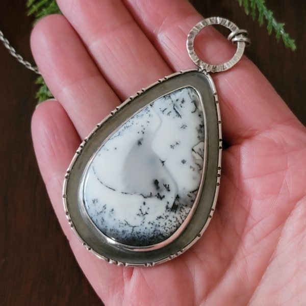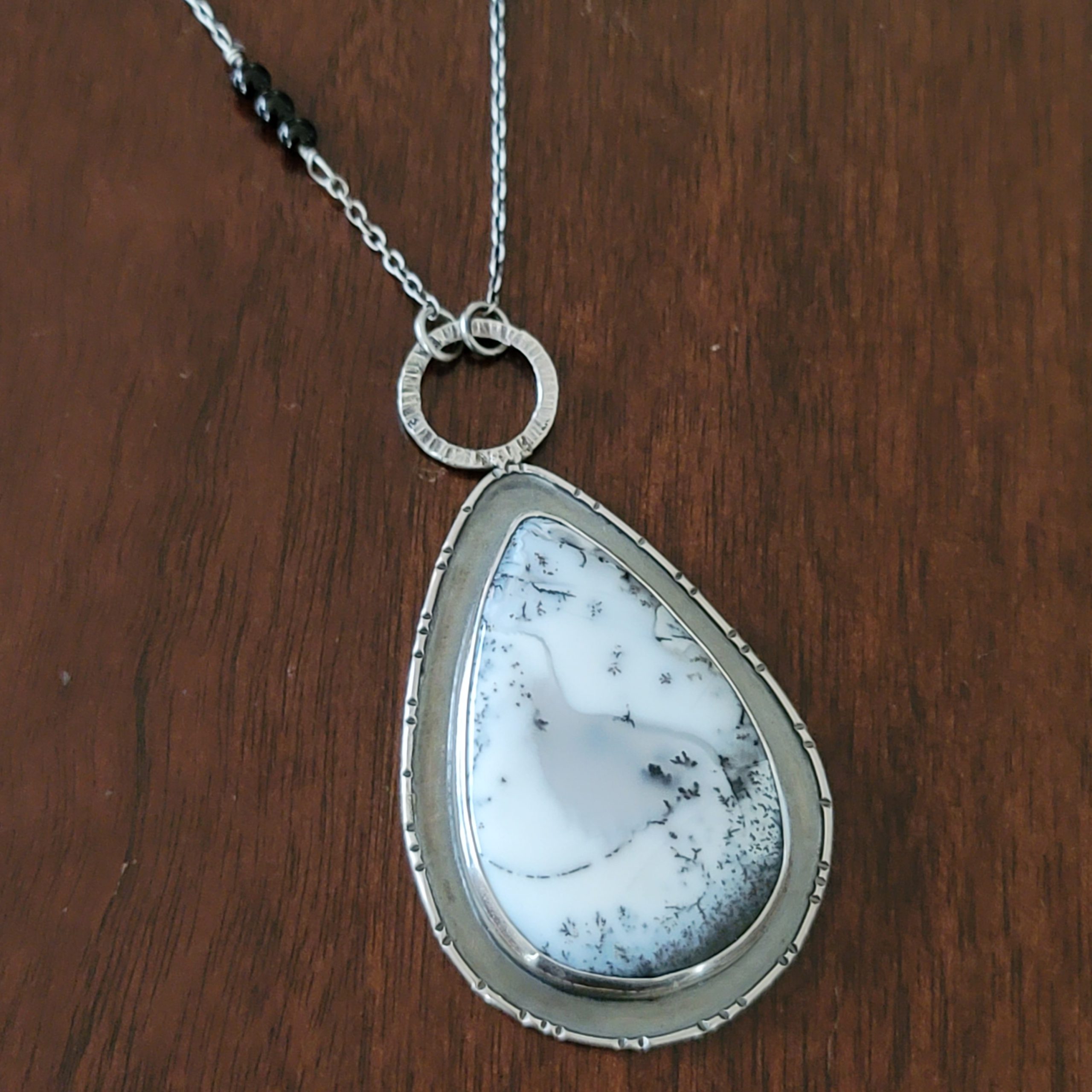 Dendritic opal, black onyx and oxidized sterling silver create this piece. It measures approx 3″ long by 1.75″ wide and hangs from an adjustable 16-18″ sterling silver chain. This necklace is one of a kind and ready to ship.