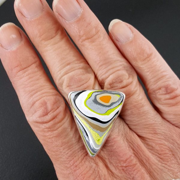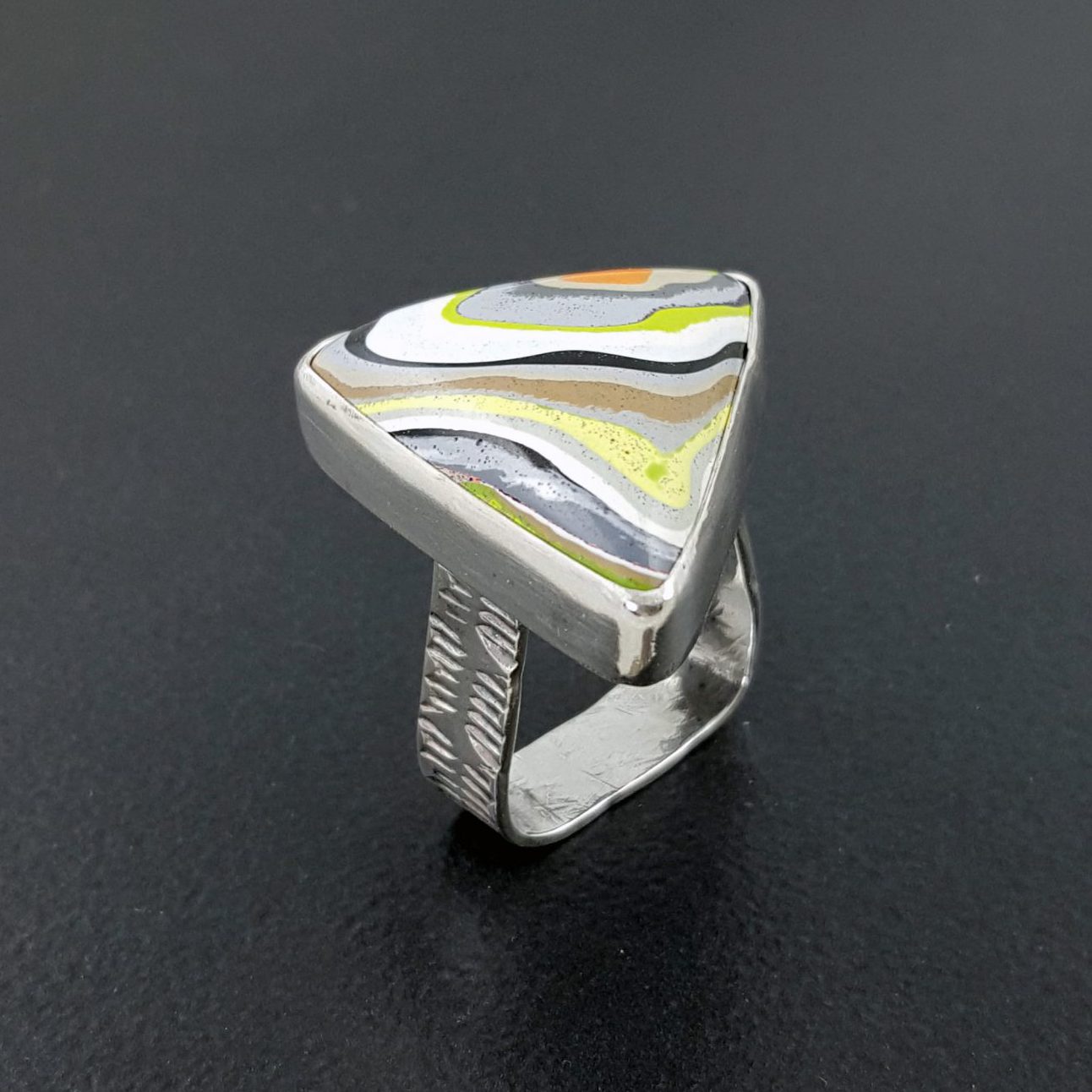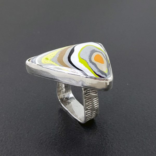 Fordite, also known as Detroit agate or Motor City agate, is old automotive paint which has hardened sufficiently to be cut and polished. This ring combines fordite with textured and oxidized sterling silver. The stone measures approx 1″ long by 1″ across at its widest points. This handmade ring fits a size 8 thru a size 9 finger due to the shape of the band. Square bands are not only very comfortable to wear but they also keep the ring from spinning on your finger. This ring is one of a kind and ready to ship.
