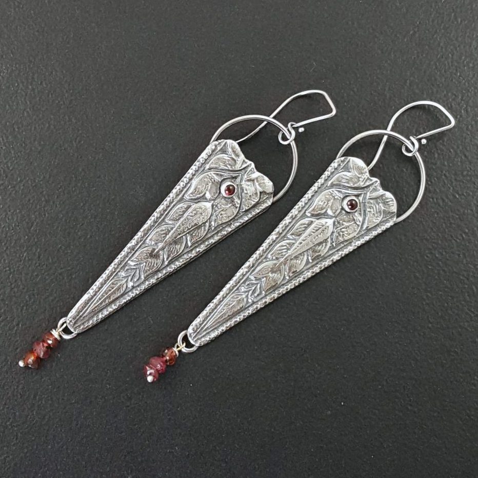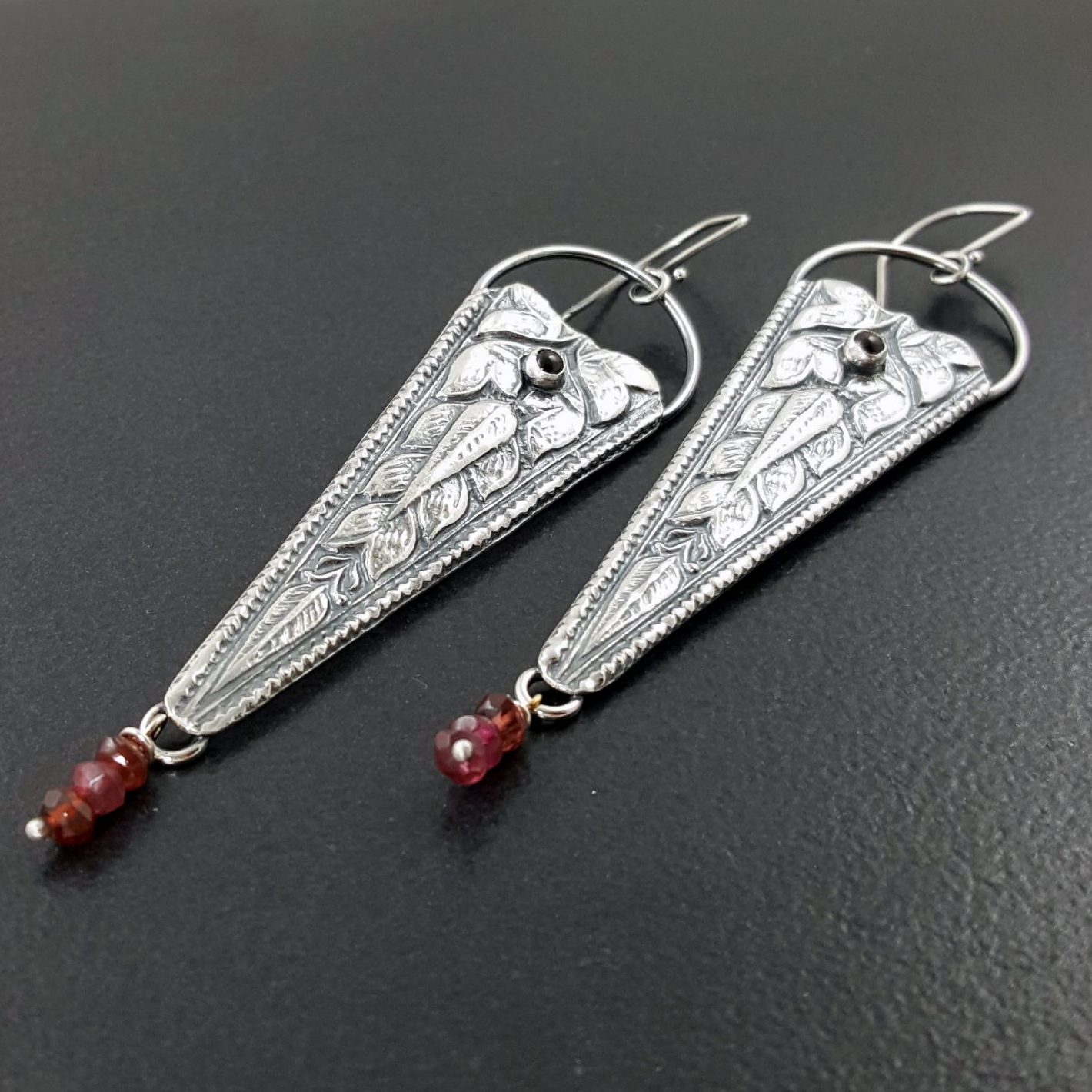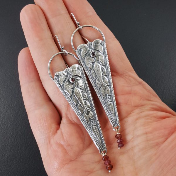 Garnet combined with oxidized sterling silver. I hammered the sterling into a vintage die from India to create the pattern on the silver. The earrings are approx 3.5″ long from the top of the ear wire to the bottom of the earring. These are ready to ship.