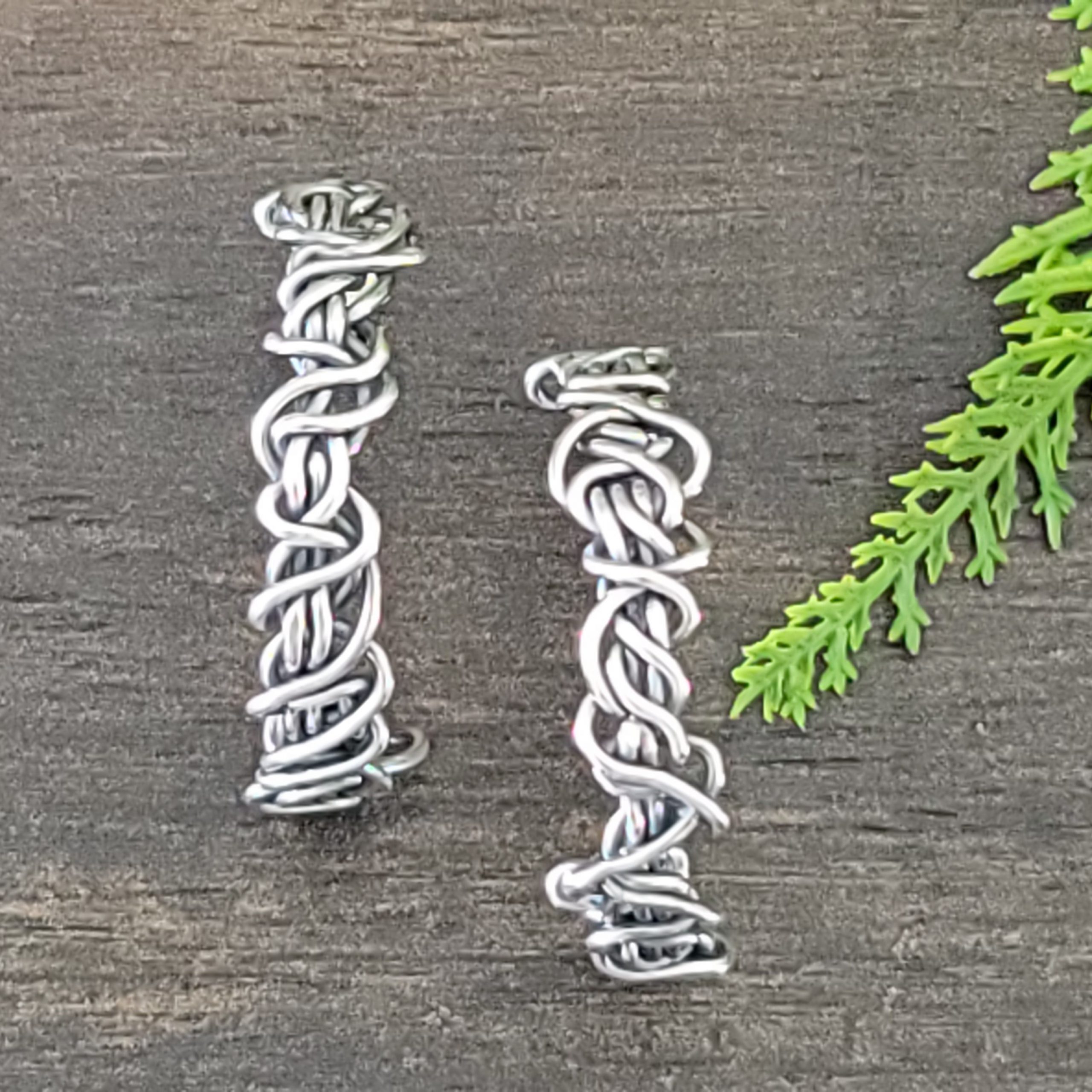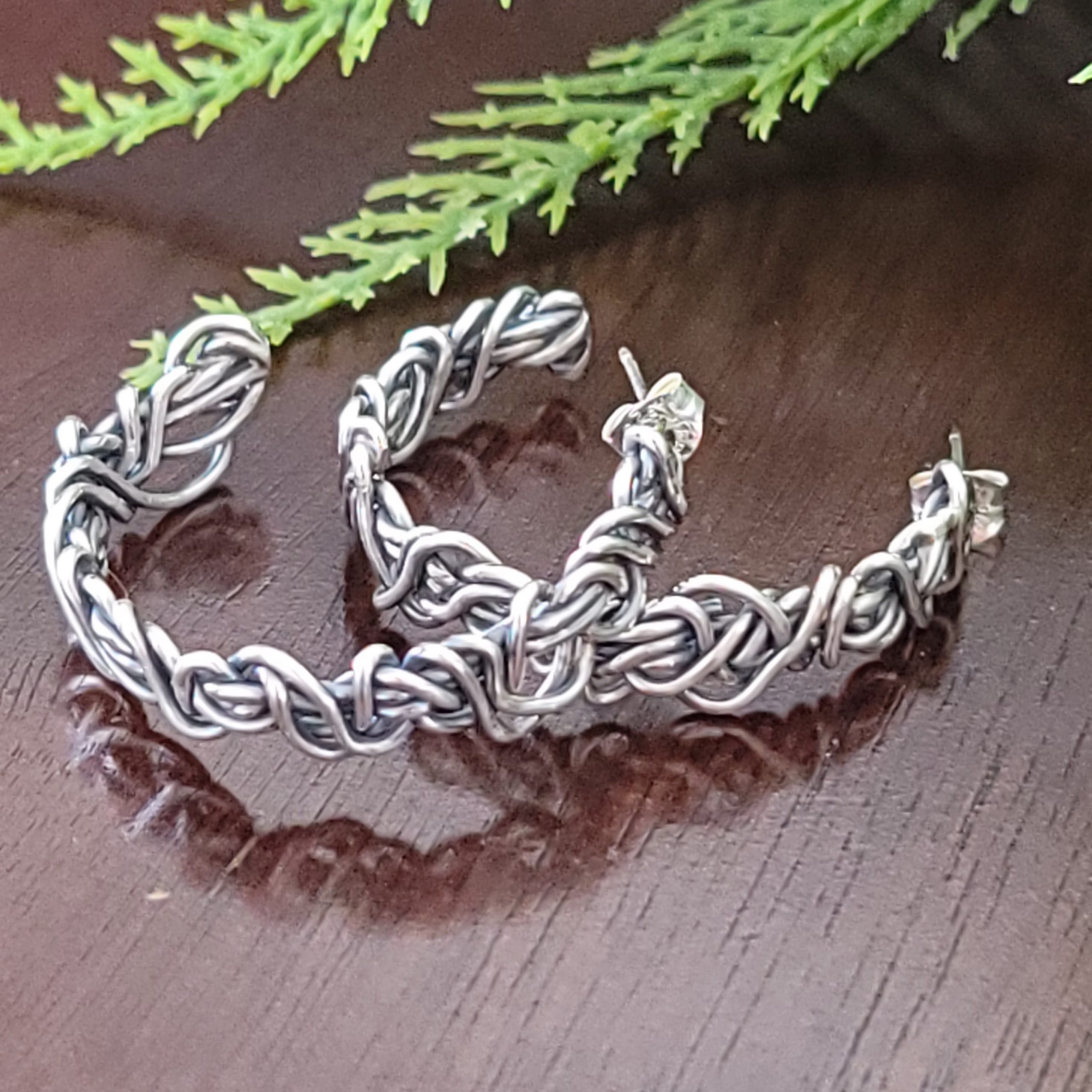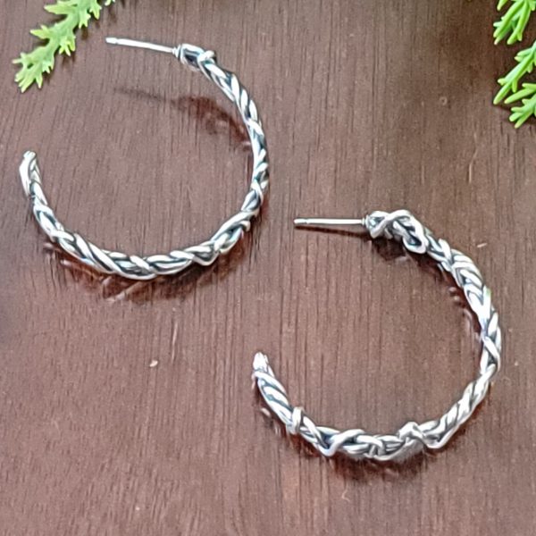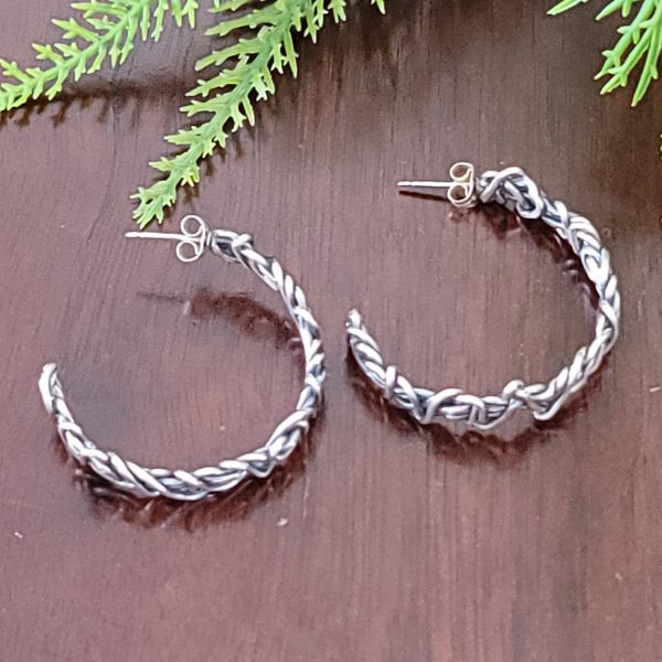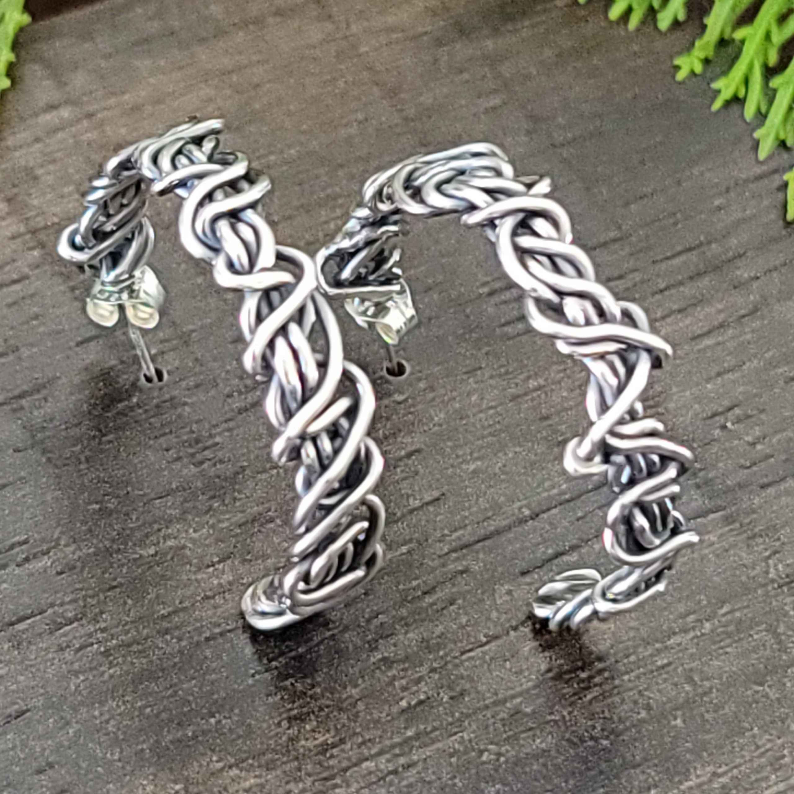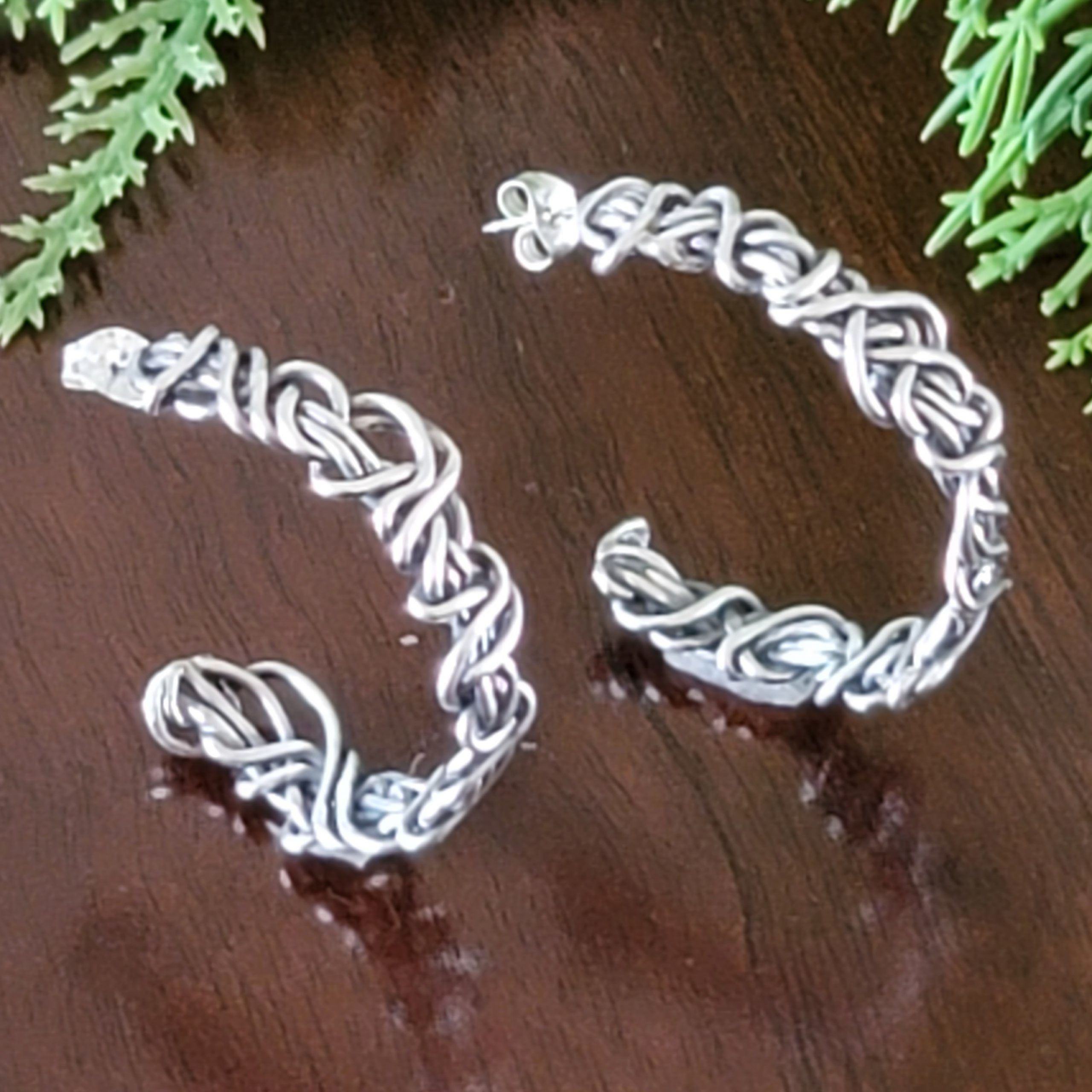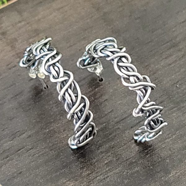 Sterling silver wire creates these earrings. They are oxidized to bring out the detail. They measure approx 1.25″ in diameter and have sterling silver posts and ear nuts. There is no rhyme or reason when I make these earrings. I just twist and bend the metal until I like what I see. Just like when a grapevine grows it twists and bends with no rhyme or reason, hence the name. These are in stock and ready to ship.