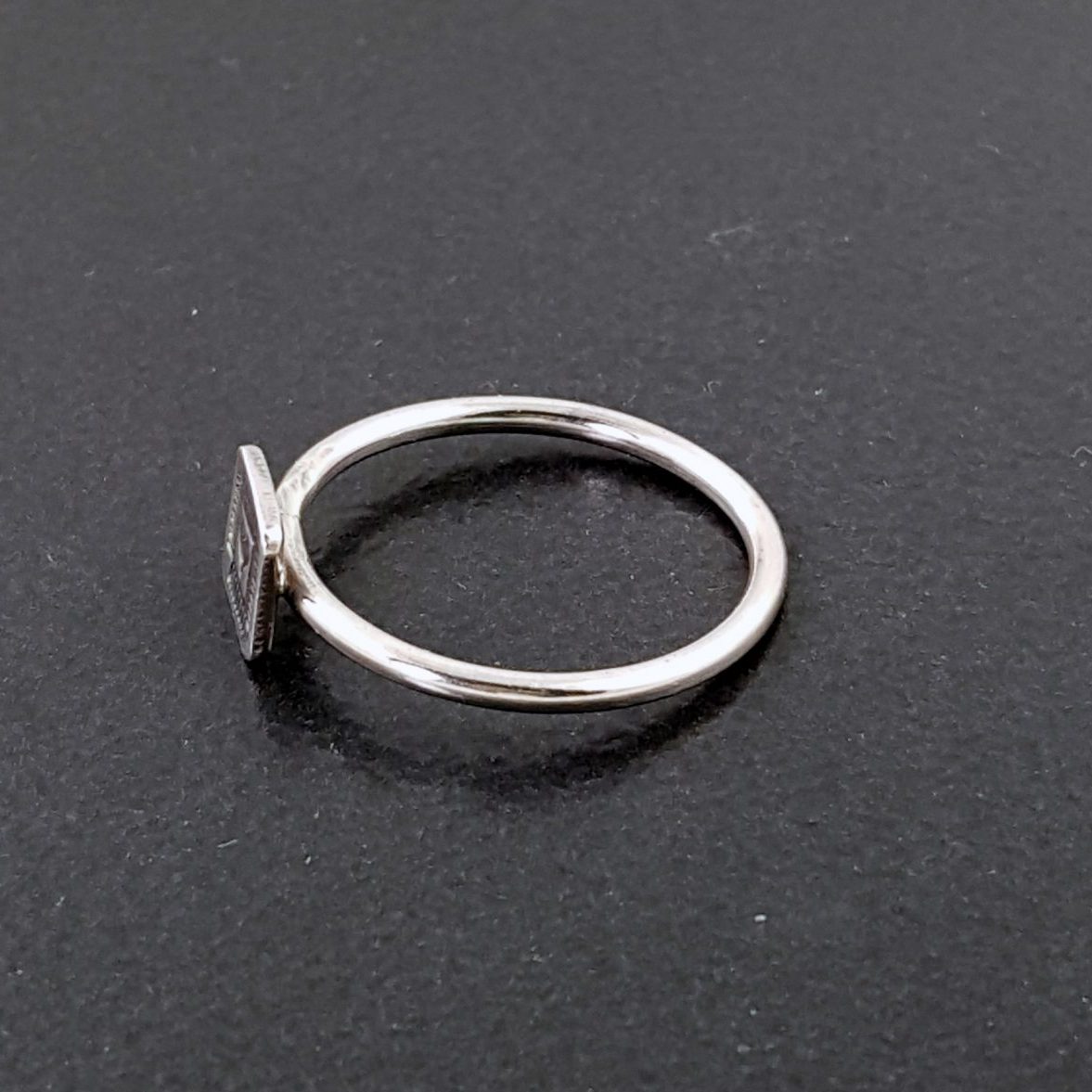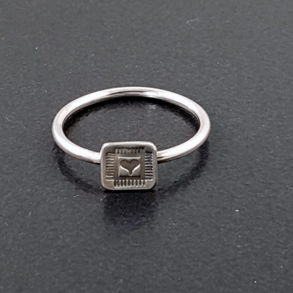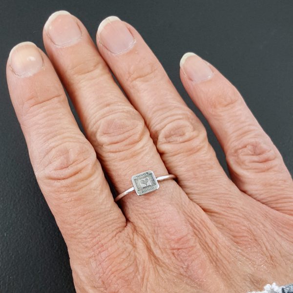I made this heart ring for stacking or you can wear it alone. I stamp the heart into thick sterling silver using a handmade stamp and then solder it to the band. You can purchase this ring individually or as a set. A sterling silver set is not shown in the photos, but it is available as well. The heart measures approx .25″ square.