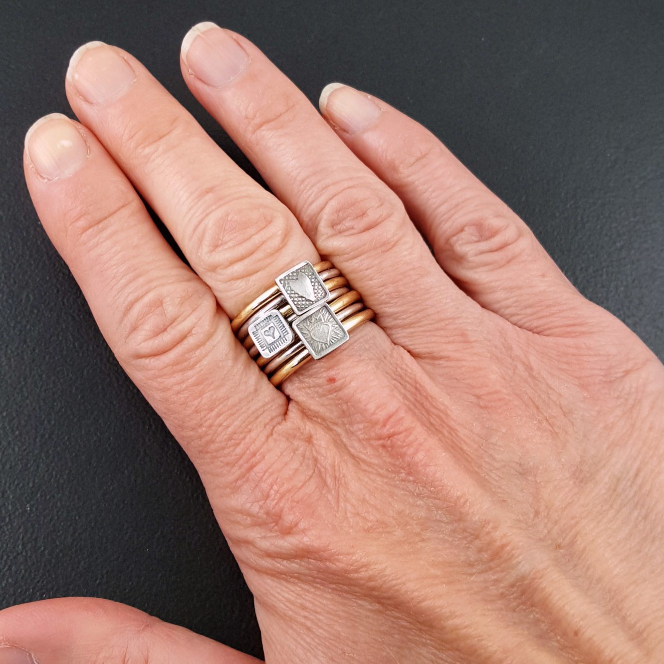 mixed metal set of 7 = 3 heart rings (one of each style shown in last photo) + 4 brass bands