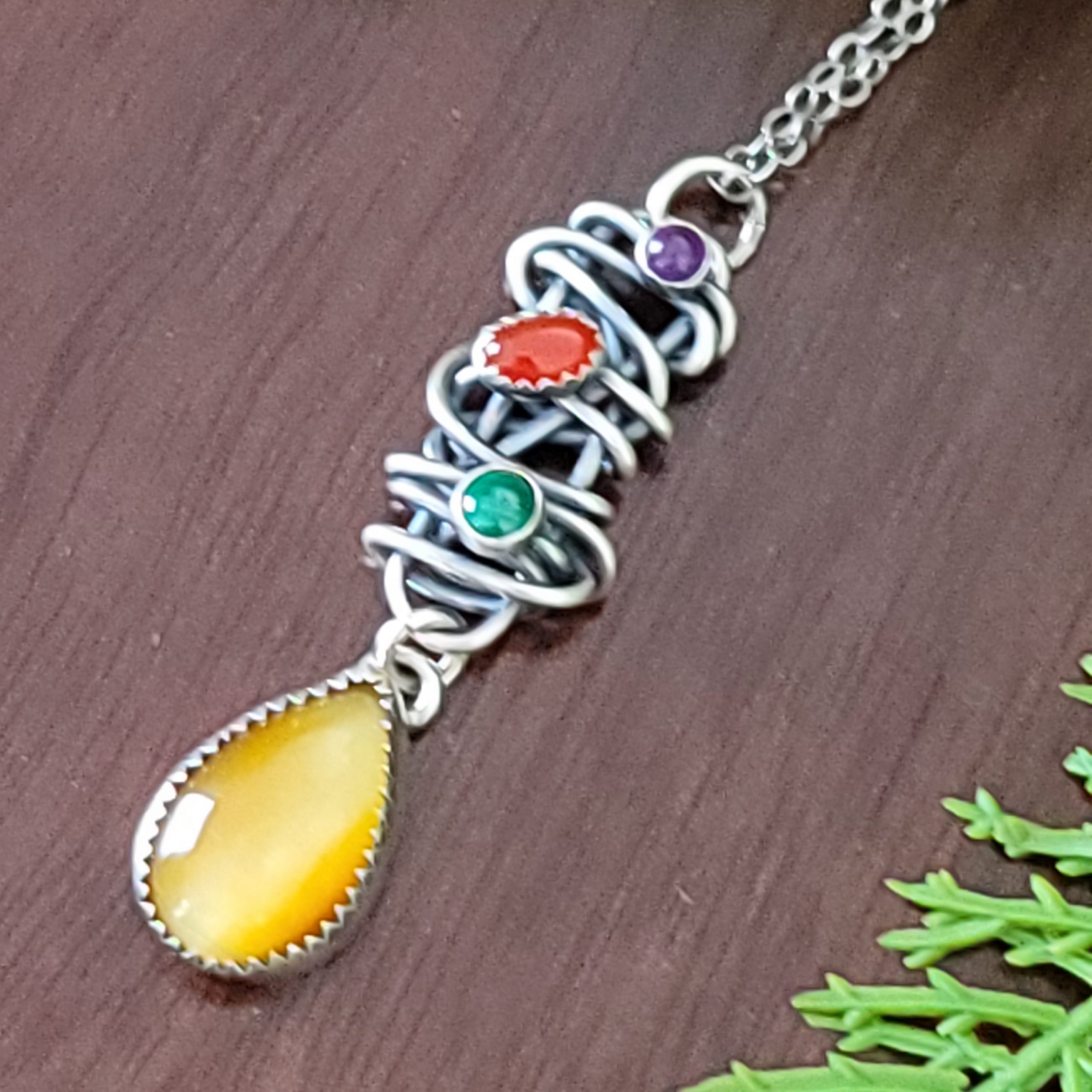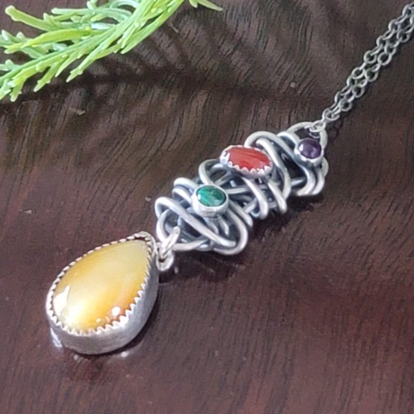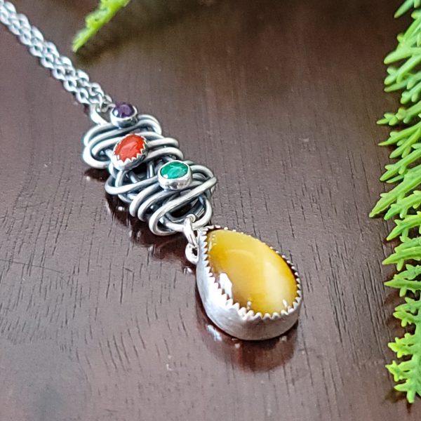 Sterling silver, amethyst, carnelian, malachite and honey tiger eye create this necklace. It is oxidized to bring out the detail. It measures approx 1.75″ long and hangs from an adjustable 16-18″ sterling silver chain. There is no rhyme or reason when I make these pieces. I just twist and bend the metal until I like what I see. Just like when a grapevine grows it twists and bends with no rhyme or reason, hence the name.
