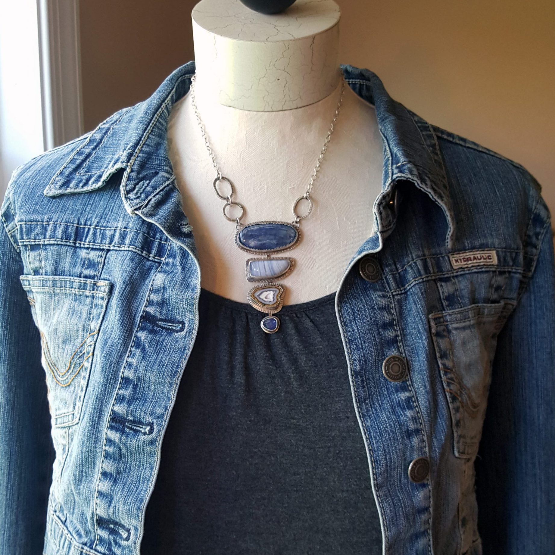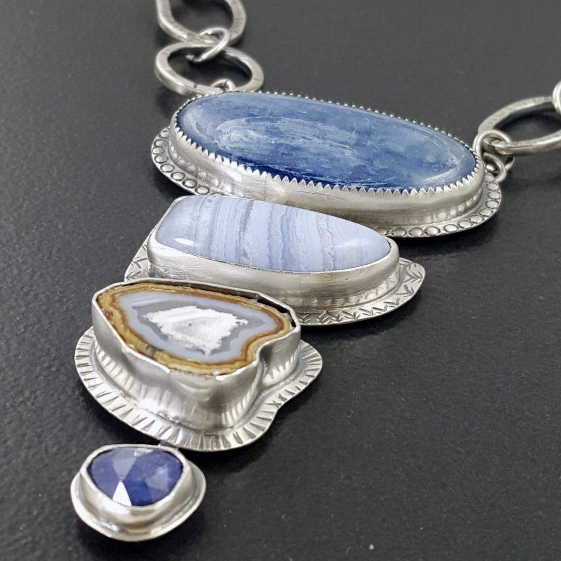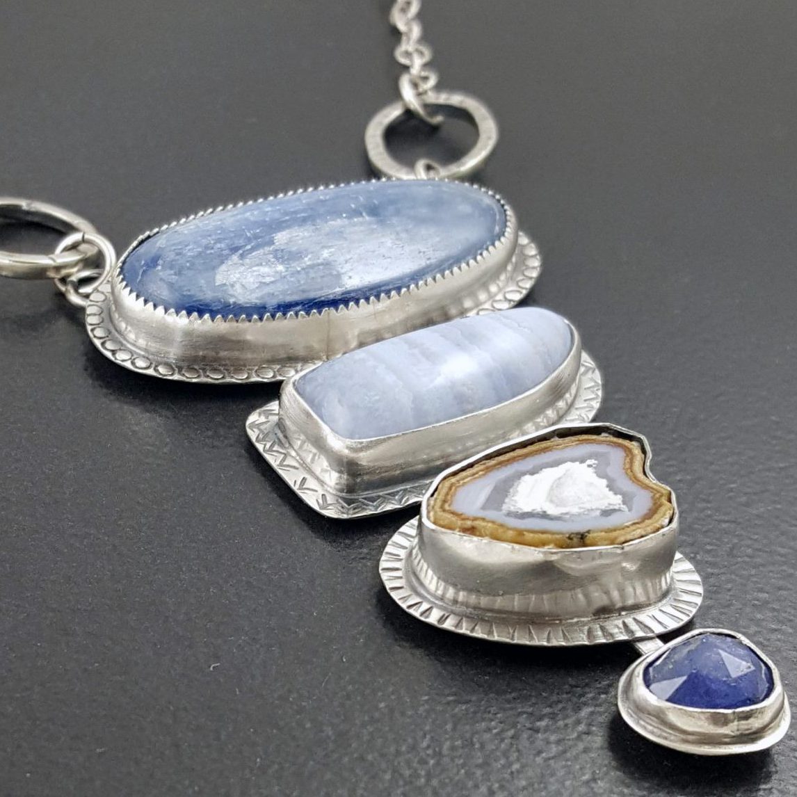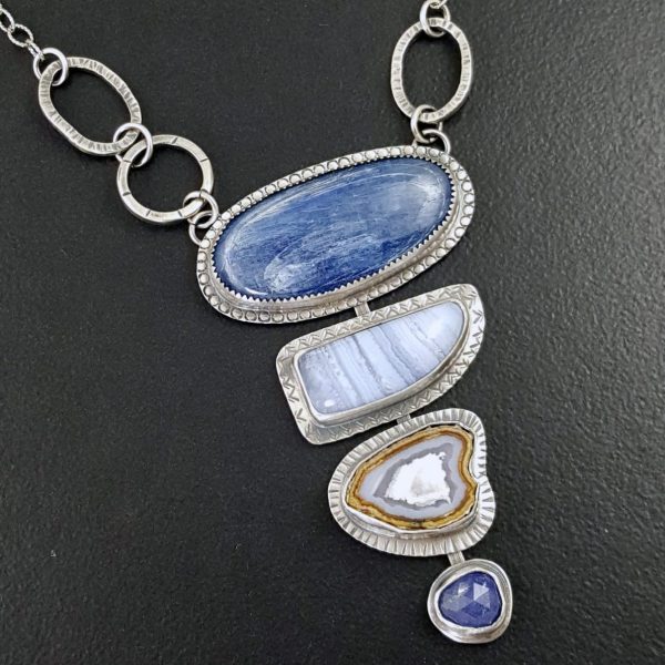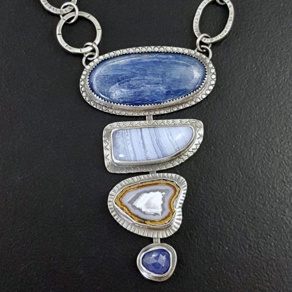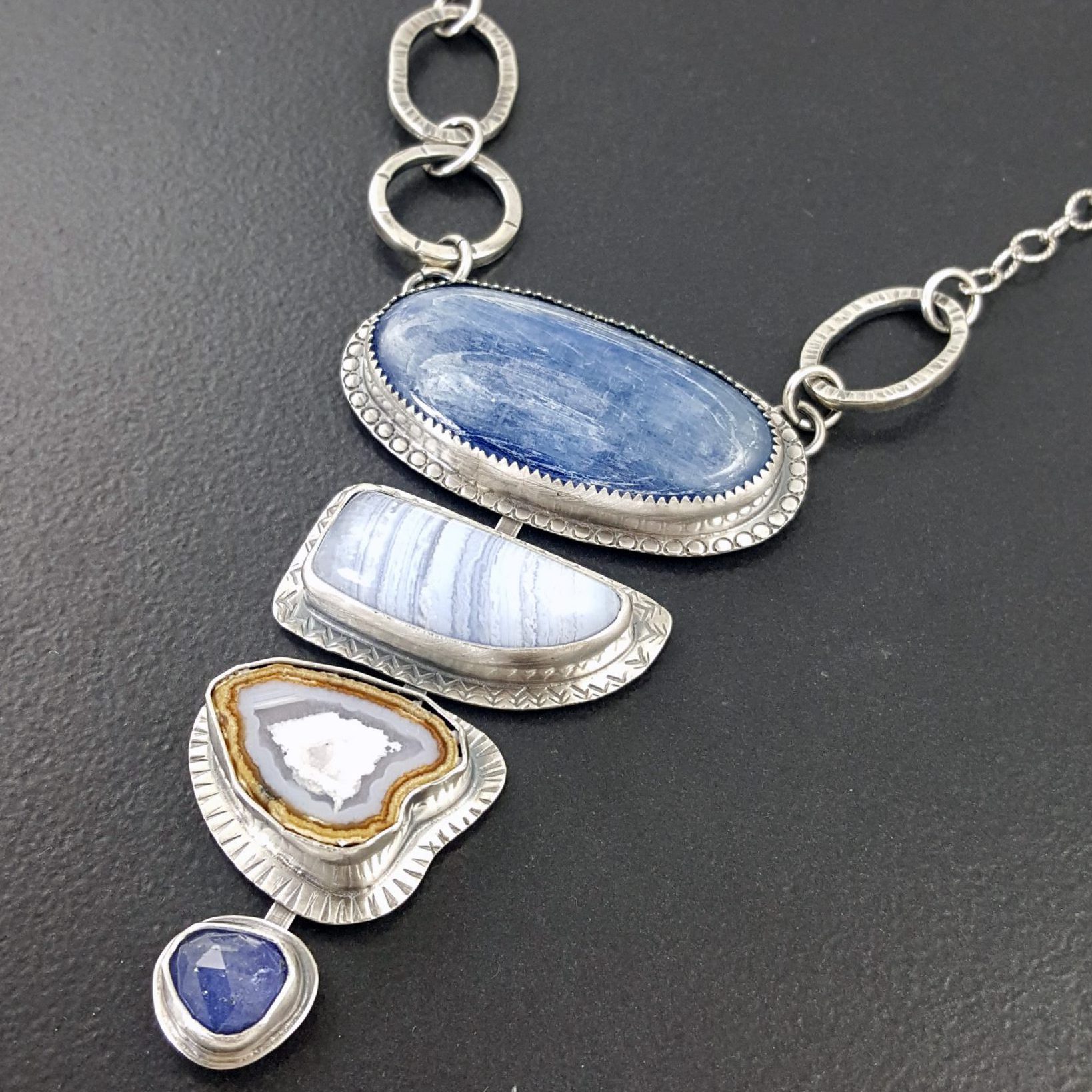 Stacked stones of Kyanite, blue lace agate (hand cut by me), druzy geode half and a rose cut tanzanite form this necklace. This pendant measures 3″ high and 1.75″ wide. It hangs from an 18″ chain is adjustable due to the nature of the chain. This item is one of a kind and ready to ship.