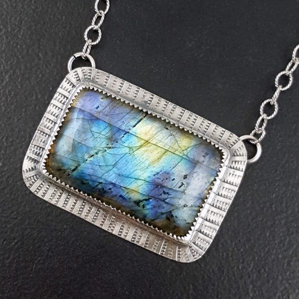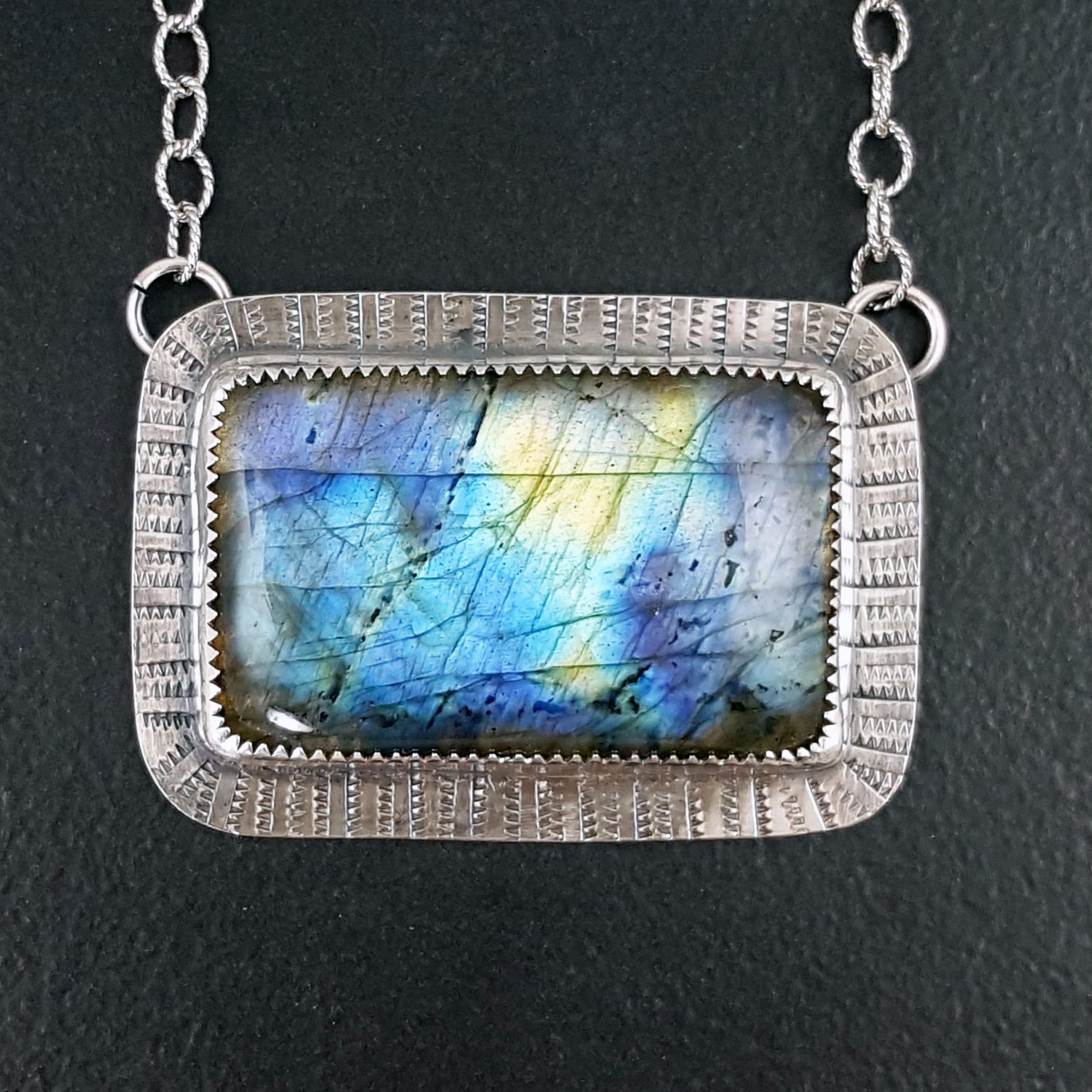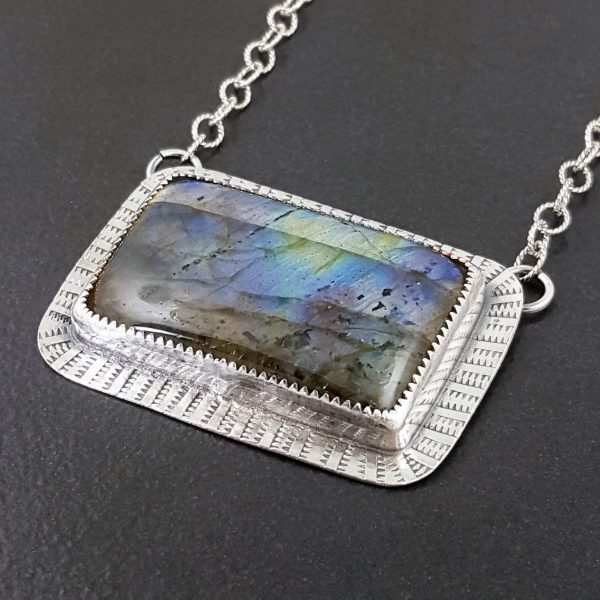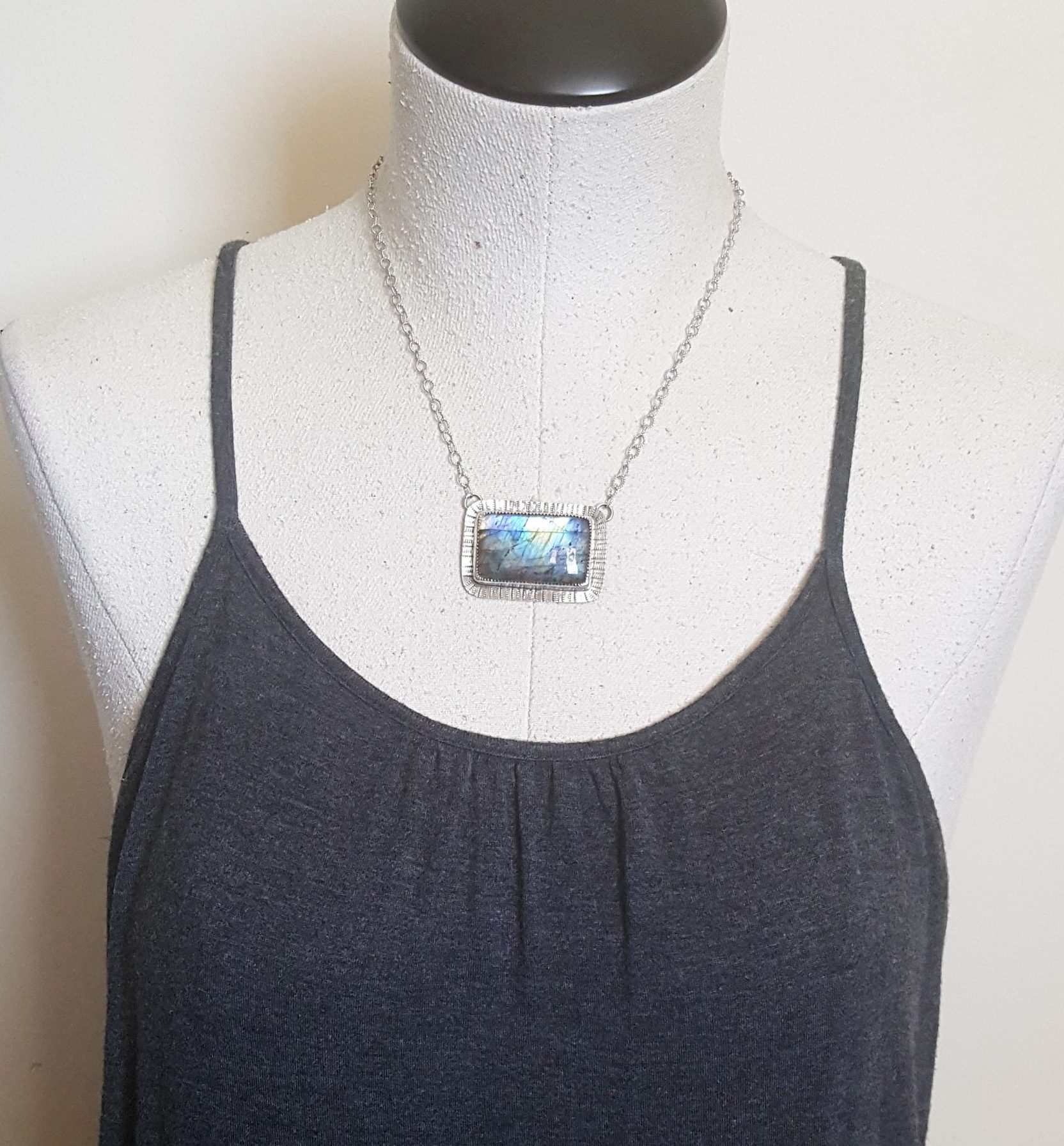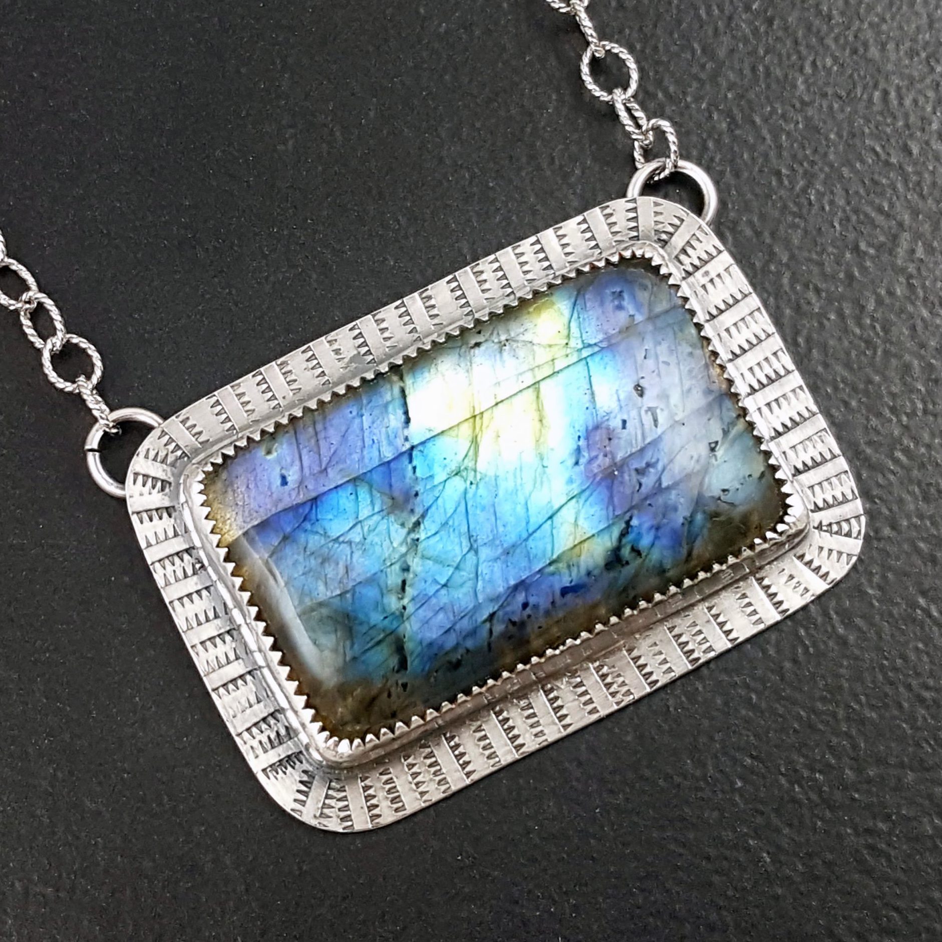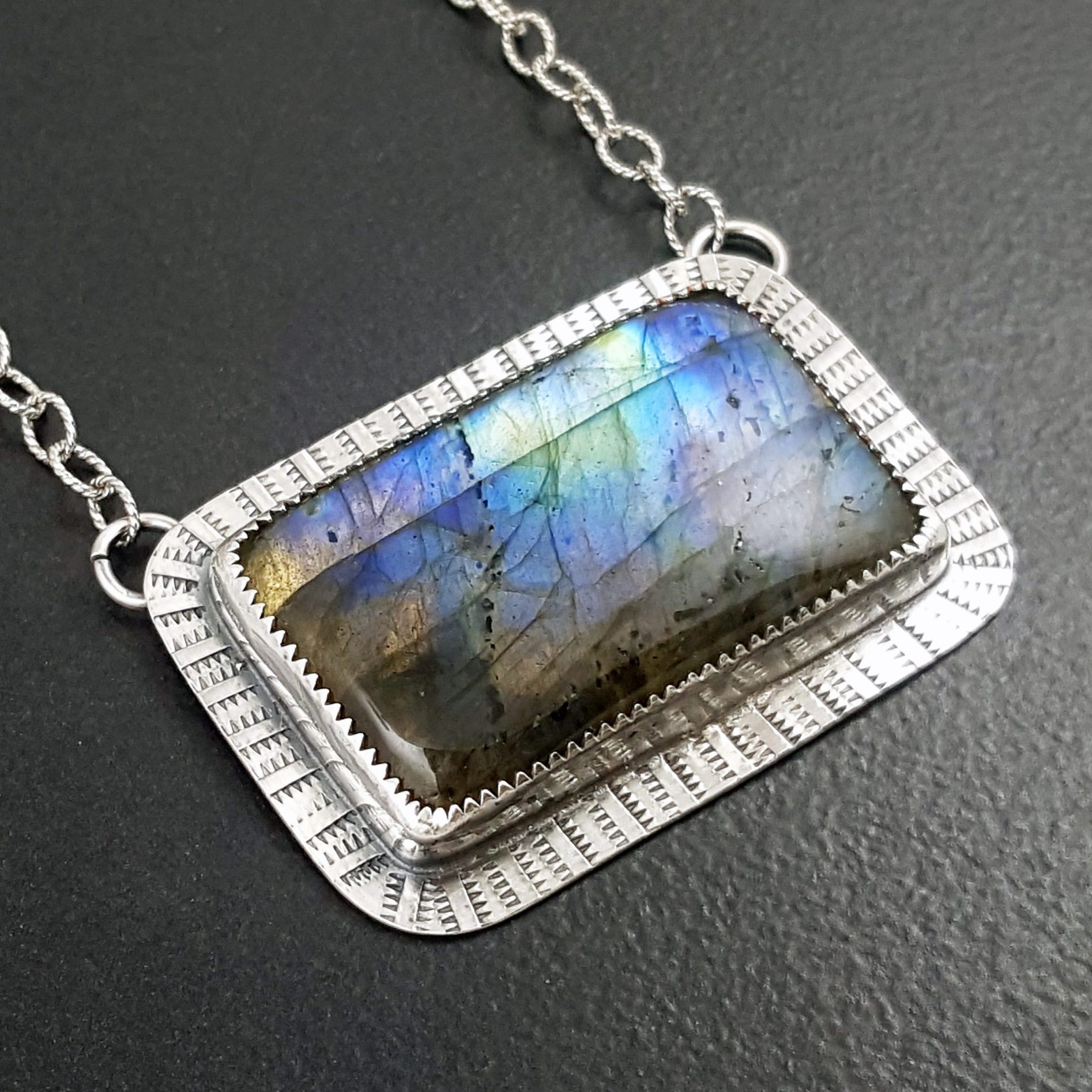 A high quality Labradorite is combined with sterling silver to create this piece. The necklace is hand stamped and oxidized to bring out the detail. The pendant measures approx 1.5″ wide by 1.25″ high and hangs from an adjustable 16-18″ sterling silver chain. This necklace is one of a kind and ready to ship. If you think the flash is great in the photos, wait until you see it in person!