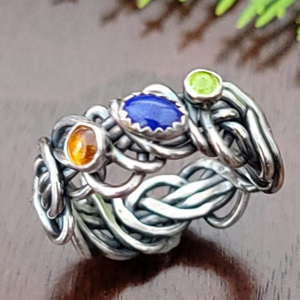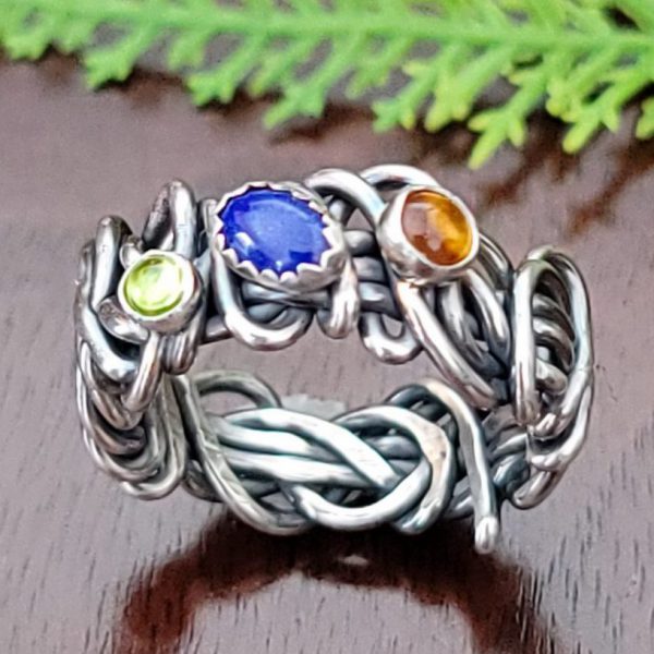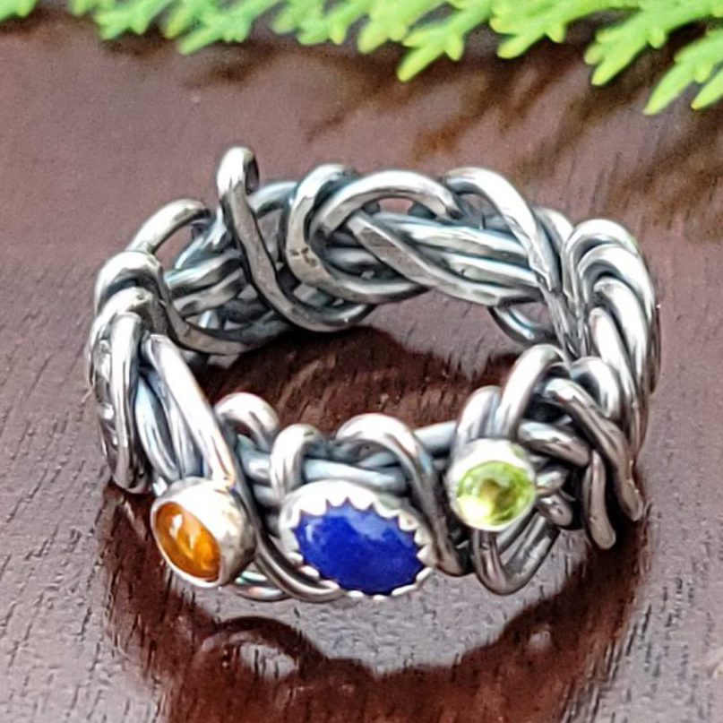 Sterling silver has been combined with lapis, citrine, and peridot to create this ring. It is a size 7 and ready to ship.