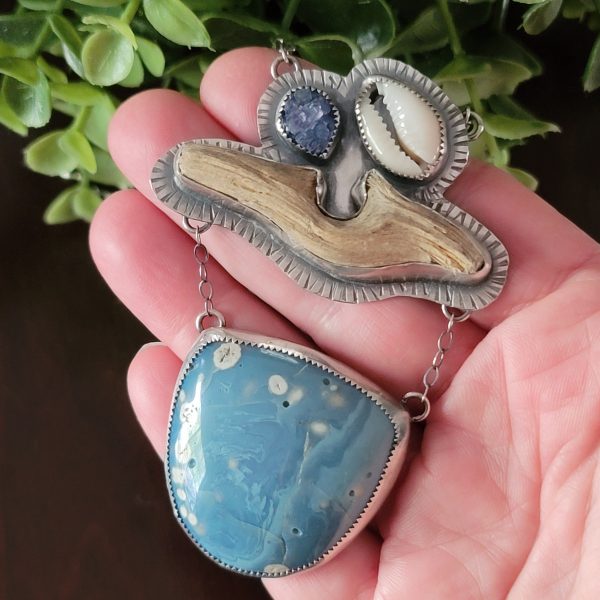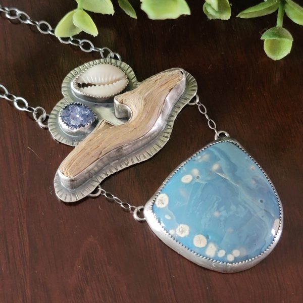 Leland blue, cowrie shell, blue druzy, found driftwood and sterling silver create this piece. The pendant measures approx 3.25″ long and hangs from an adjustable 18″ long chain. This piece is one of a kind and ready to ship.