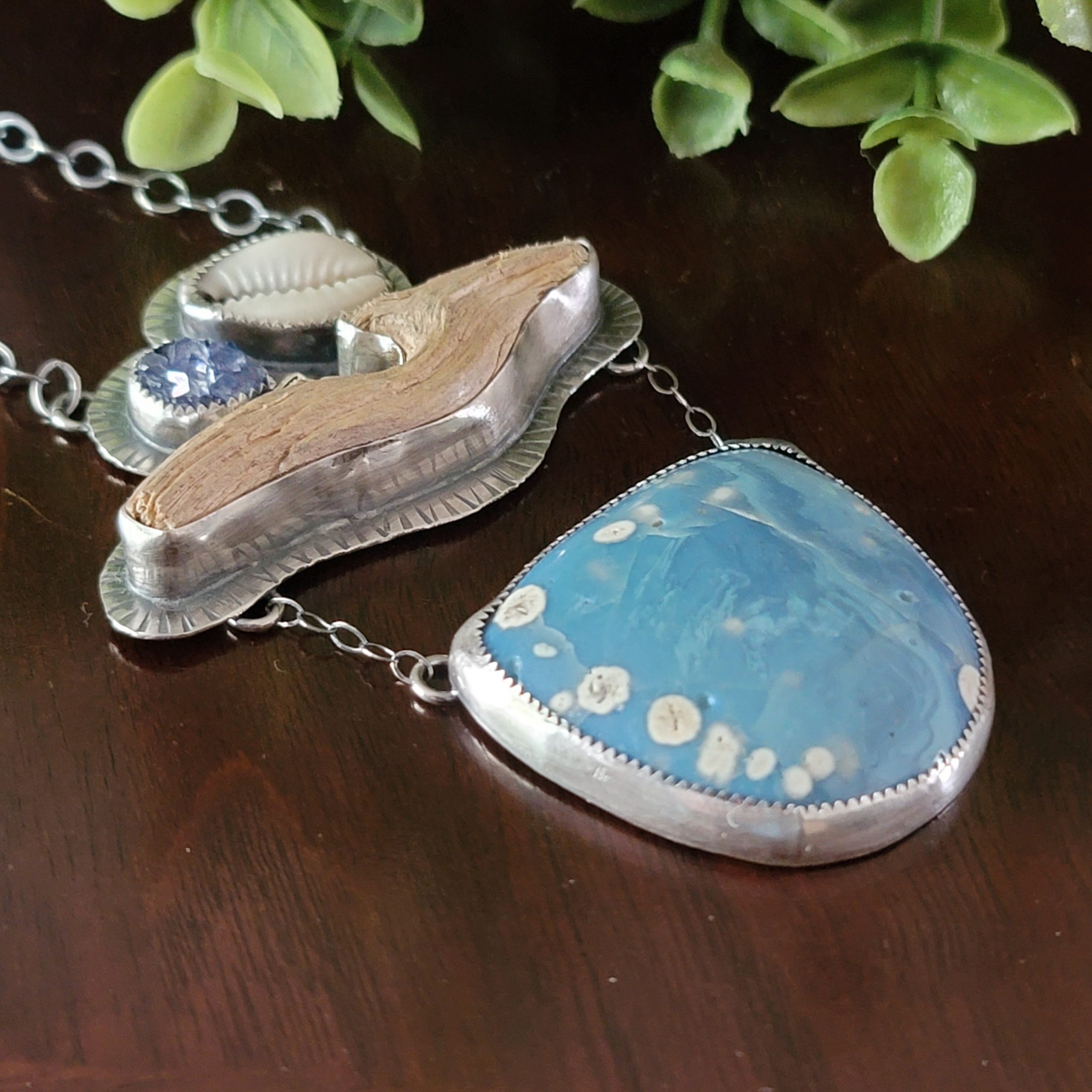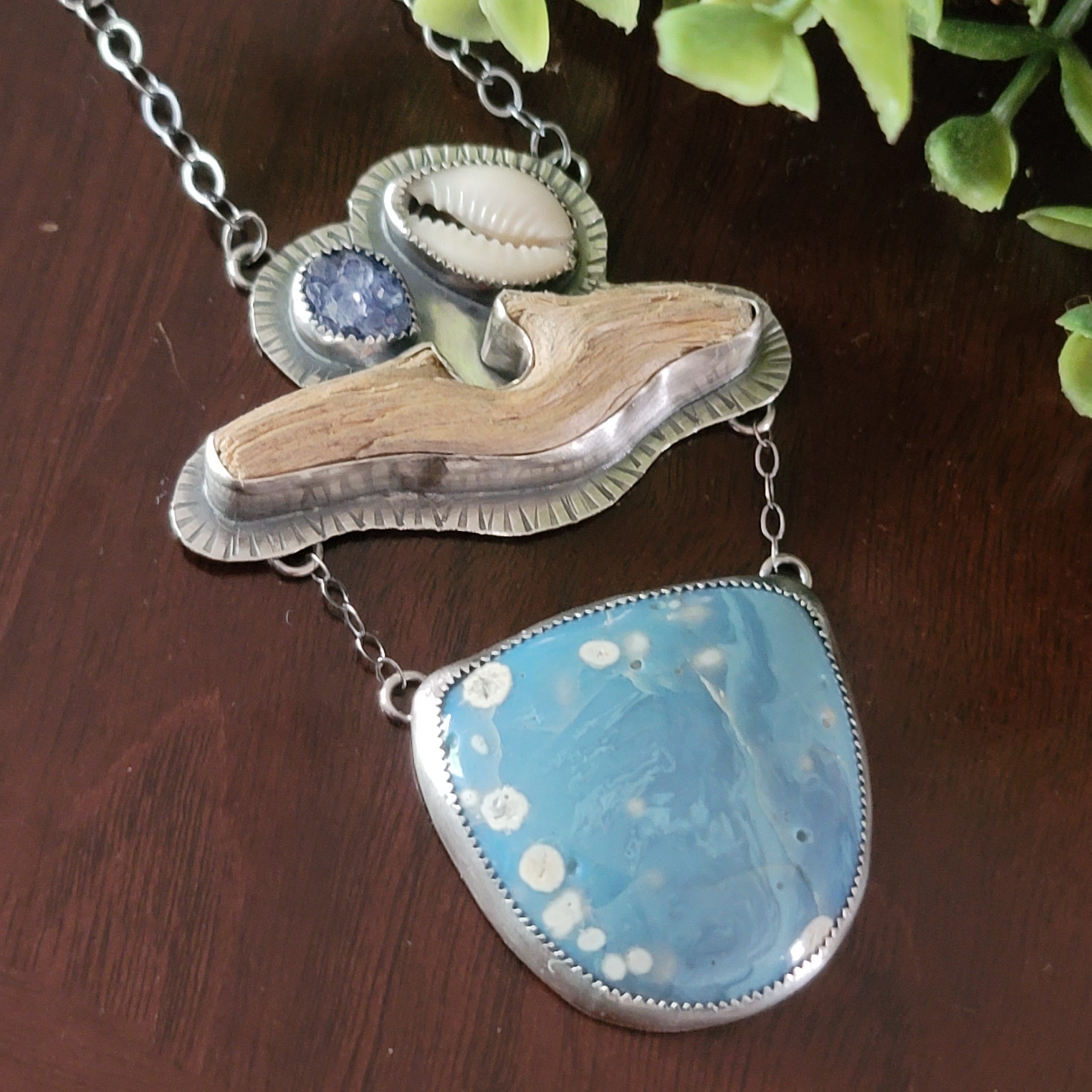 Leland blue, cowrie shell, blue druzy, found driftwood, sterling silver.