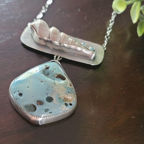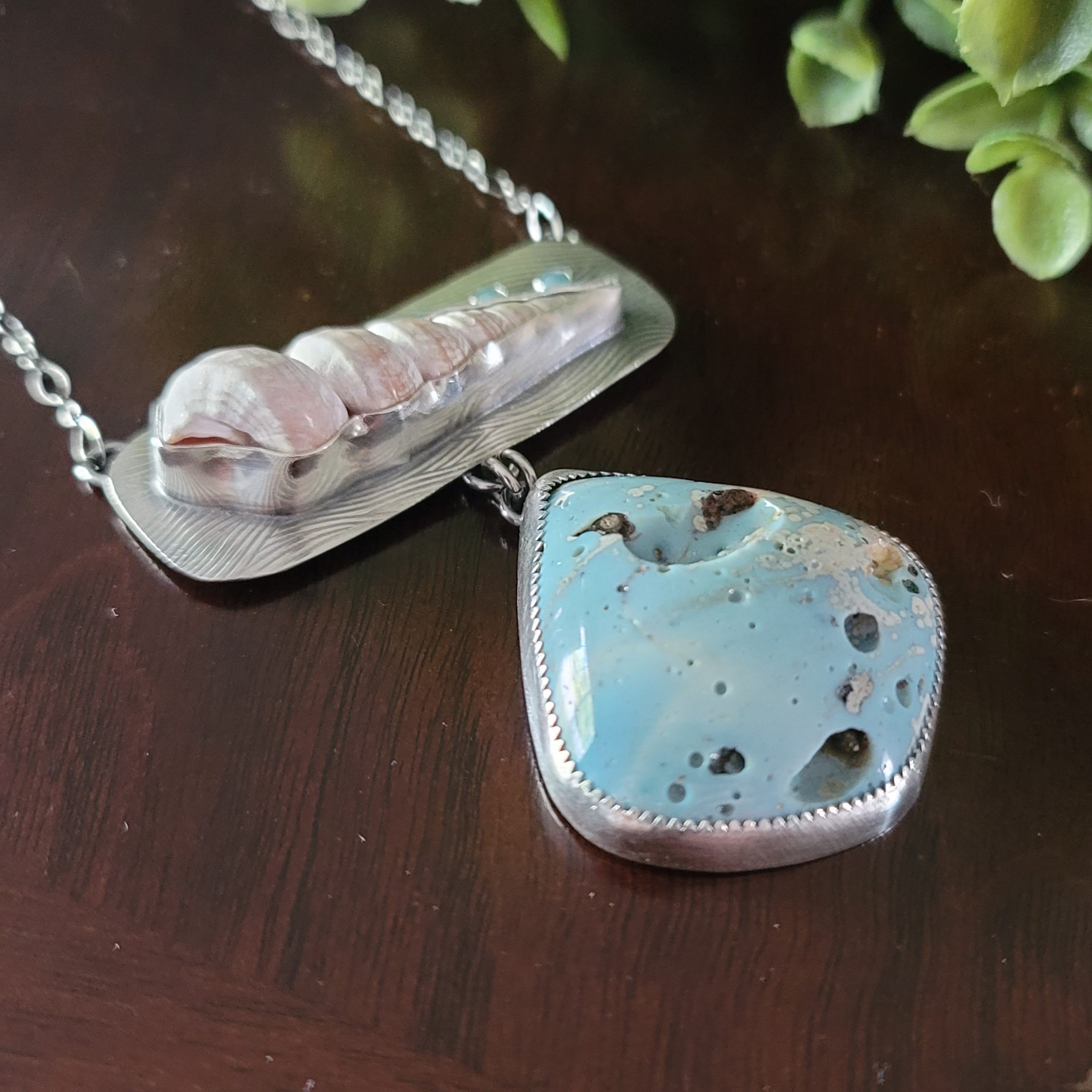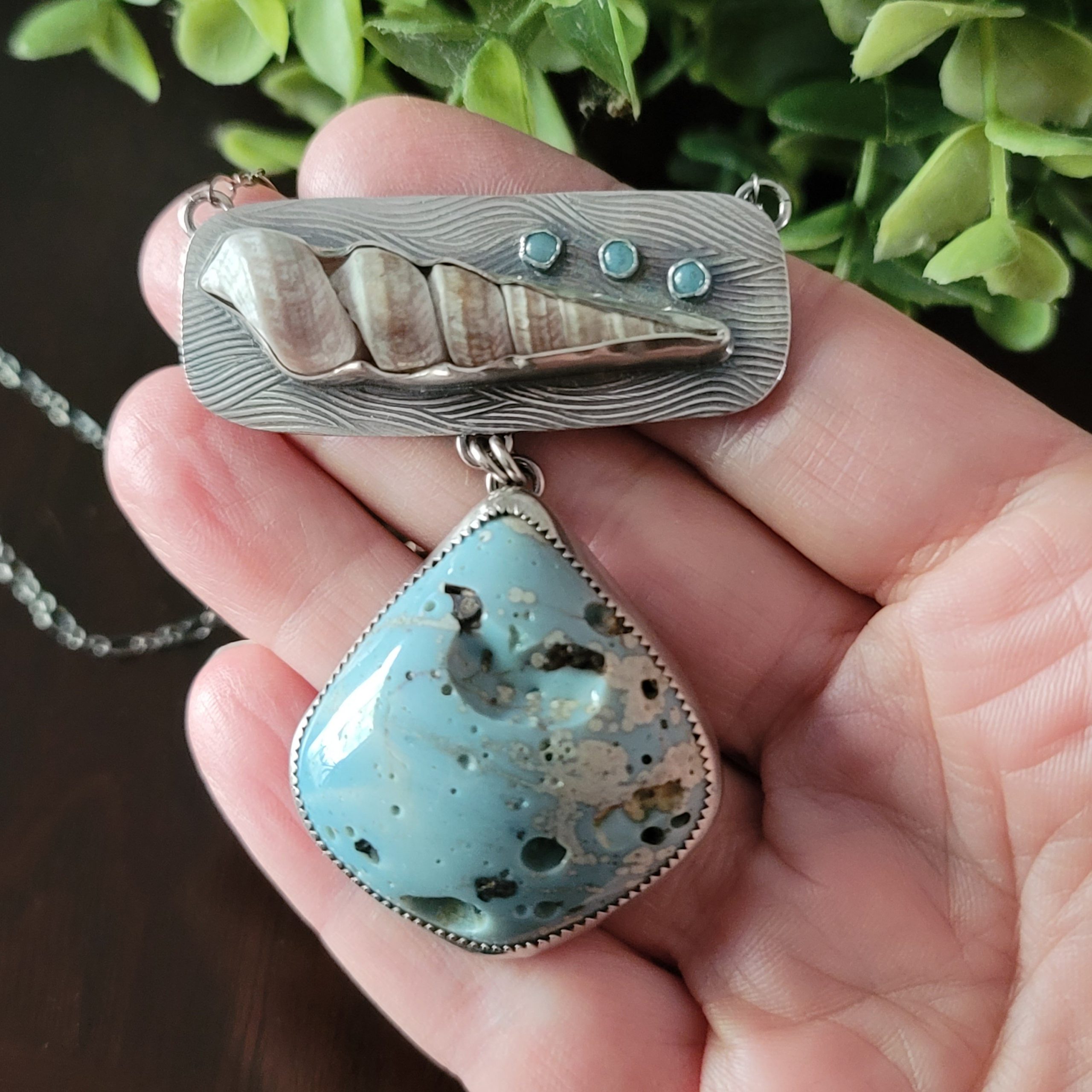 Leland blue, Chinese amazonite, a found beach shell and oxidized sterling silver create this piece. The pendant measures approx 2.5″ long and hangs from an adjustable 18″ chain. This piece is one of a kind and ready to ship.