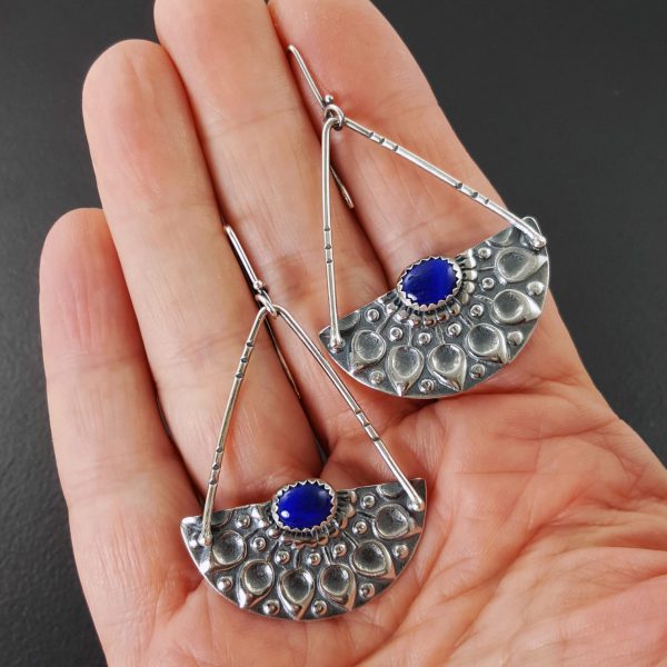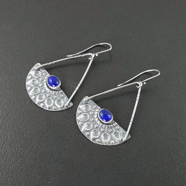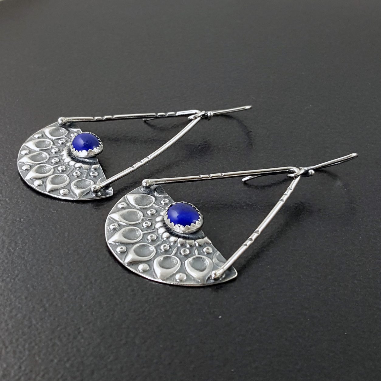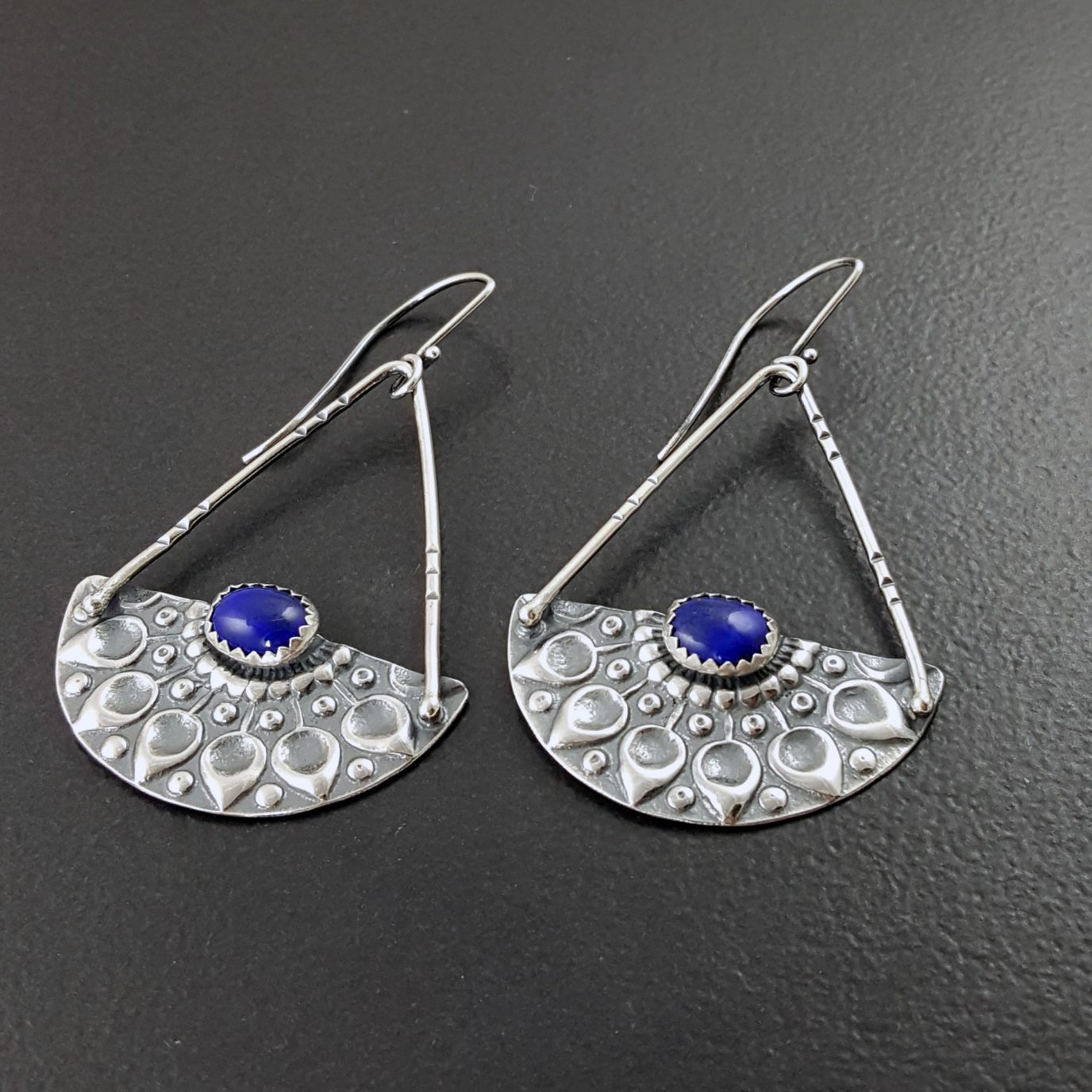 Lapis combined with oxidized sterling silver. I hammered the sterling into vintage dies from India to create the mandala pattern. The earrings are approx 2″ long from the top of the ear wire to the bottom of the earring. These are a made to order item and will take some time to make before they ship.