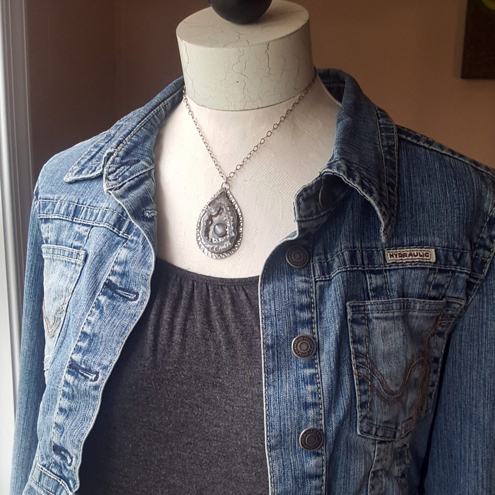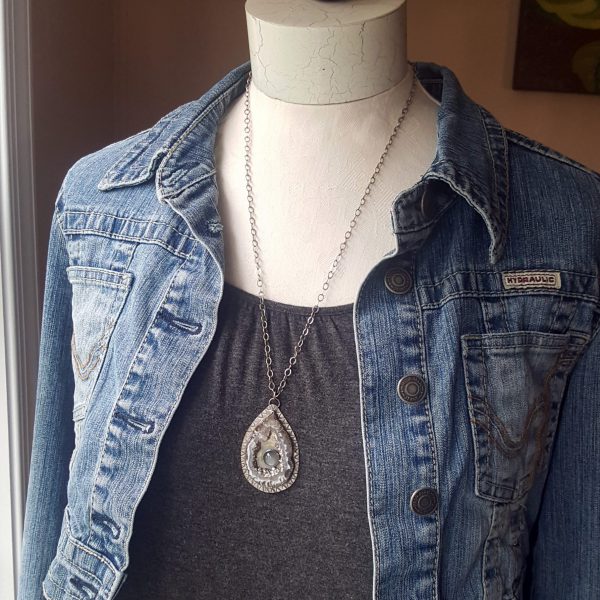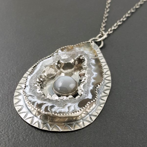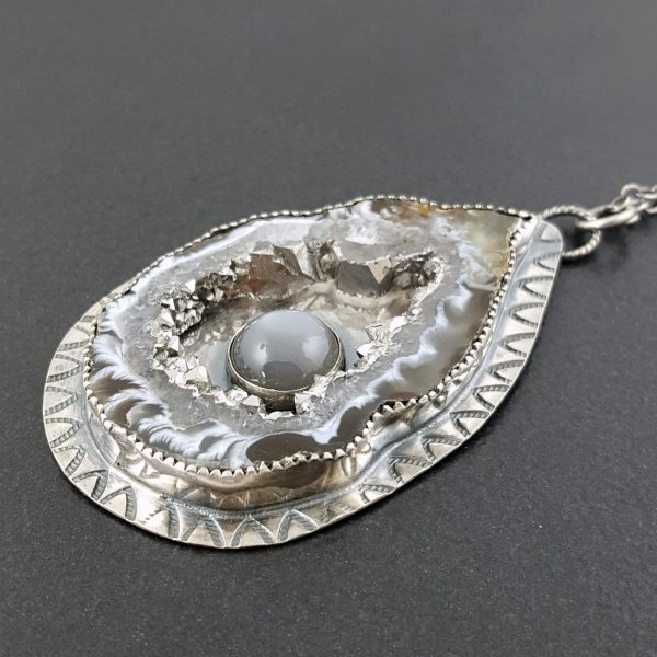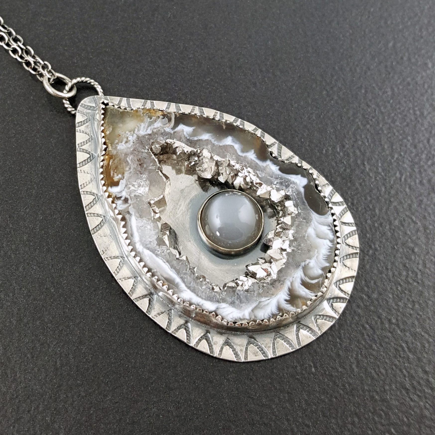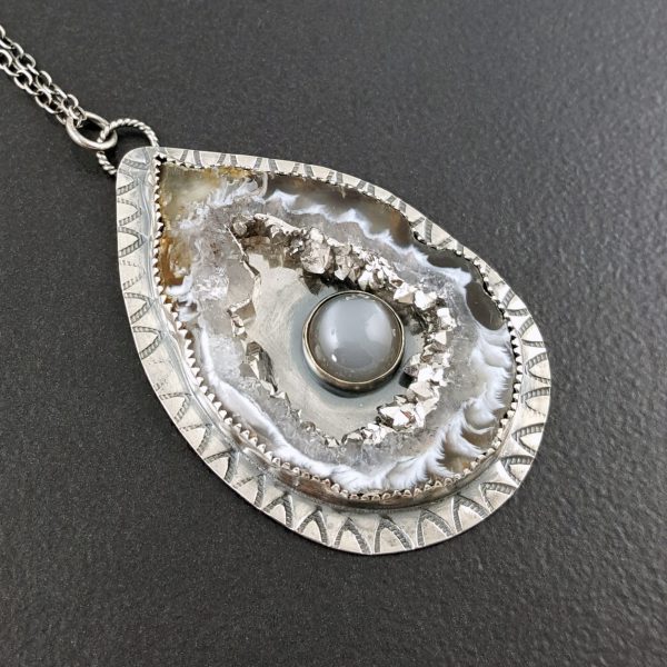 Platinum plated Occa agate druzy slice and silver moonstone combined with oxidized and textured sterling silver. The pendant measures 2 1/4″ long and is 1 1/2″ wide. It hangs from an adjustable 16-18″ chain. This item is one of a kind and ready to ship.