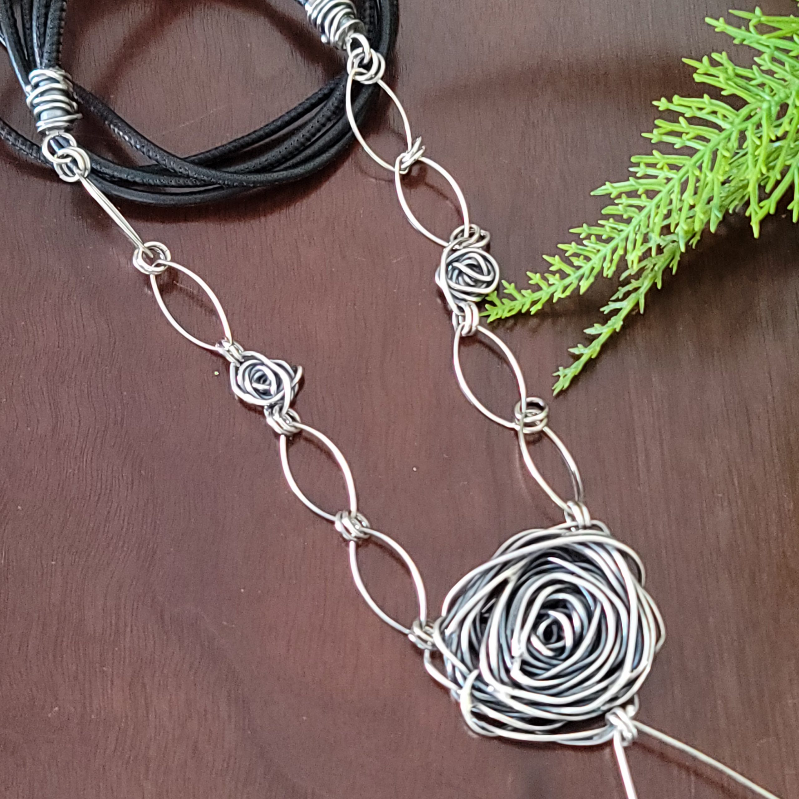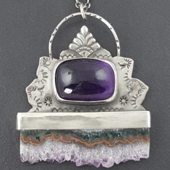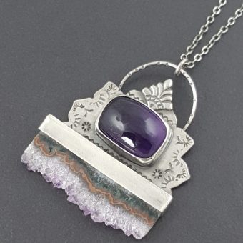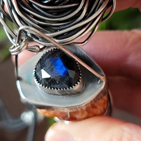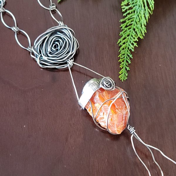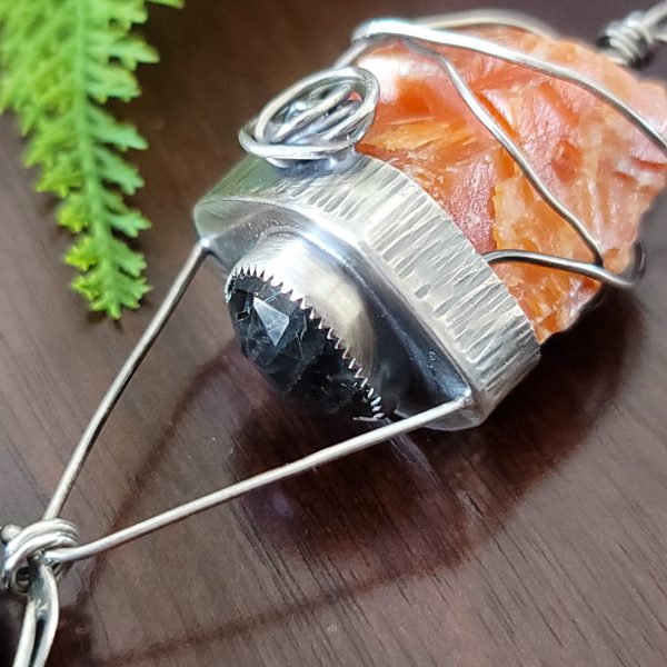 Sterling silver, orange calcite and labradorite create this statement necklace. It is oxidized to bring out the detail. The pendant itself measures approx 6″ long. It hangs from a part leather cord, which can be tied to adjust the length, and part handmade link chain. The total length is 29″ long. There is no rhyme or reason when I make these pieces. I just twist and bend the metal until I like what I see.