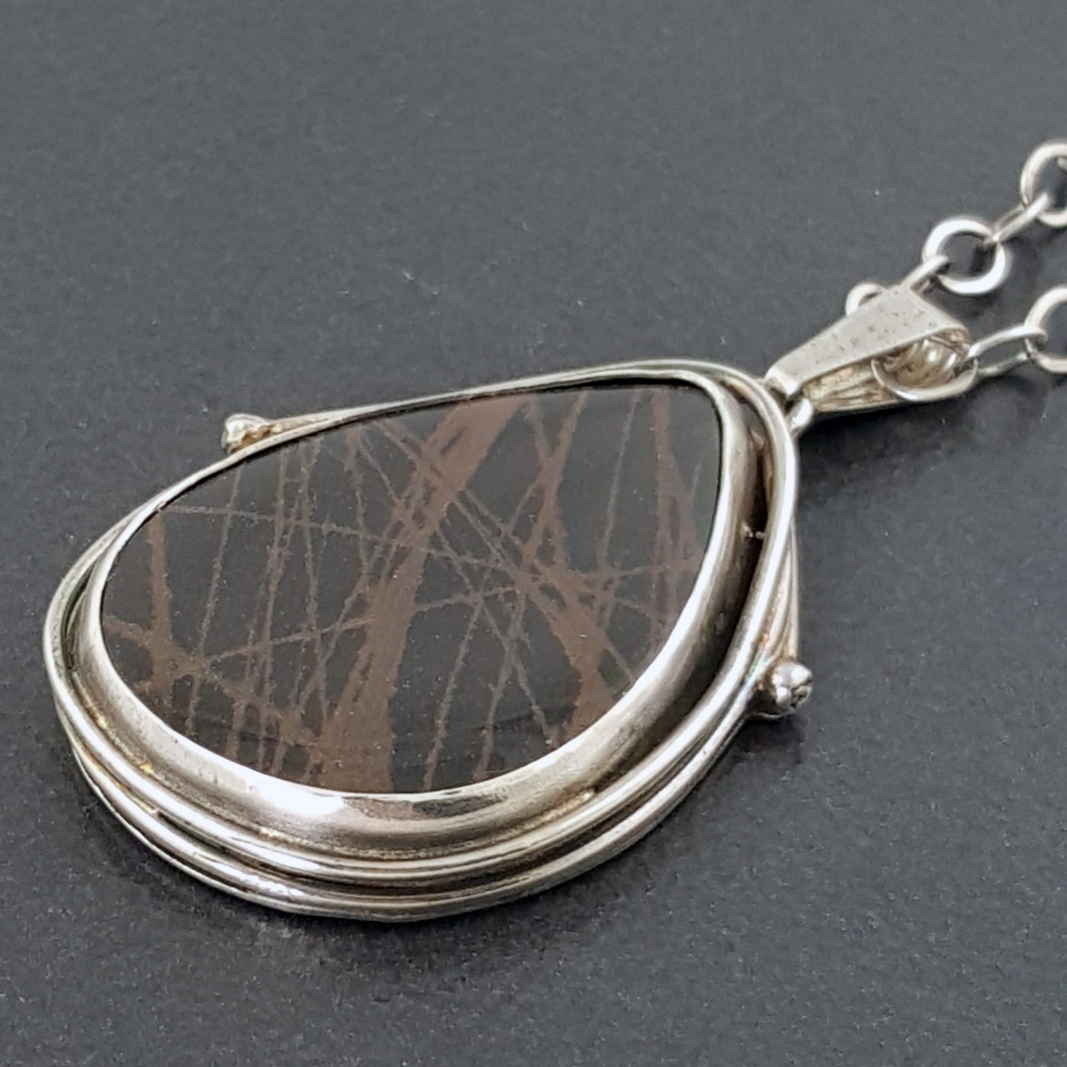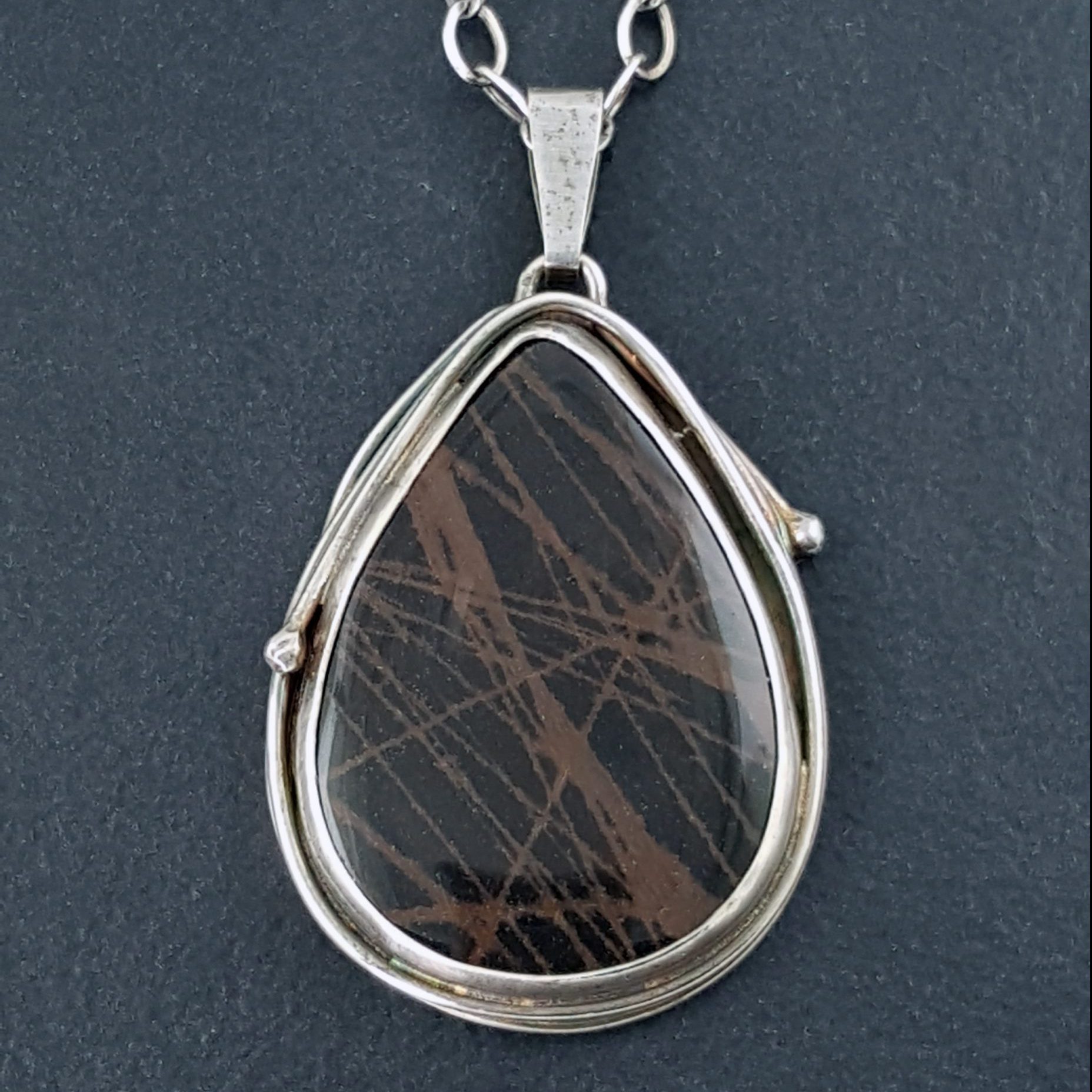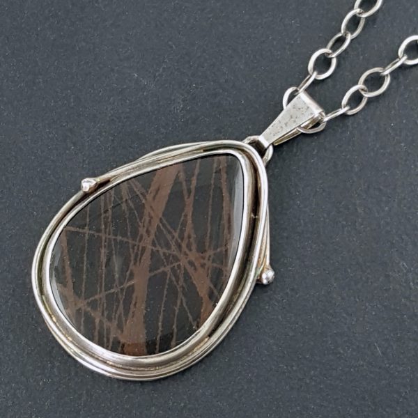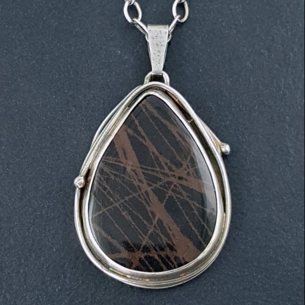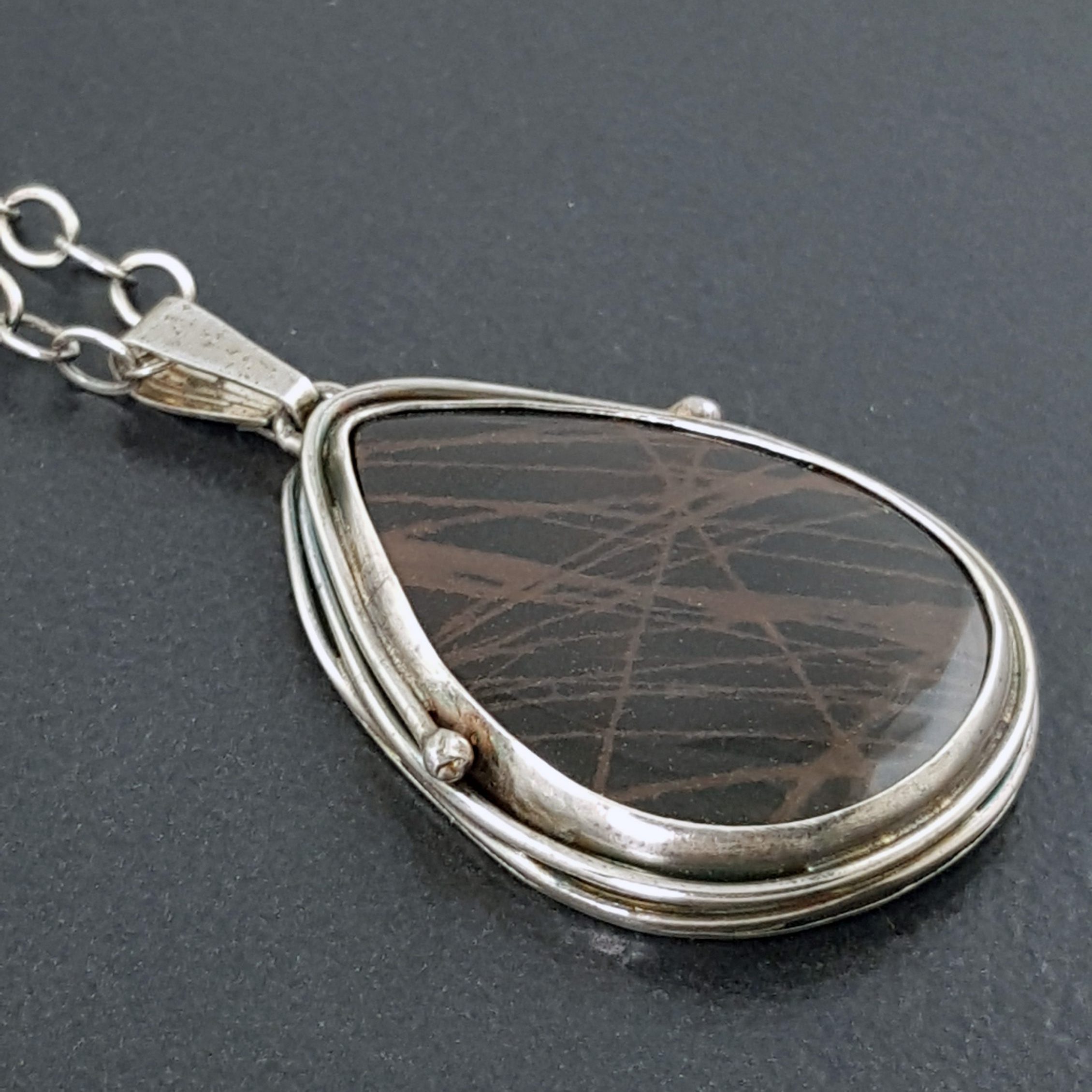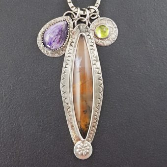 Picasso jasper and oxidized sterling silver create this piece. It measures approx 1 1/2″ long and hangs from an adjustable 24″ sterling silver chain. This necklace is one of a kind and ready to ship.