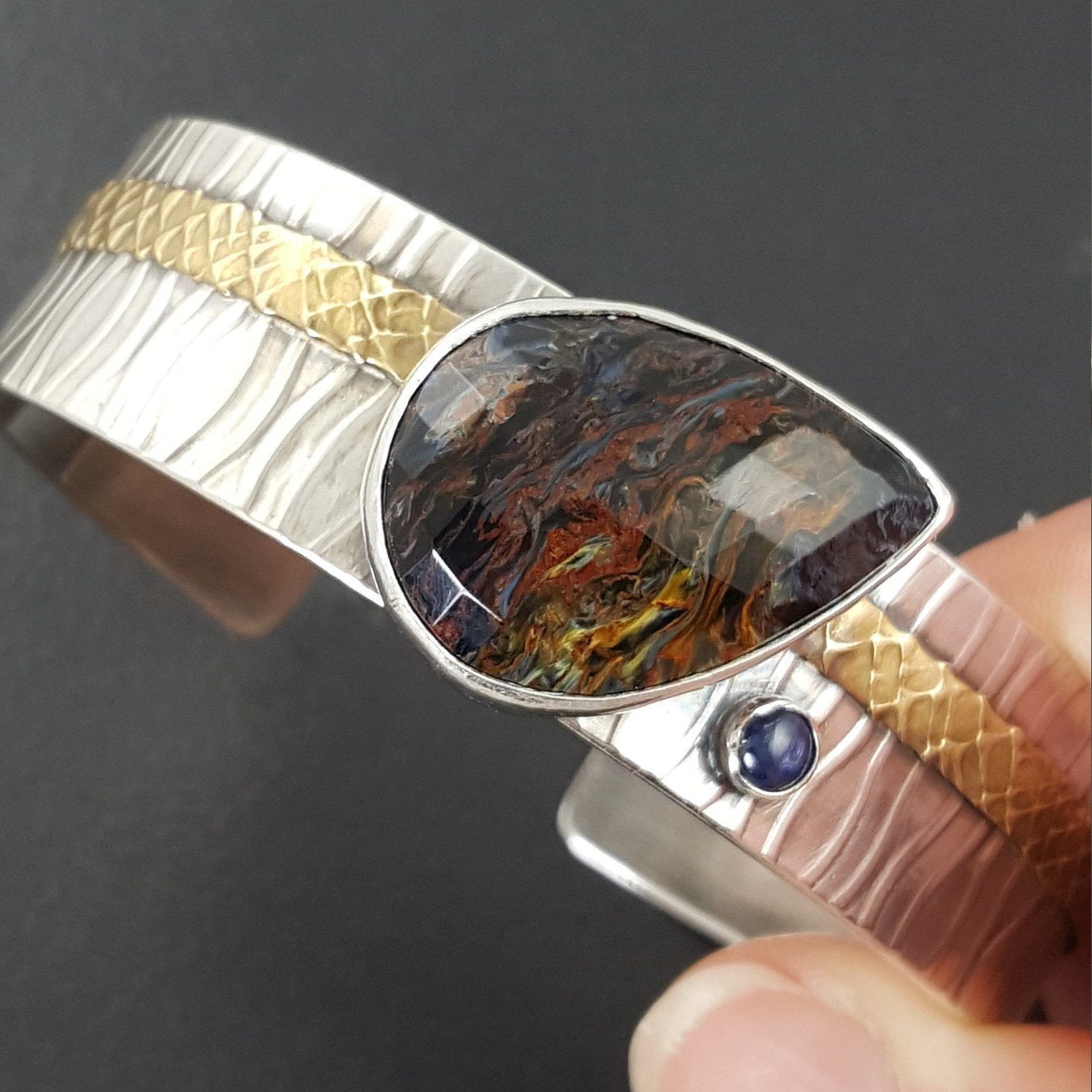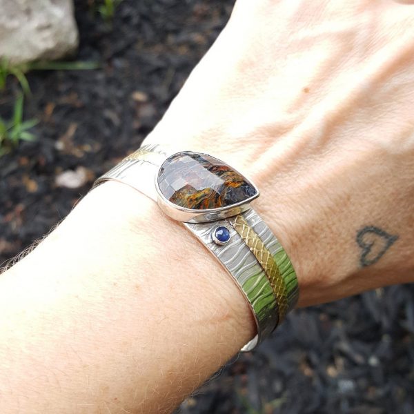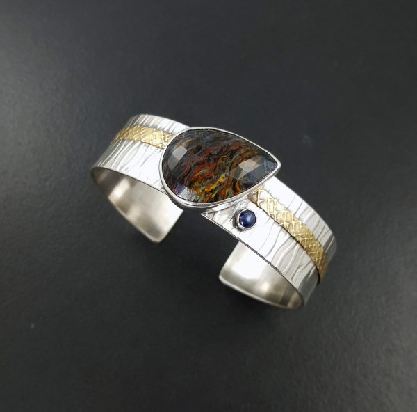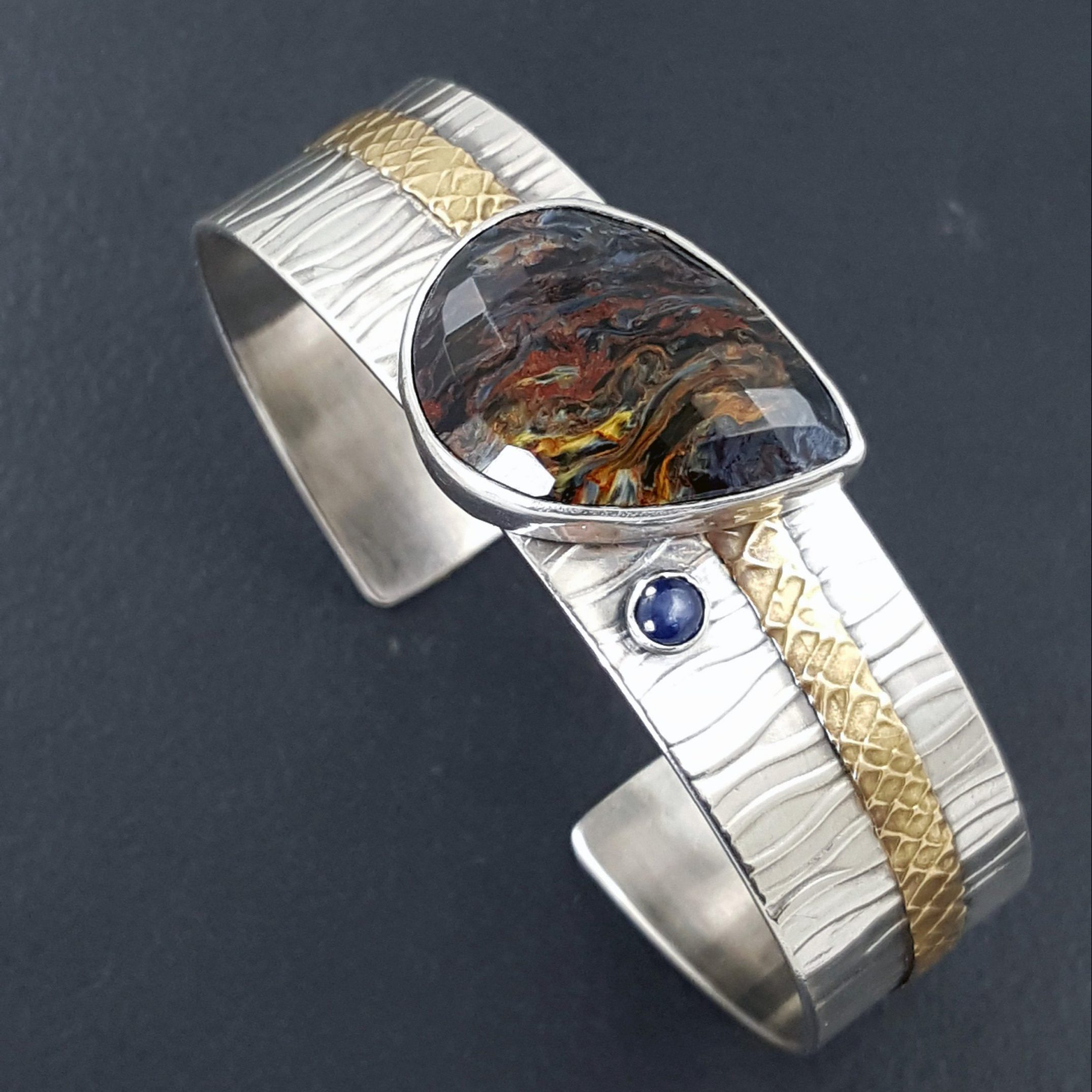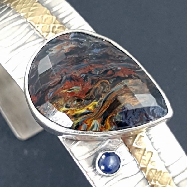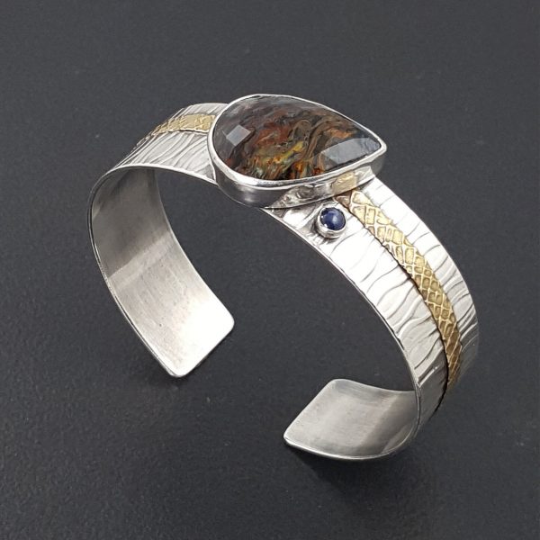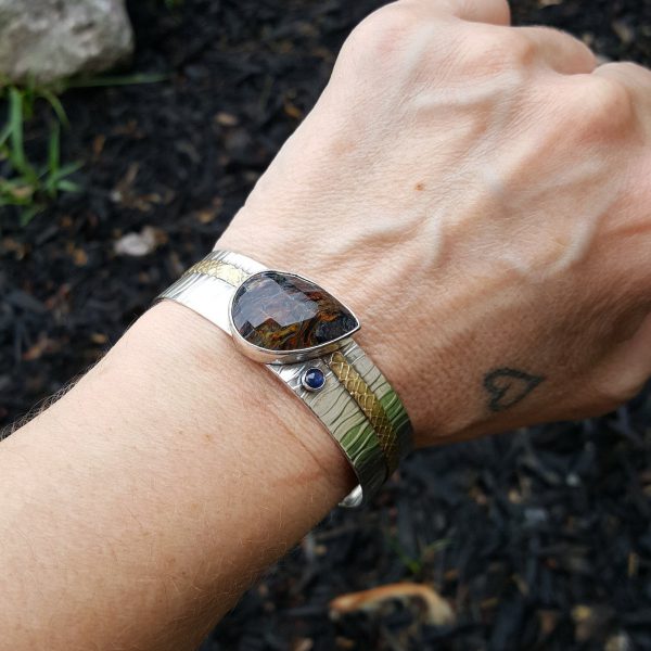 Faceted Pietersite and blue Sapphire combined with textured and oxidized bronze and sterling silver. The cuff is 5/8″” wide and is adjustable and fits most wrist sizes.
