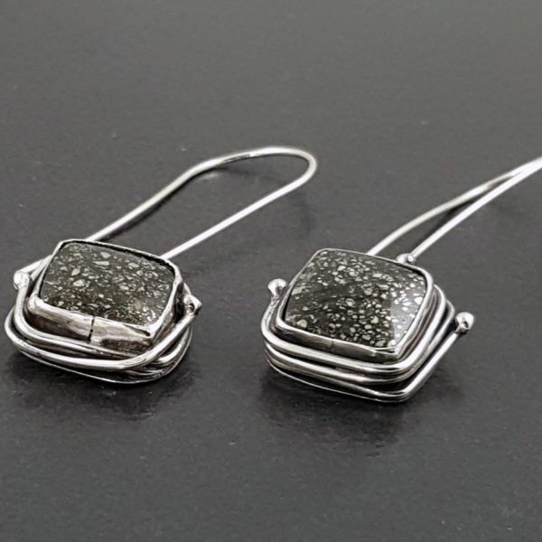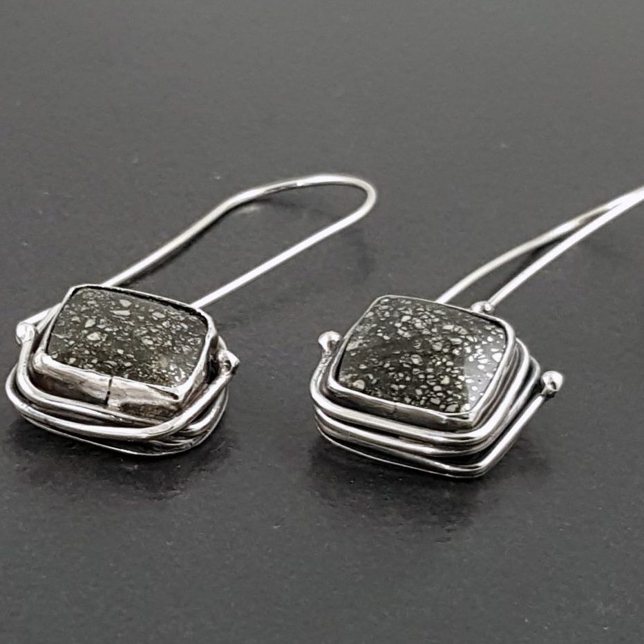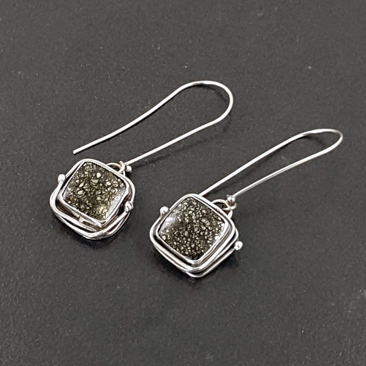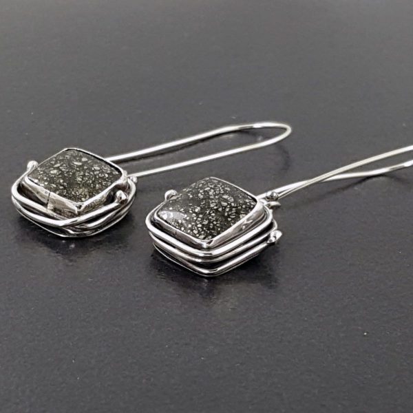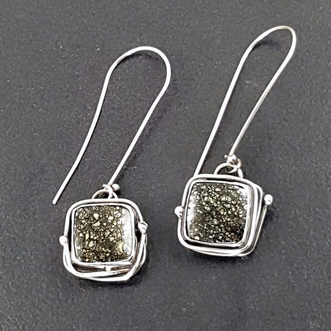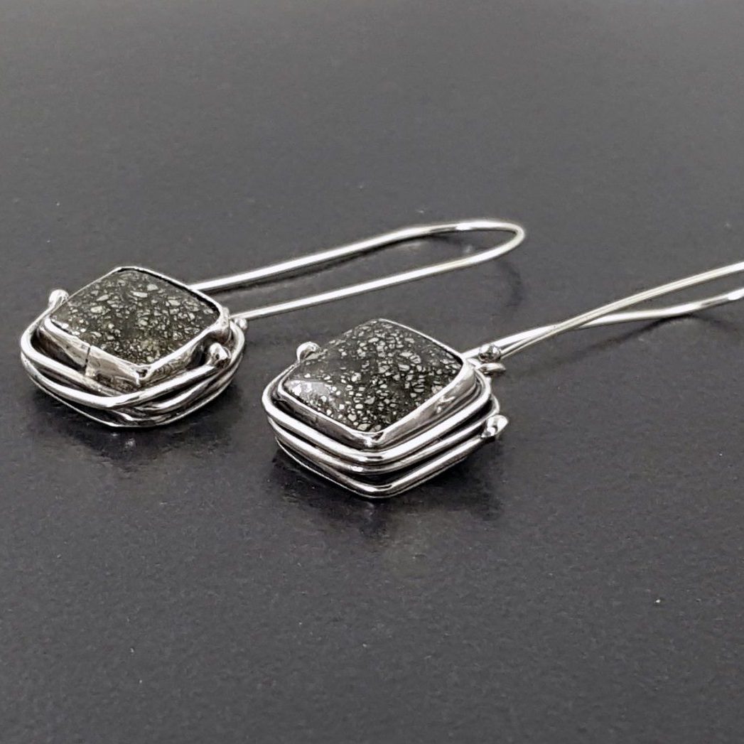 Pyrite wrapped in oxidized sterling silver. The earrings measure 2″ long and hang from hand made sterling silver ear wires. These earrings are one of a kind and ready to ship.