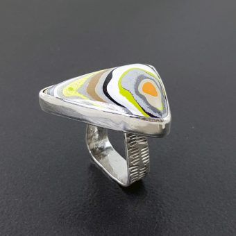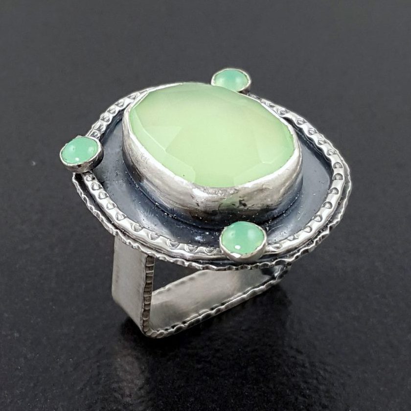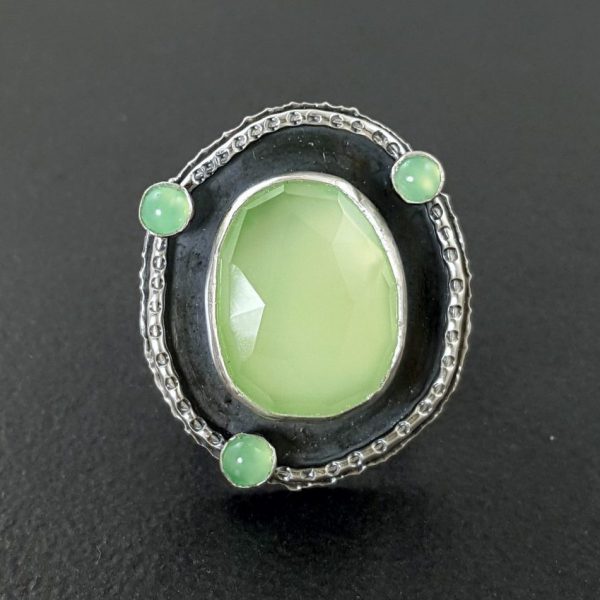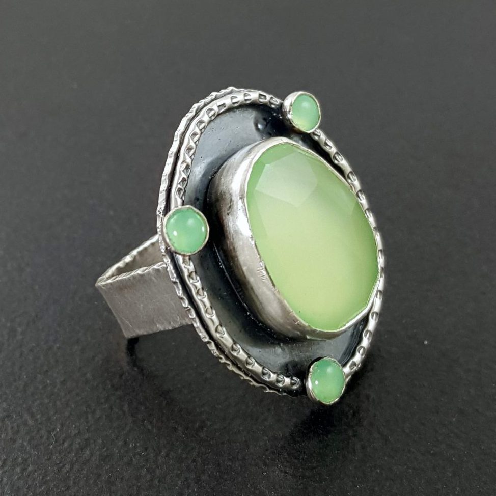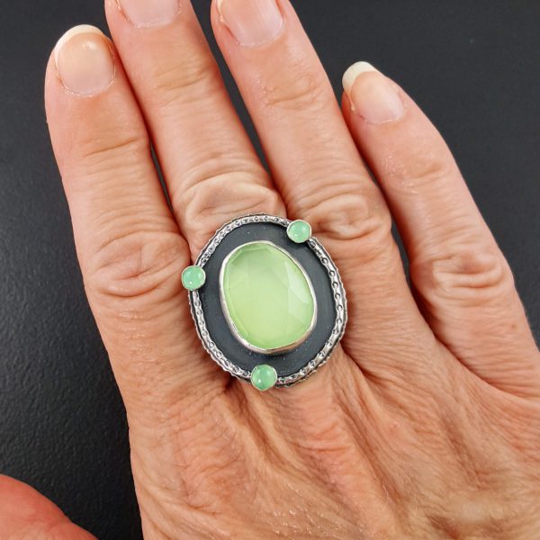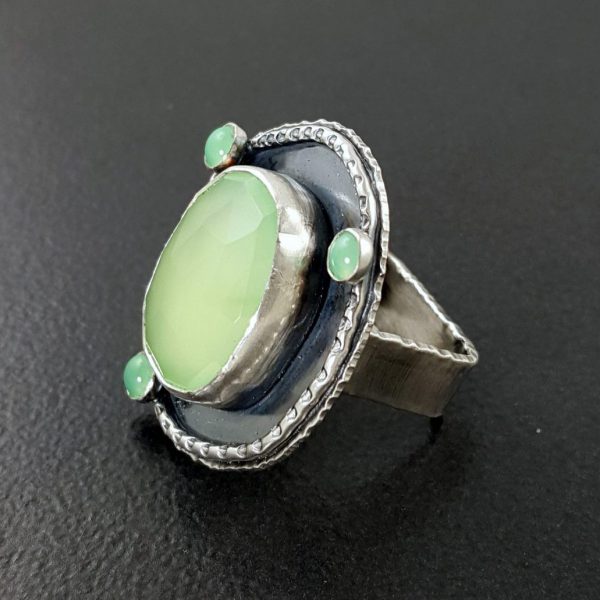 Rose cut green chalcedony combined with oxidized sterling silver and accented with small green chrysoprase stones. The ring measures approx 1.25″ long by 1″ across at its widest points. This handmade ring fits a size 7.5 thru a size 8 finger due to the shape of the band. Square bands are not only very comfortable to wear but they also keep the ring from spinning on your finger. This ring is one of a kind and ready to ship.