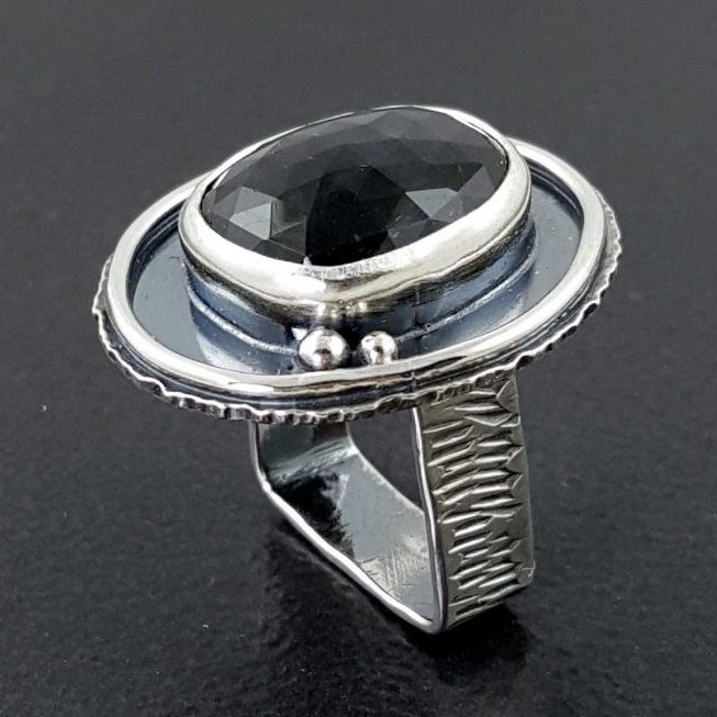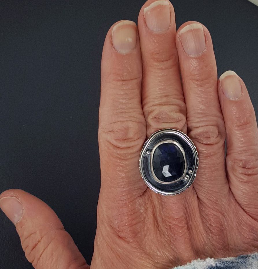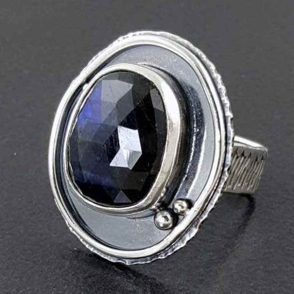 Rose cut labradorite combined with oxidized sterling silver. The ring measures approx 1.25″ long by 1″ across at its widest points. This handmade ring fits a size 7 thru a size 7.5 finger due to the shape of the band. Square bands are not only very comfortable to wear but they also keep the ring from spinning on your finger. This ring is one of a kind and ready to ship.