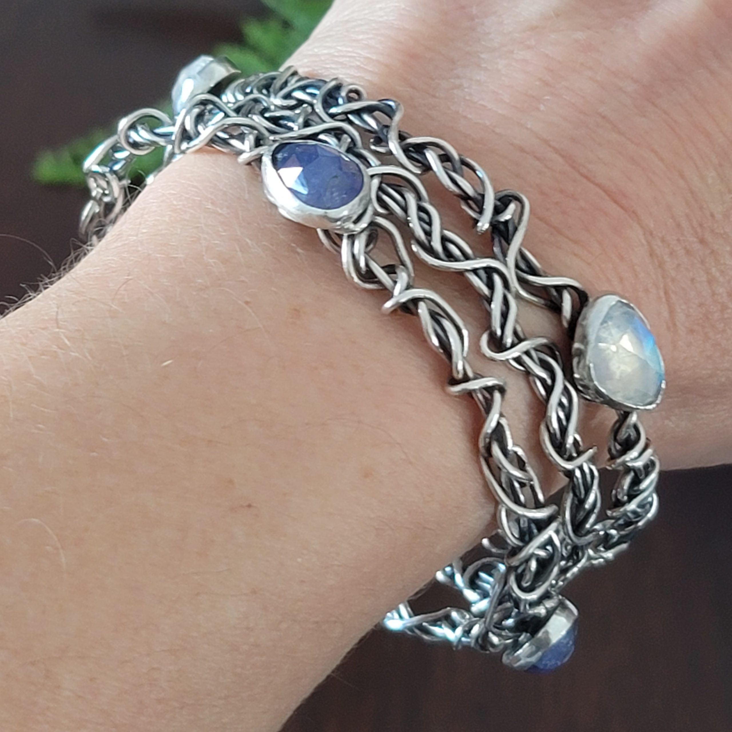 Oxidized sterling silver is twisted, wrapped, formed and soldered to create this bangle. It is set with three rose cut tanzanite stones. This bangle measures approx 2.5″ across and is approx 1/4″ wide. This item is one of a kind and ready to ship.