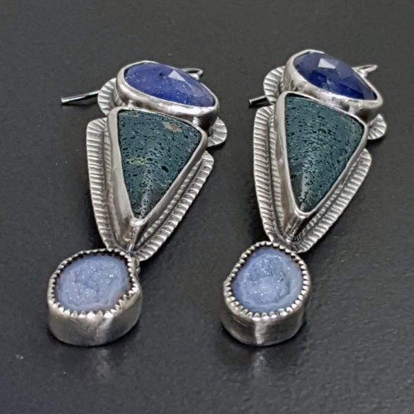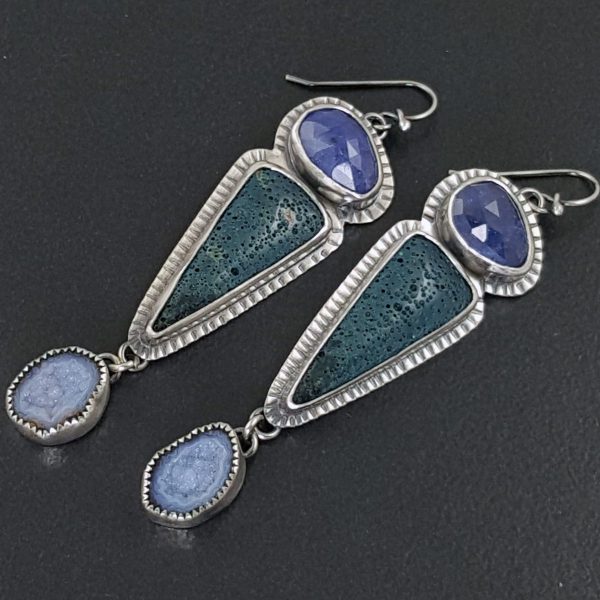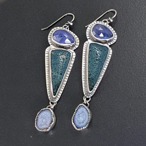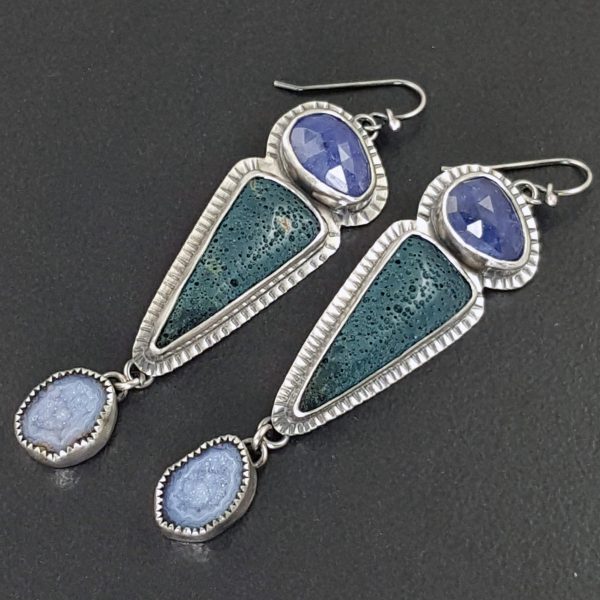 Muted colors but still eye catching! These earrings are great for everyday or dressing up! Rose cut tanzanite, leland blue and sparkling  pale blue geode halves come together with textured and oxidized sterling silver. The earrings are approx 3″ long from the top of the ear wire to the bottom of the earring. These earrings are one of a kind and ready to ship.