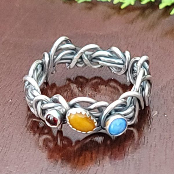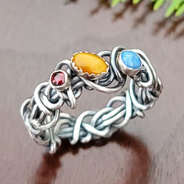 Sterling silver has been combined with tiger eye, denim lapis and garnet to create this ring. It is a size 10 and ready to ship.