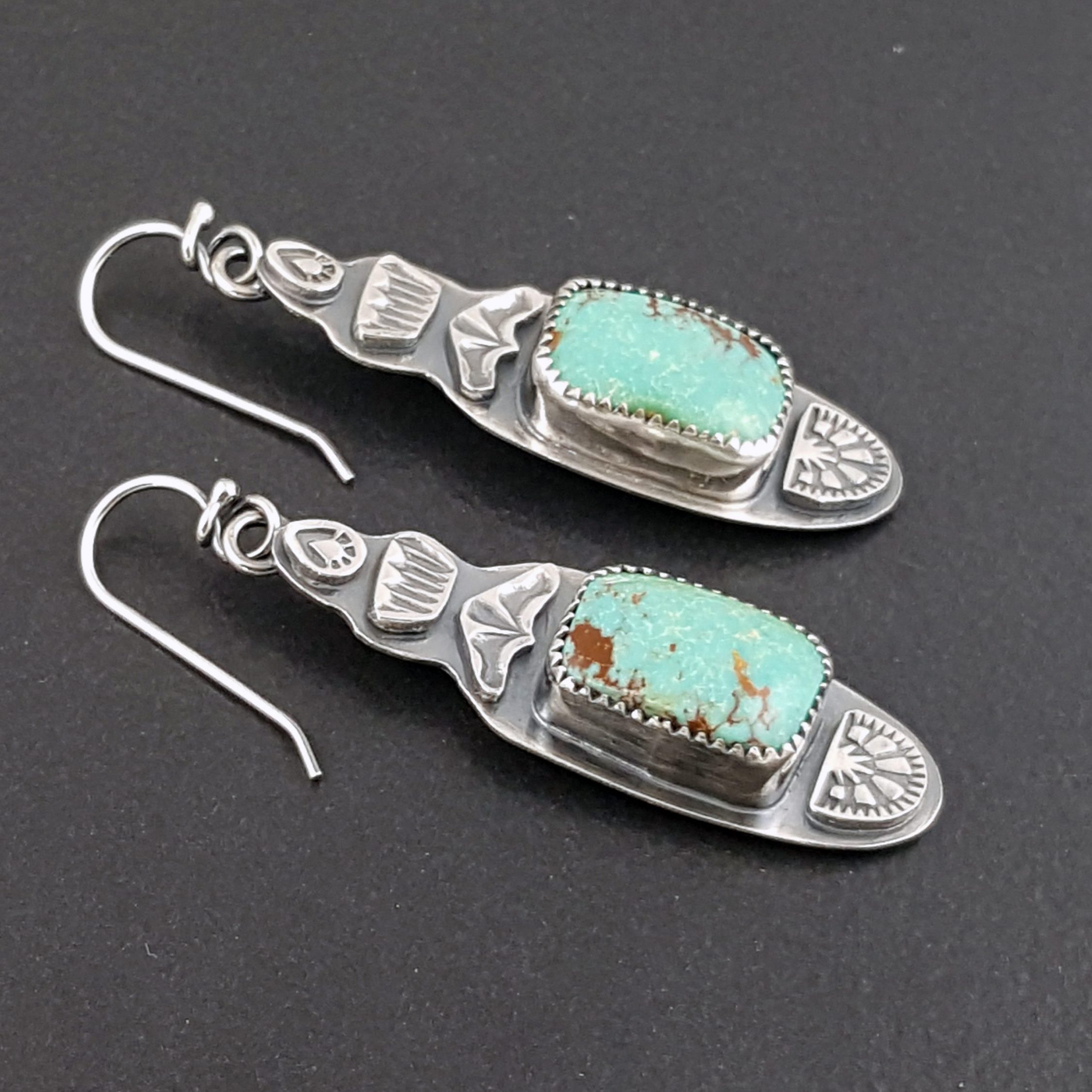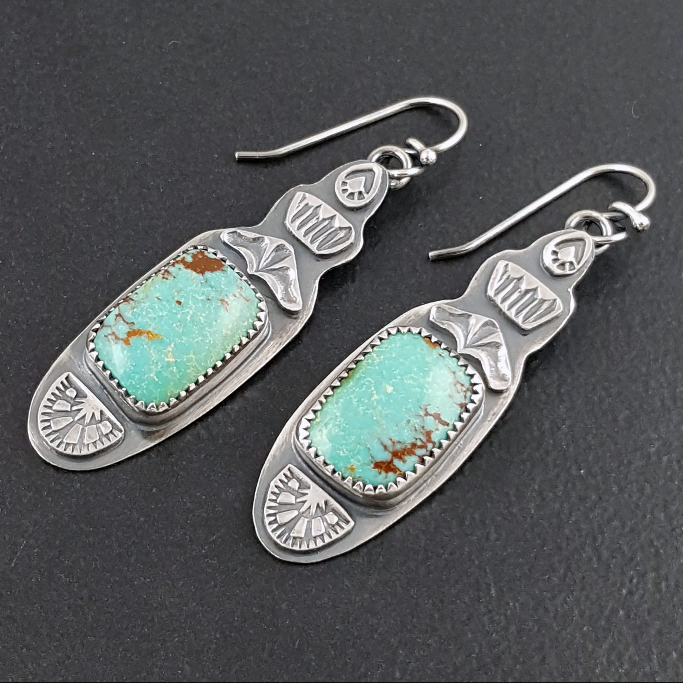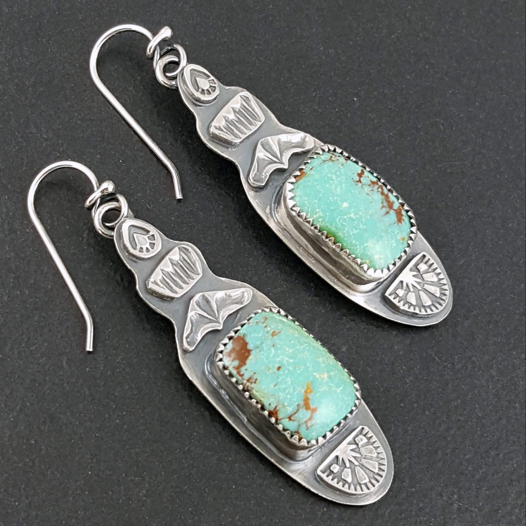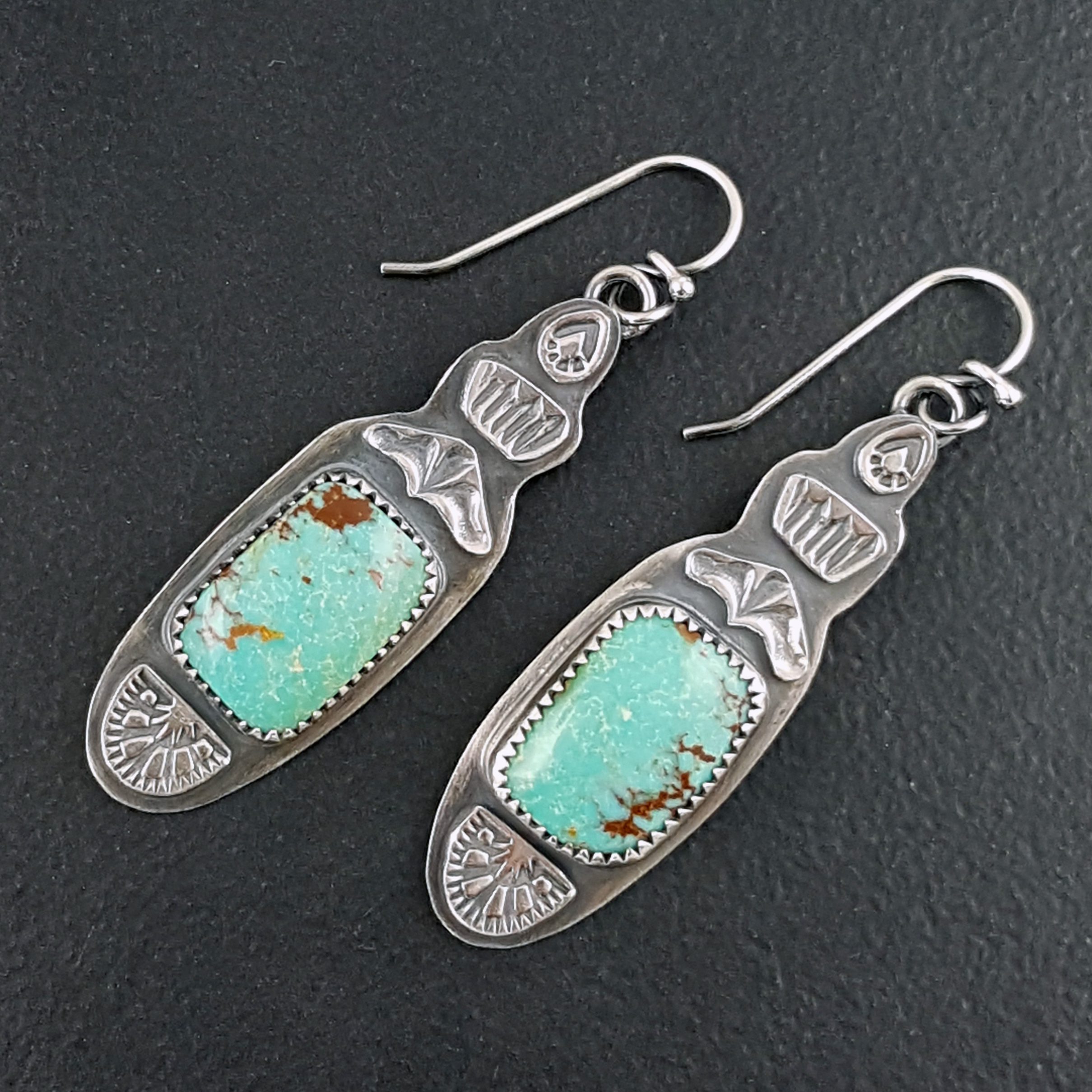 Old stock turquoise stones and stamped and oxidized sterling silver create these earrings. They measure approx 2″ long and hang from sterling silver ear wires. They are one of a kind and ready to ship.