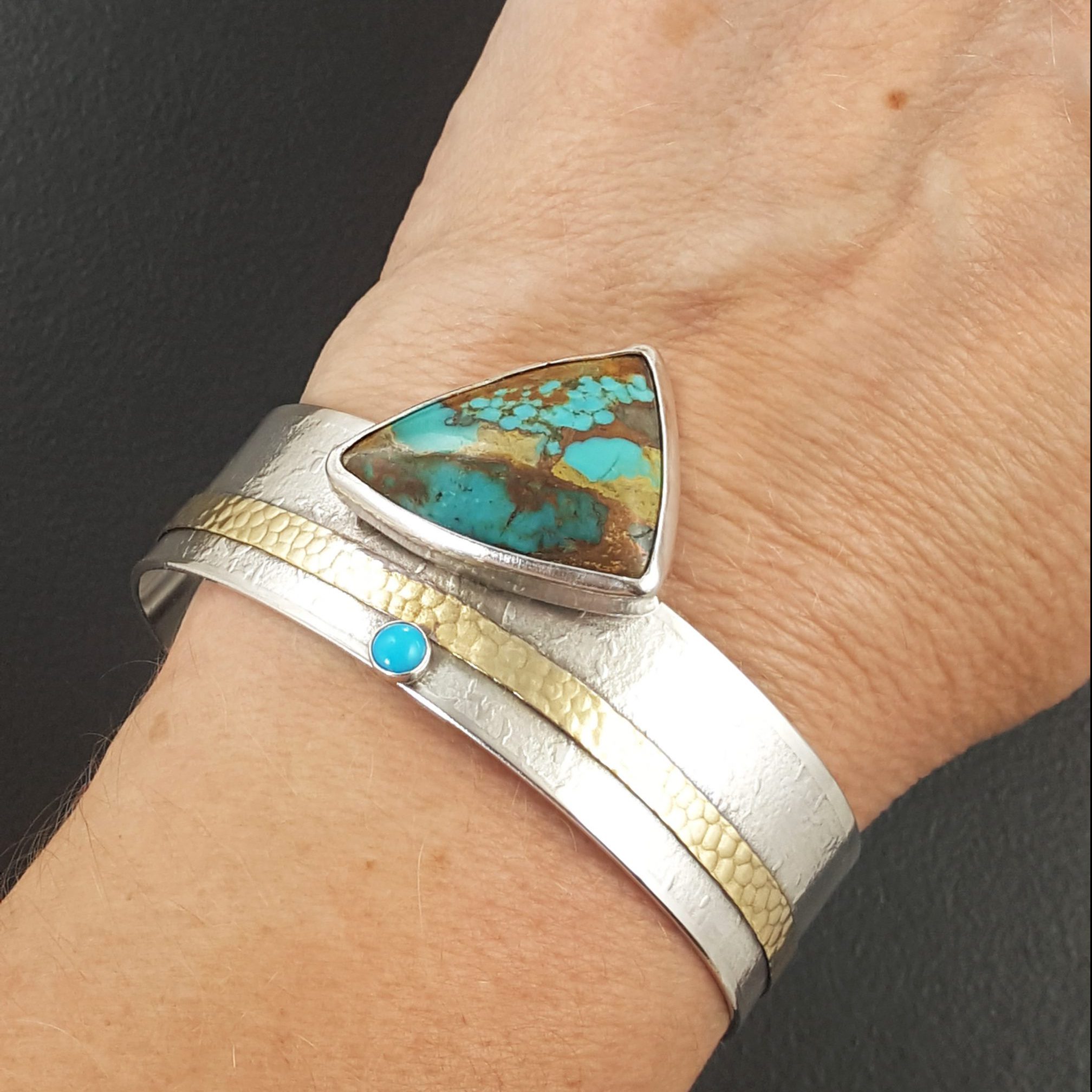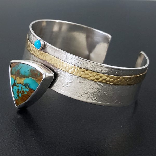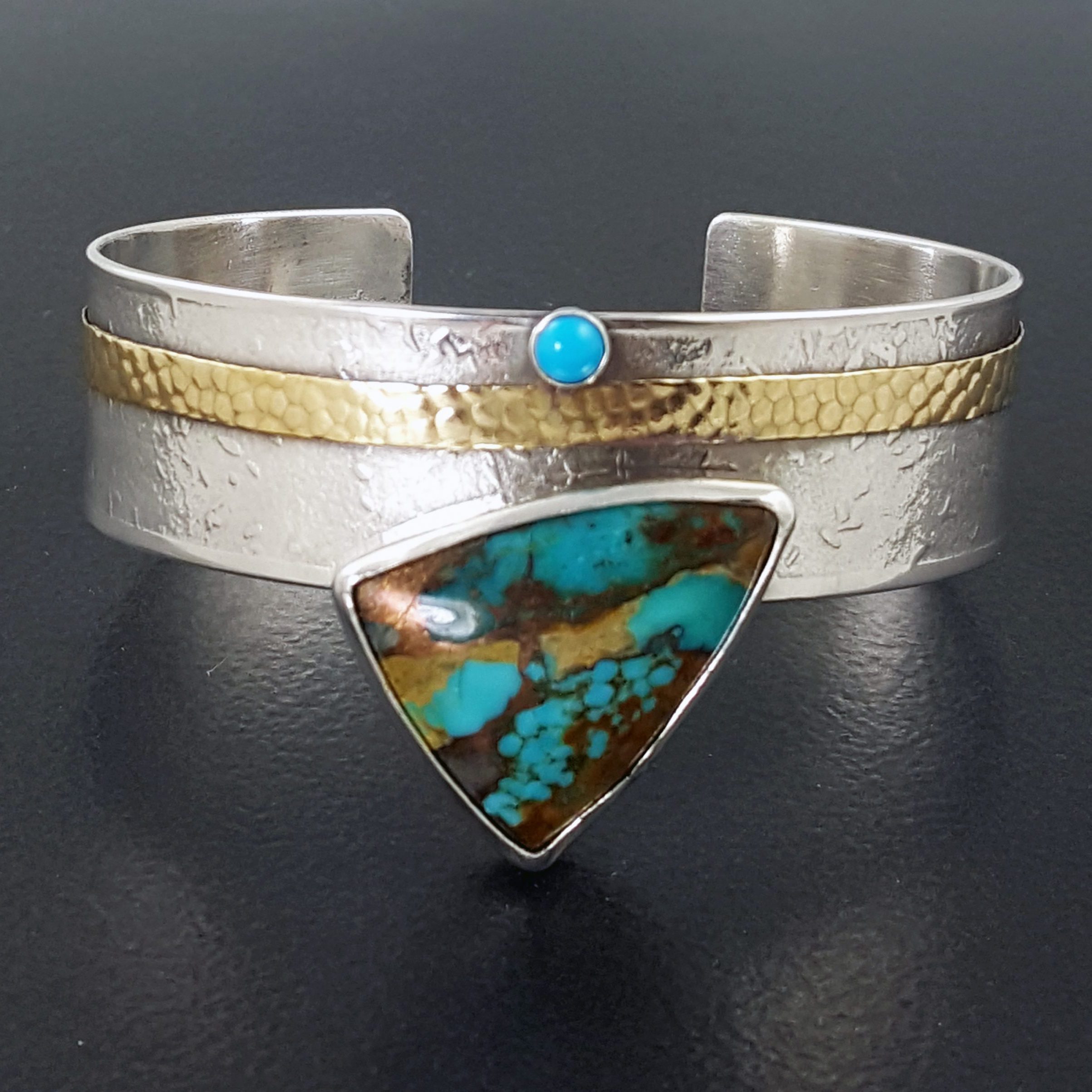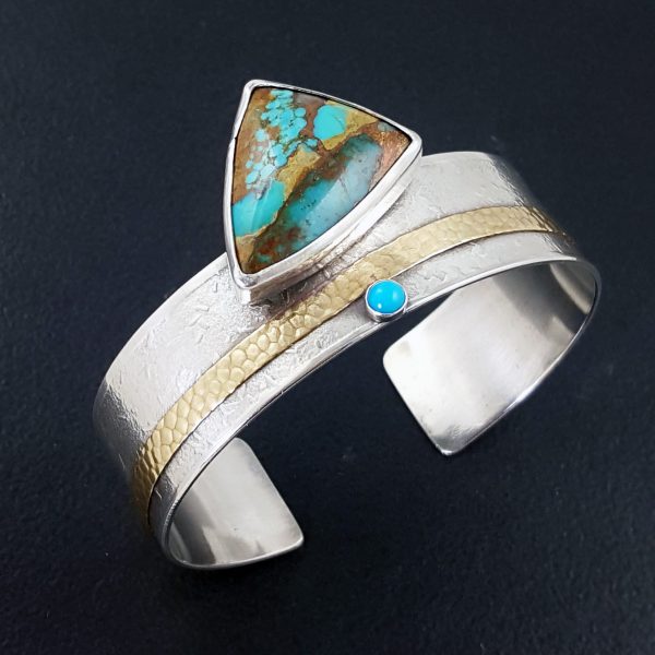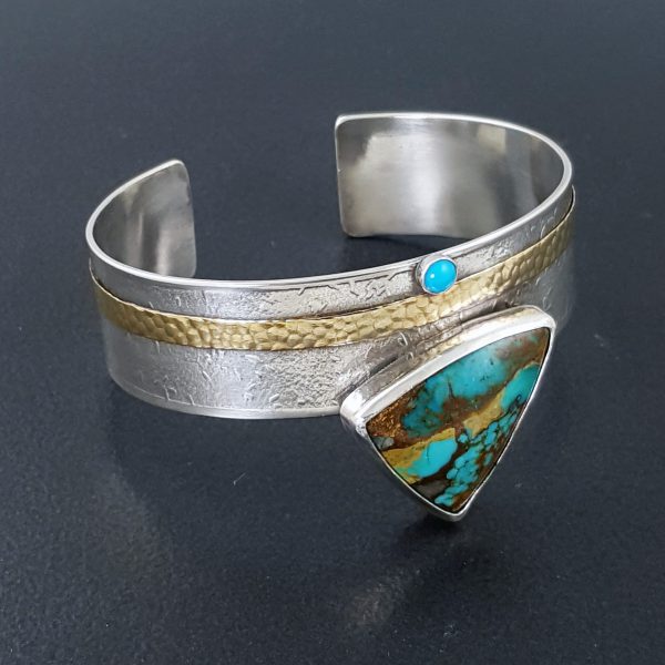 The larger stone is turquoise in bronze. It is a mix of both turquoise and bronze all rolled into one stone. The smaller stone is sleeping beauty turquoise. Sterling silver and brass make up the cuff itself. The cuff is 5/8″” wide and is adjustable and fits most wrist sizes.