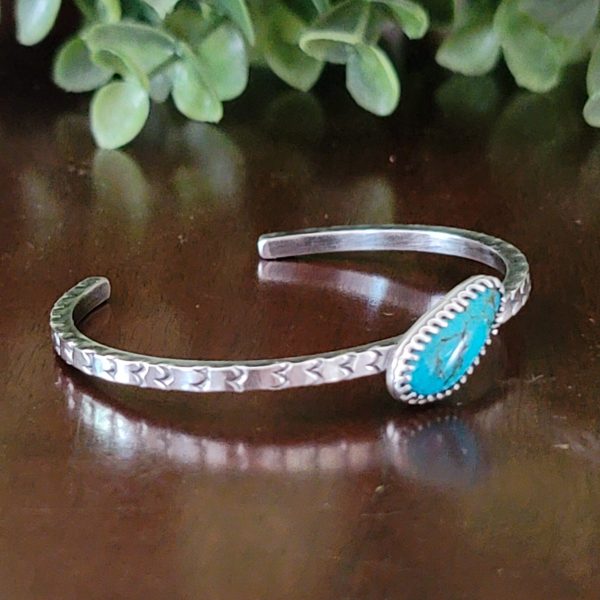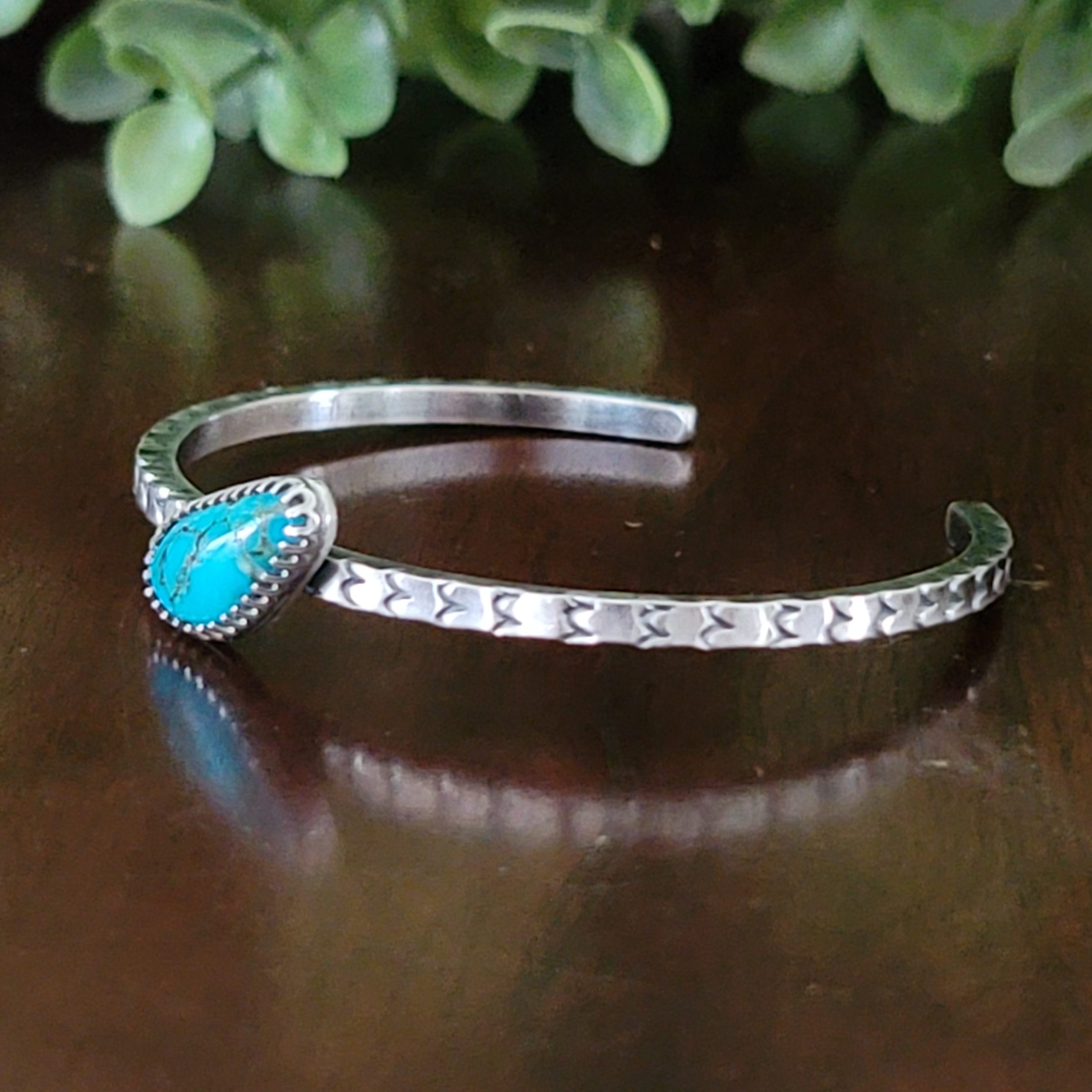 Turquoise combined with textured and oxidized sterling silver. This cuff fits a small/medium wrist and measures 5.5″ long with a 1″ opening. You can wear this cuff alone or stack it with other cuffs. This listing is for the stacking cuff in the first photo only. You will receive 1 bracelet. This item is one of a kind and ready to ship.