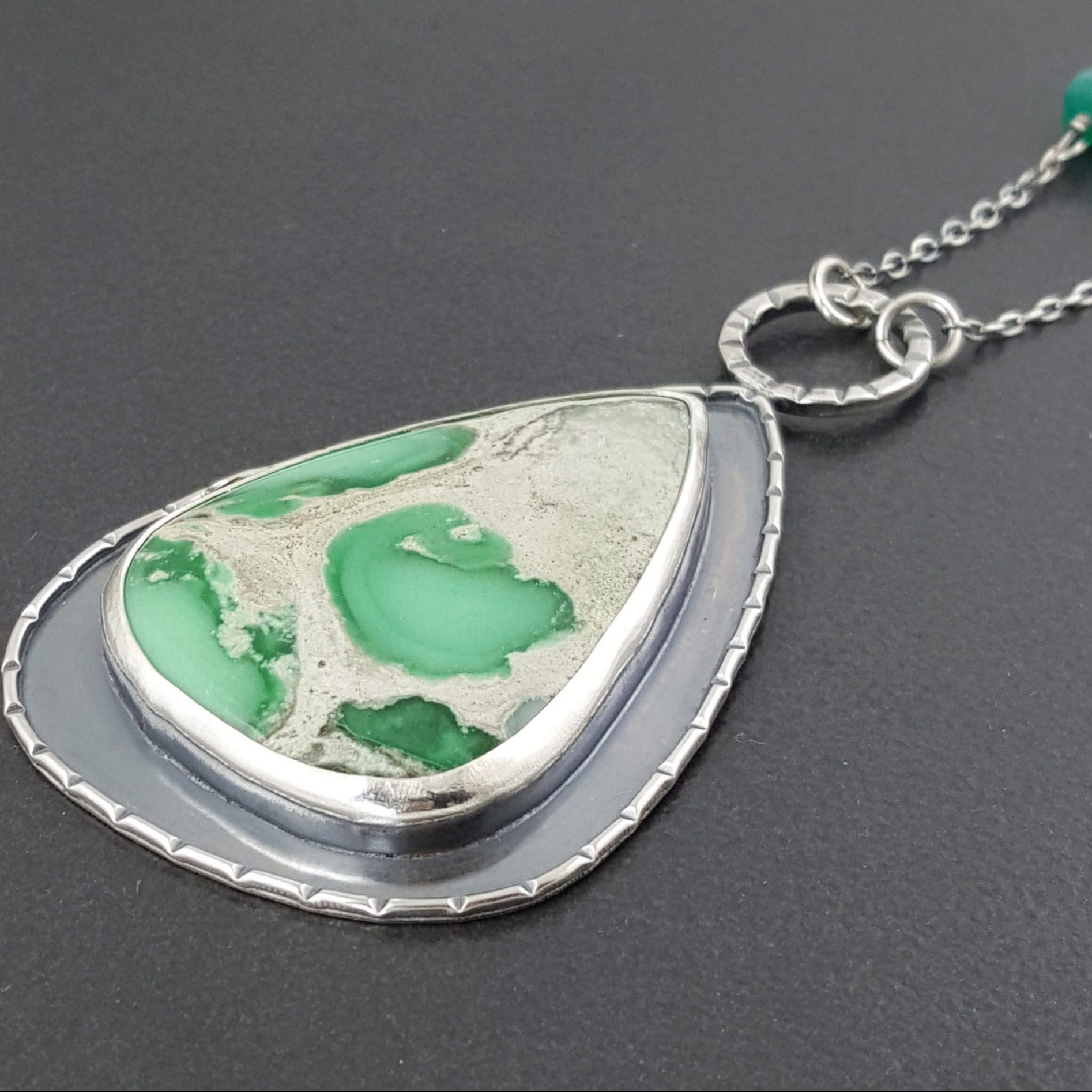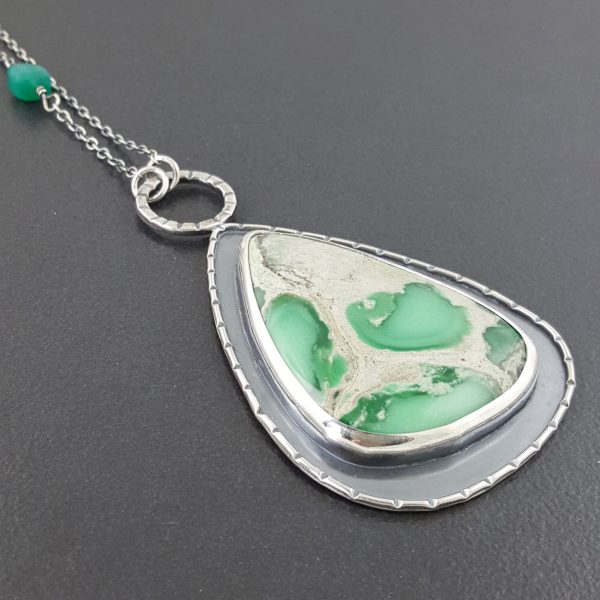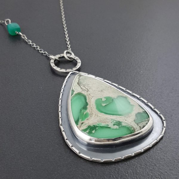 Variscite, green onyx and oxidized sterling silver create this piece. The pendant measures approx 3″ long by 1 .75″ wide and hangs from an adjustable 16-18″ sterling silver chain. This necklace is one of a kind and ready to ship.