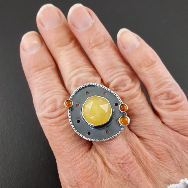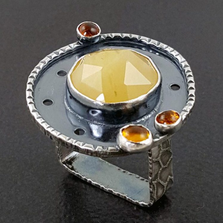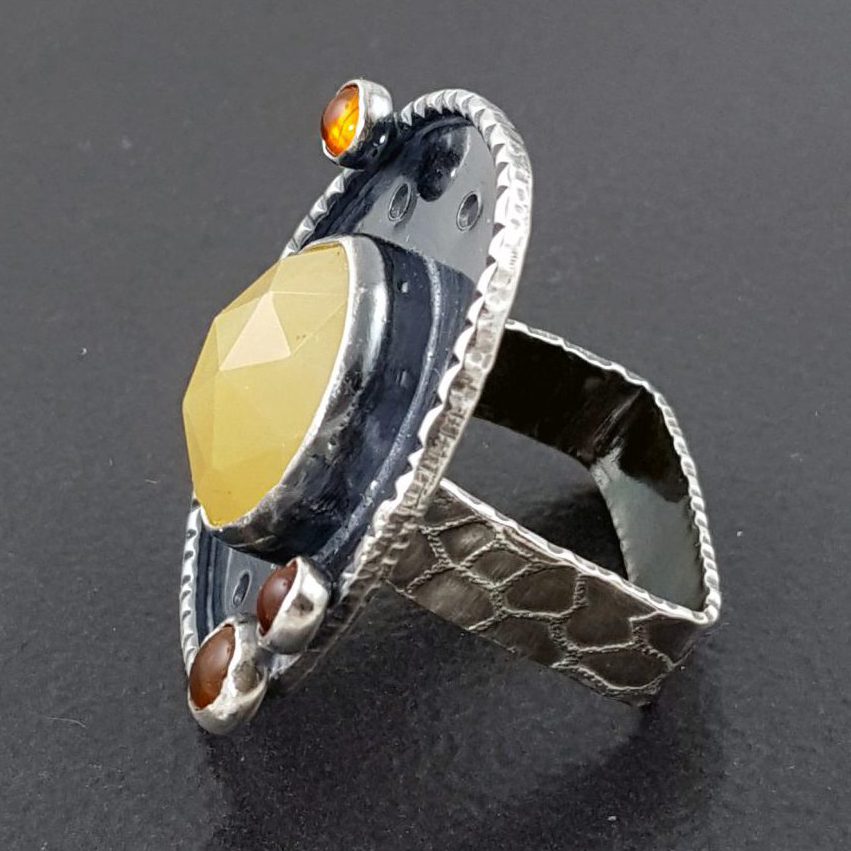 Yellow aventurine and amber are combined with oxidized sterling silver. The ring measures approx 1.25″ long by 1″ across at its widest points. This handmade ring fits a size 8.5 thru a size 9 finger due to the shape of the band. Square bands are not only very comfortable to wear but they also keep the ring from spinning on your finger. This ring is one of a kind and ready to ship.